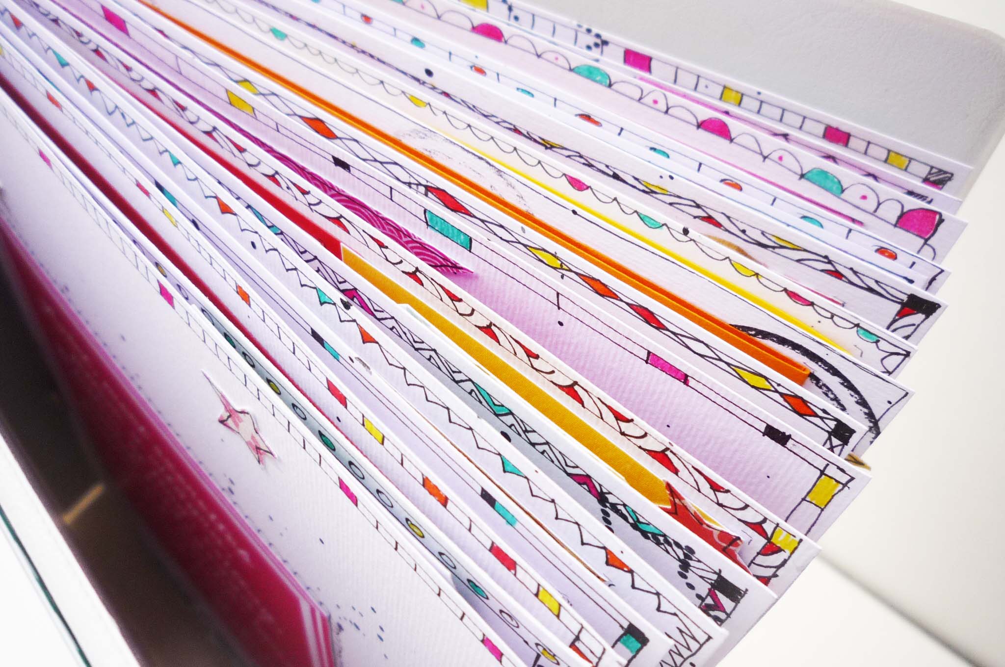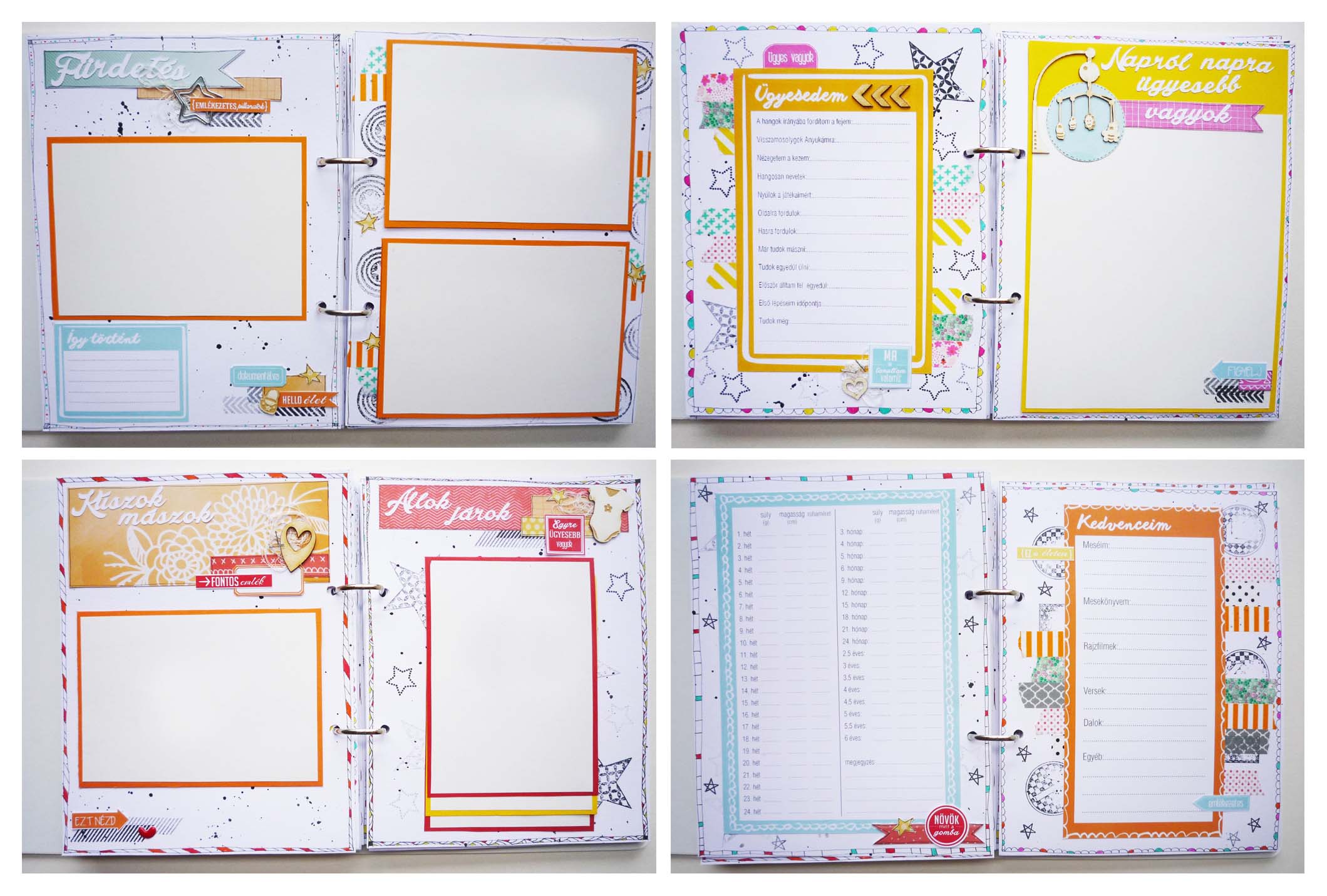 Az album alapja egy kis méretű gyűrűs mappa lett, amibe fehér lapokat szabtam, hogy a sok színes papír jól mutasson rajta. Sokat gondolkodtam az album stílusán, de mivel nem tudtam magamból kilépni, ezért minden oldalt fröcsköltem és doodliztem. A színes doodlie ötletét ezúton is köszönöm Veronak, ez igazán meseszerűvé varázsolta az egész albumot.
