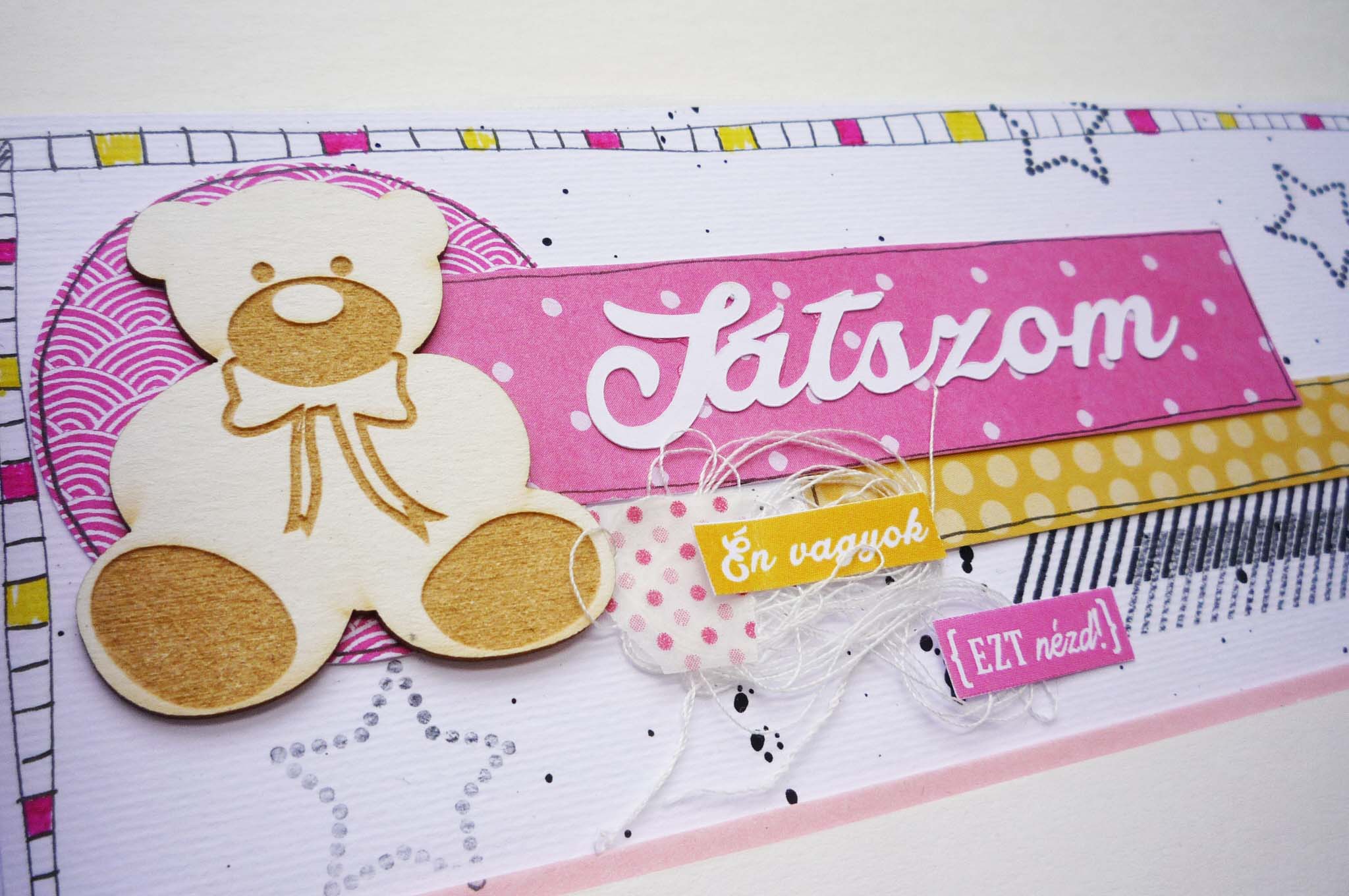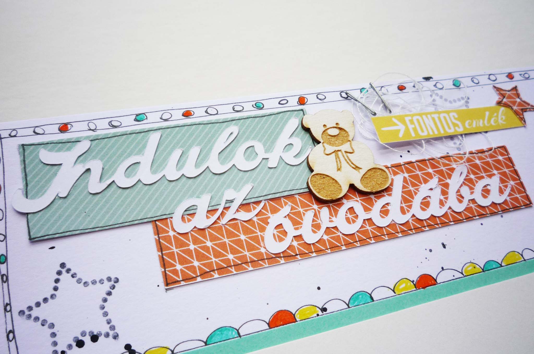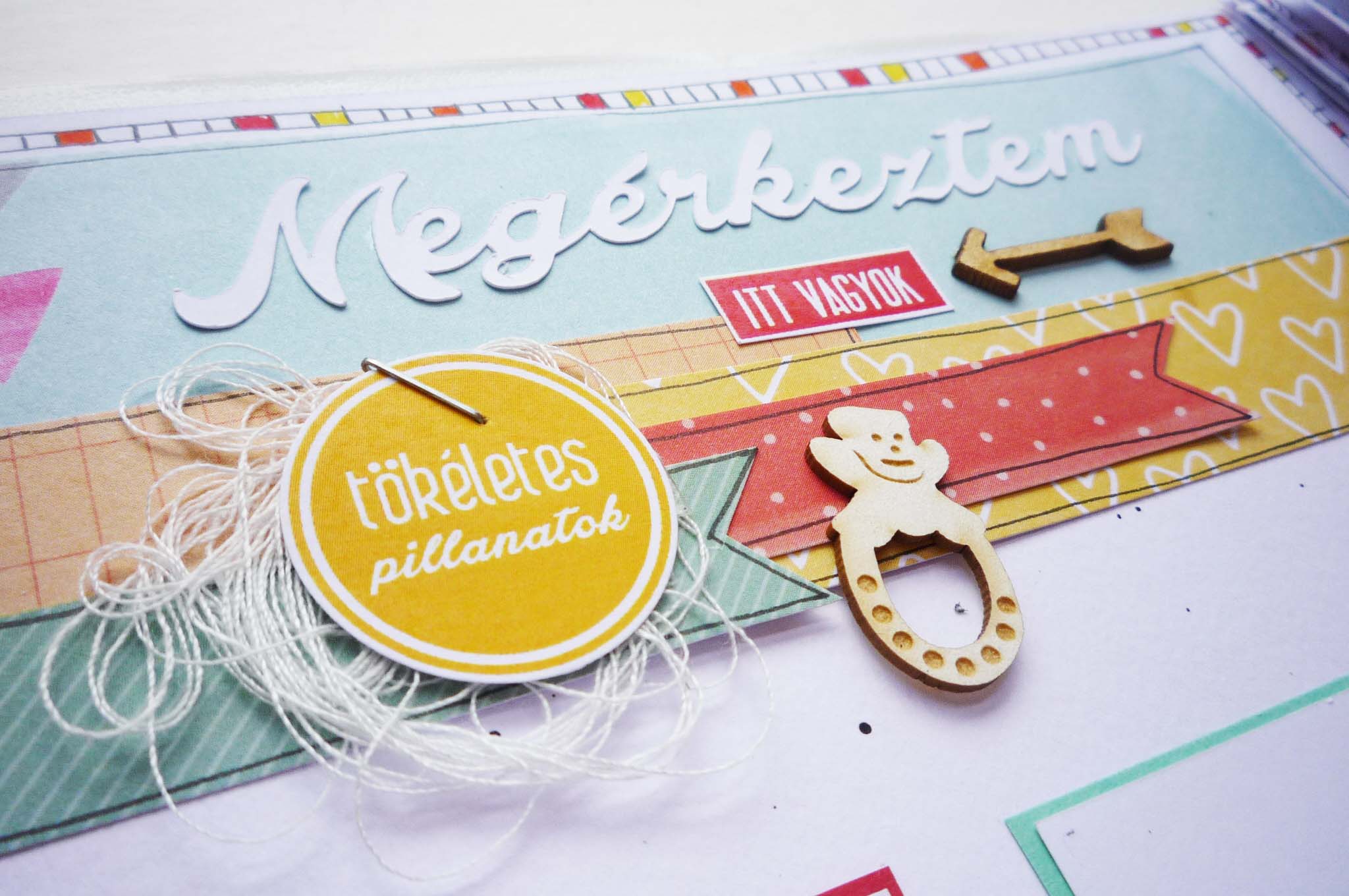 Az oldalakon a fröcskölésen és a doodlie-n kívül visszatérő elemek a bélyegzők, washitape-ek a papír fecnik, a cérnák, a NCsD chipboardok, amik nagyon jól feldobják az oldalakat. A címfeliratokat Cameoval vágtam ki.