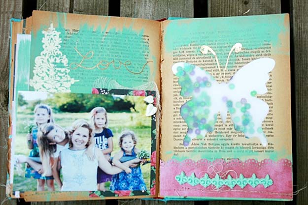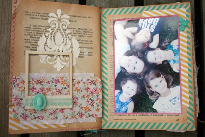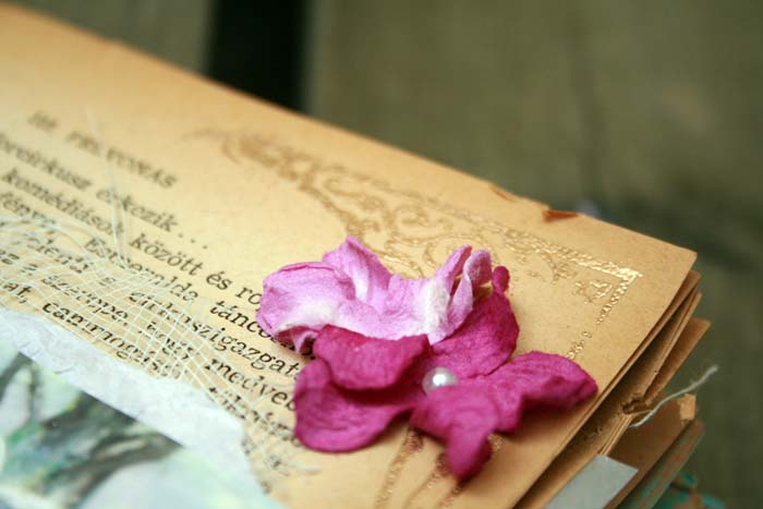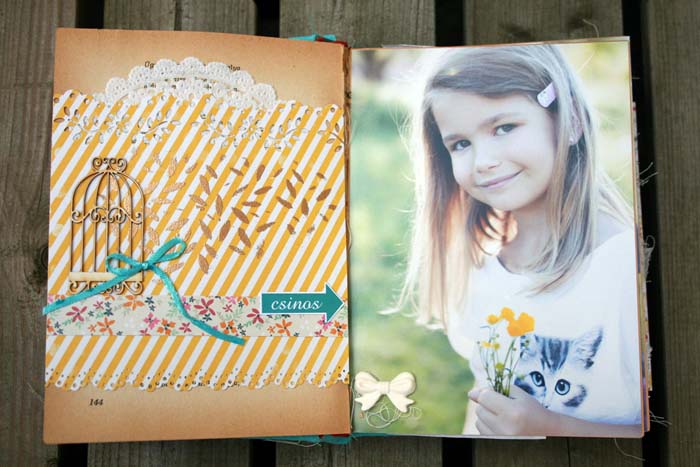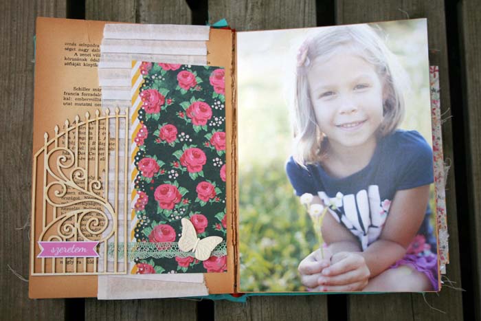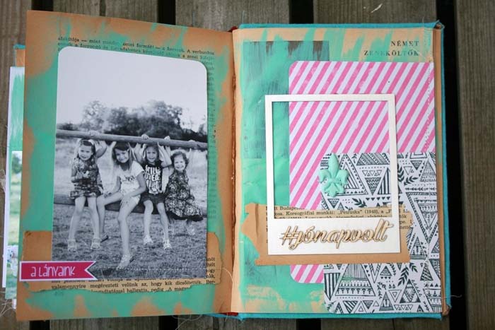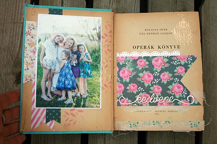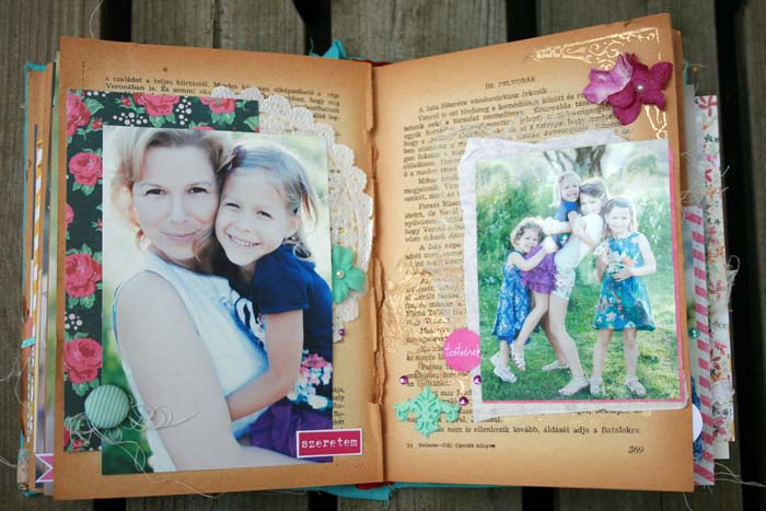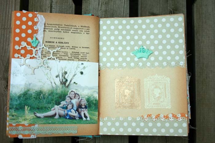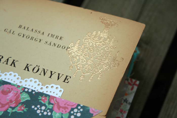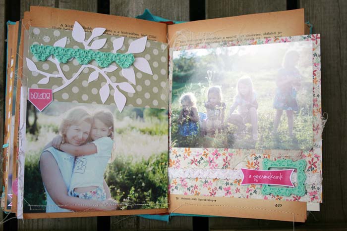 A scrap.hu által szervezett táborban Veka workshopja volt a kedvencem. 🙂 Tudom, hogy már sokan készítettetek régi könyvbe scrapbook albumot, de engem sosem fogott meg a projekt addig, amíg nem láttam Veka albumát.