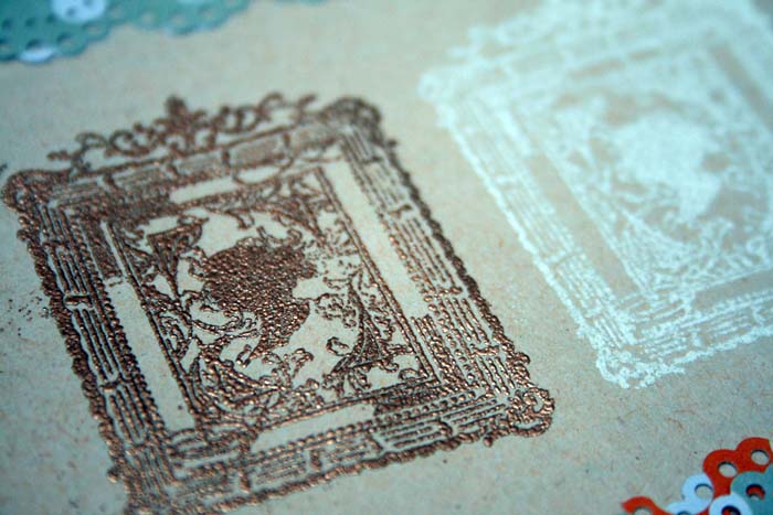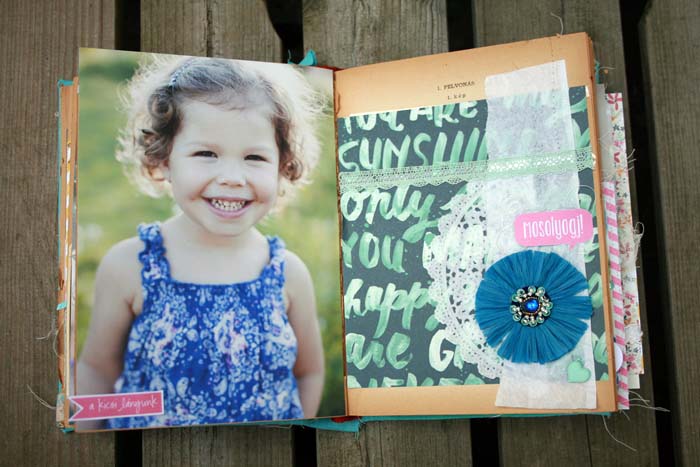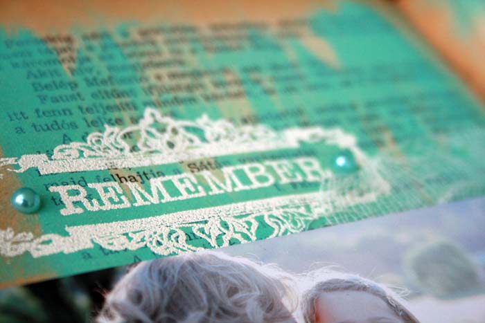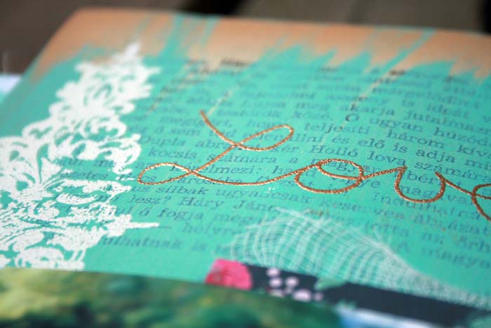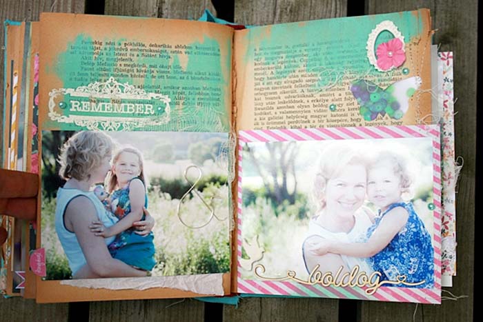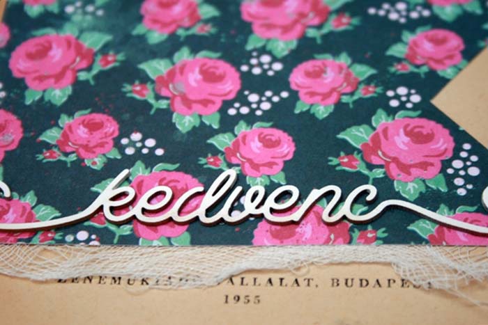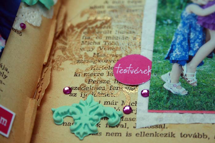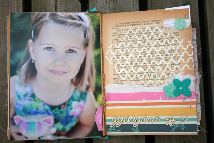 Sokat festettem (ezen a száraz papíron a festék pillanatok alatt szárad!), hődomborítottam, néhol struktúrpasztáztam, de igazából a gyönyörű papírkészletre építettem. Az élénk, soksíznű fényképeinket remekül kiemelte a We R memory – Inked Rose papírkészlete.
