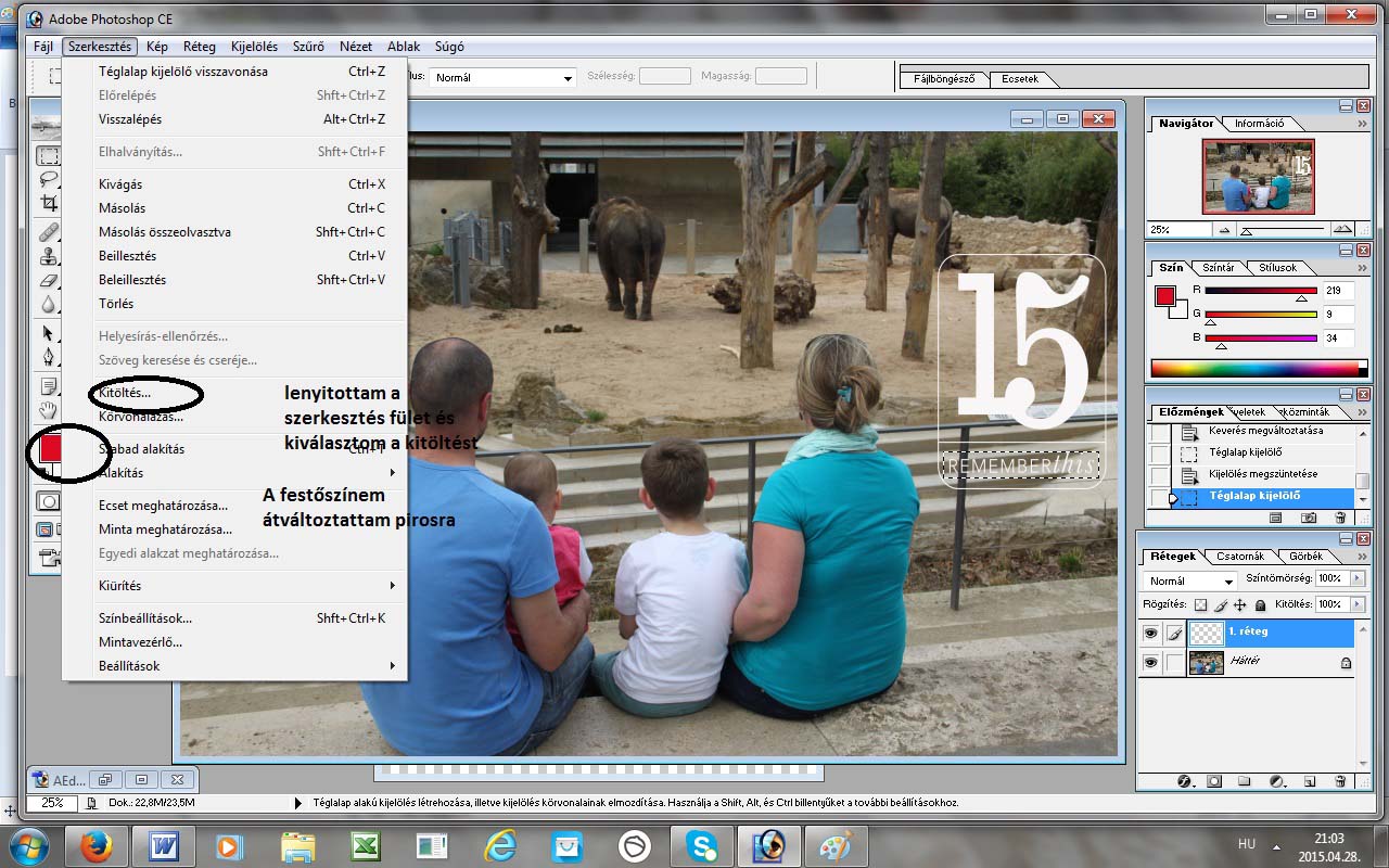 7. Változtasd meg a festőszínt. Nálam most a piros van felül. Nyisd le a szerkesztés fület és klikkelj a kitöltésre.