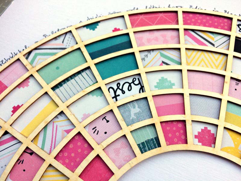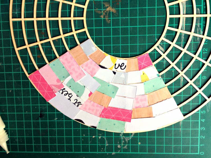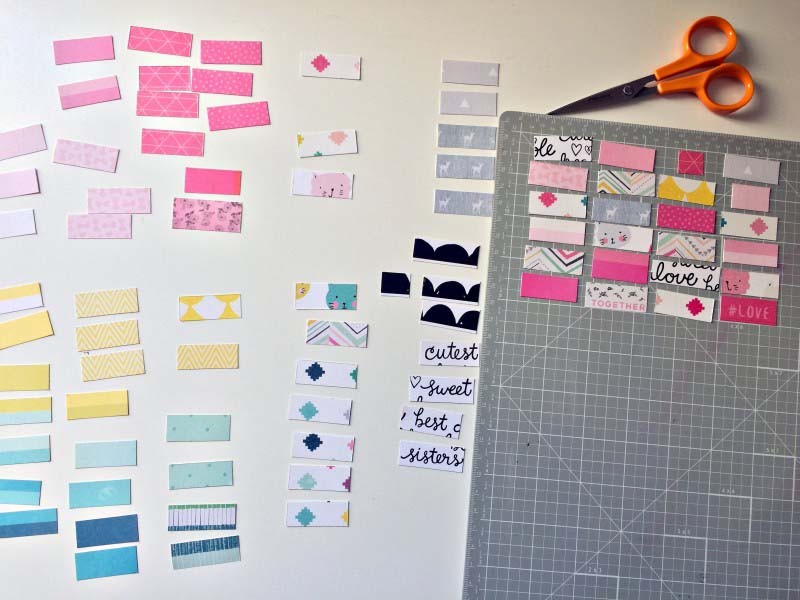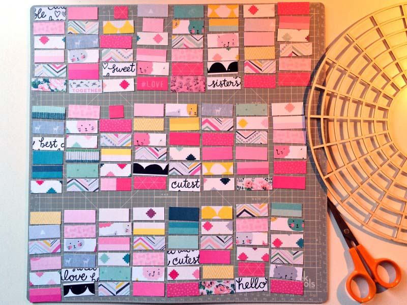 Én most a nagyobbik sugaras kört választottam e célból. Először kivágtam a 3,5×1,4 cm-es papírcsíkokat a Crate Paper Cute Girl és Bloom készletekből, összesen 24×6 db papírcsíkra volt szükségem.