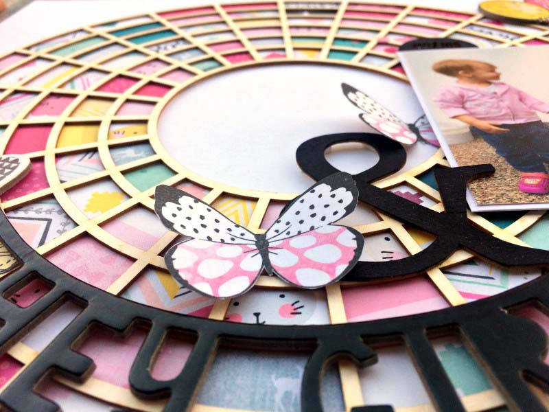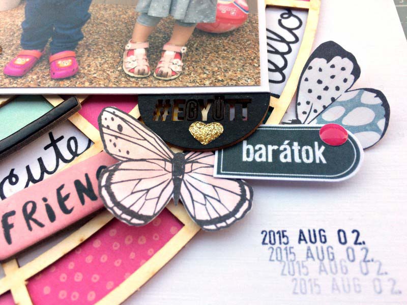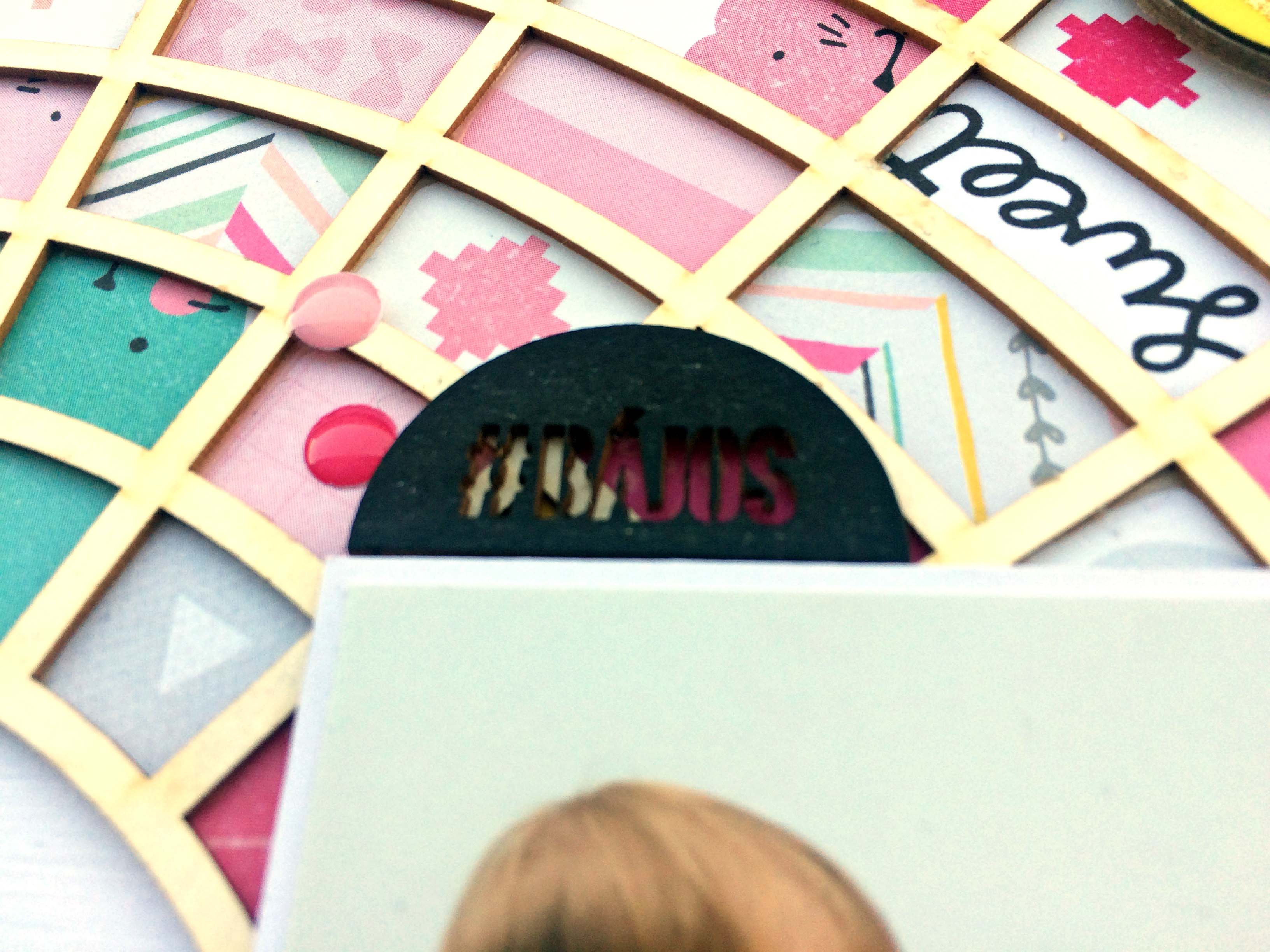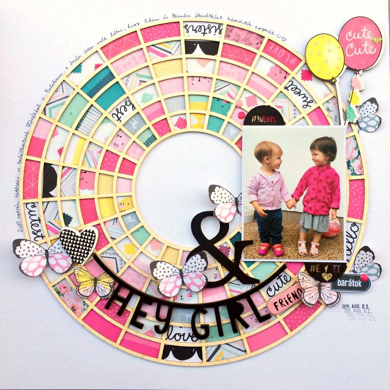 Mikor elkészültem a körrel, kétoldalassal felragasztottam egy fehér alapkartonra, és jöhetett a fénykép és a díszítés. Nagy örömömre a Hey Girl felirat pont ugyanúgy hajlik, mint a keret, így ez lett a címfelirat. Imádom az új & chipboardokat: mindenféle stílus megtalálható benne, így csak ki kellett választanom az ide illőt. Ezt és a félkörös chipiket is beszíneztem feketére StazOn-nal, hogy kiemelkedjenek az alapból. Még néhány díszítőelem, és kész is lettem. Íme:
