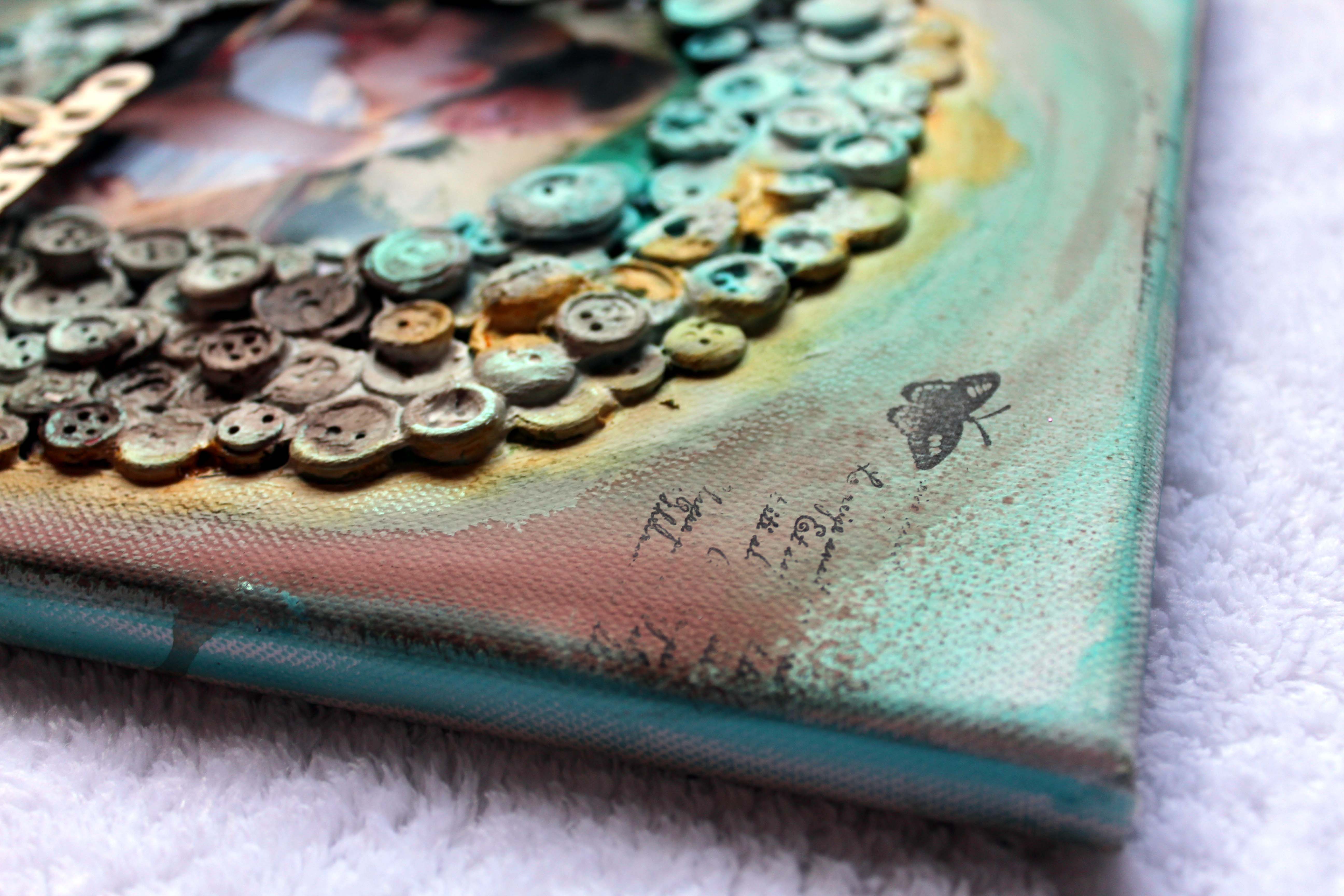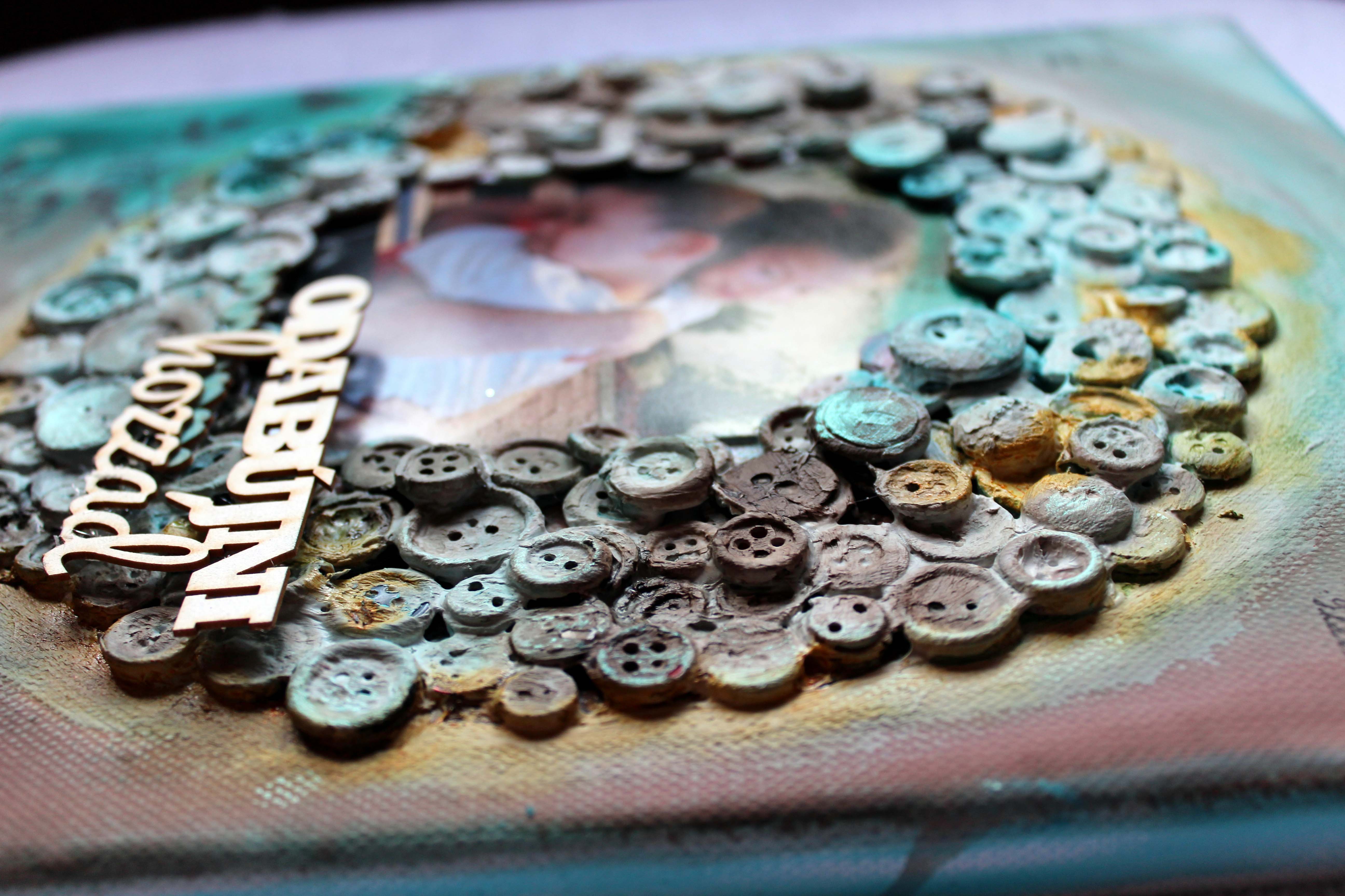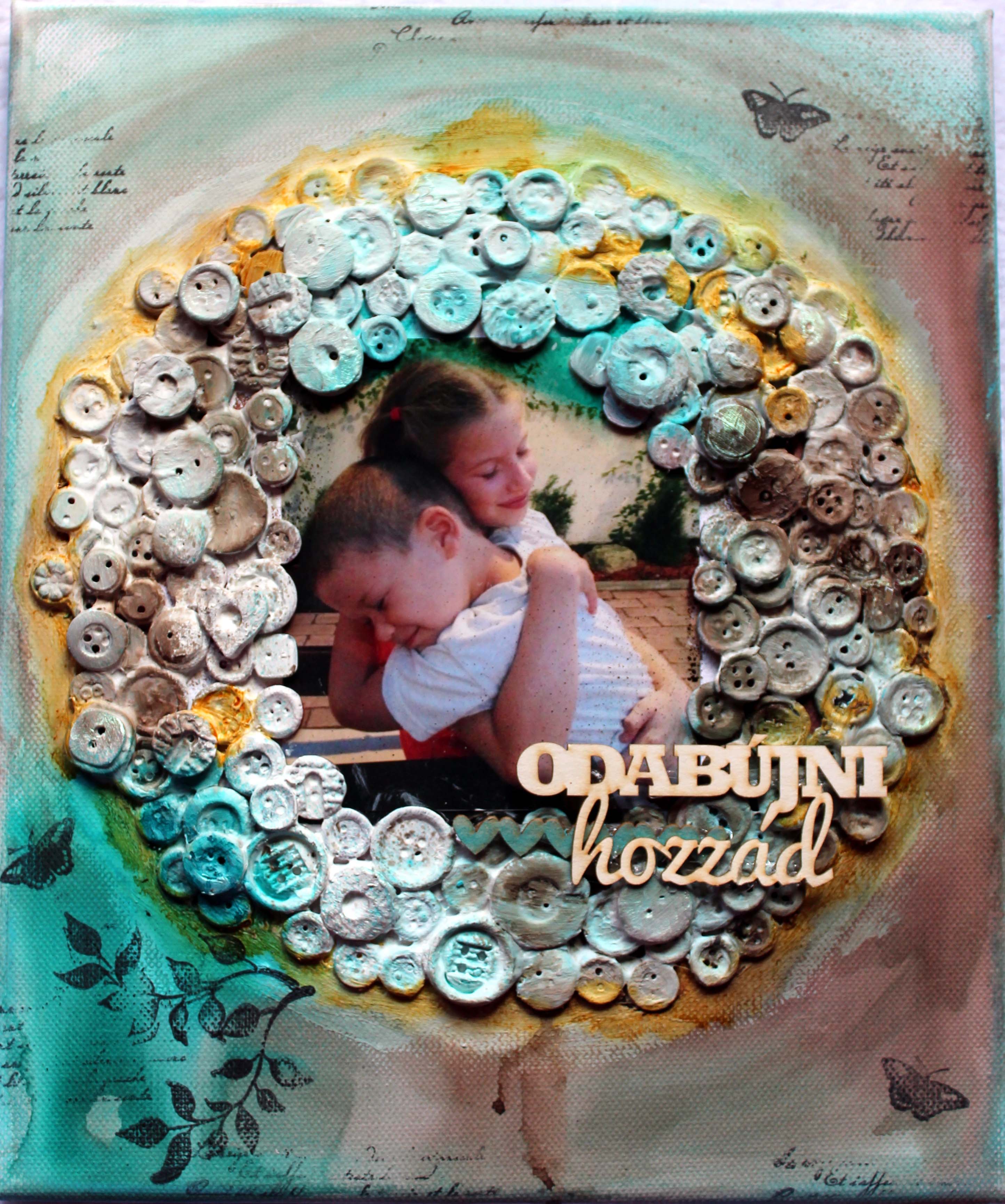"Mikor ezt a fotót megláttam, csak az ölelésre tudtam gondolni…egyre csak arra gondoltam, hogy az ölelésre a legjobb szimbólum egy kör…de miből legyen az a kör? 🙂 Kirakom gombokból! Mikor ezzel készen lettem, a többi már ment, mint a karikacsapás 🙂 "
