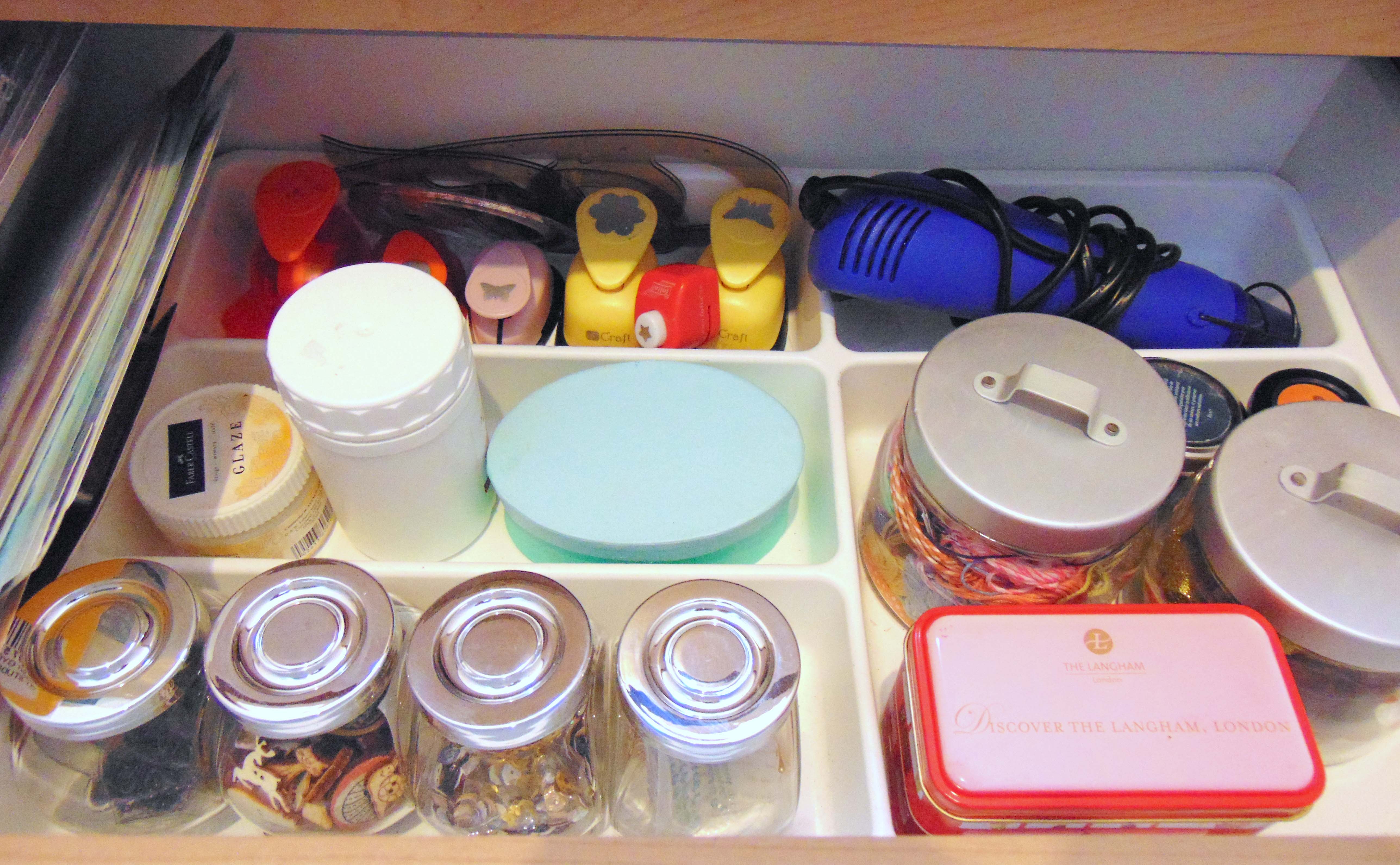 Nem nagyon szeretem, ha elöl vannak a dolgok, ezért választottam ezt a fiókos szekrényt, ami illik a konyhapultból megmaradt asztallaphoz, jó sok mindent elnyel, és legalább látszólagos a rend. Nem kaptunk olyan szekrényt ami pont passzol a szoba méretéhez, – nagy tragédia egy mérnök családban! – de a kis rés éppen kapóra jött, egy másik doboznak, amiben a vágóalátétet és a papírokat tartom. Eleinte színenként tároltam a papírokat, de aztán rájöttem, hogy nekem praktikusabb ha kollekciónként raktározni. Így, nem tudom mennyire látszik, oldalt van egy fehér, egy kraft és pár színes papírokat tartalmazó dosszié.