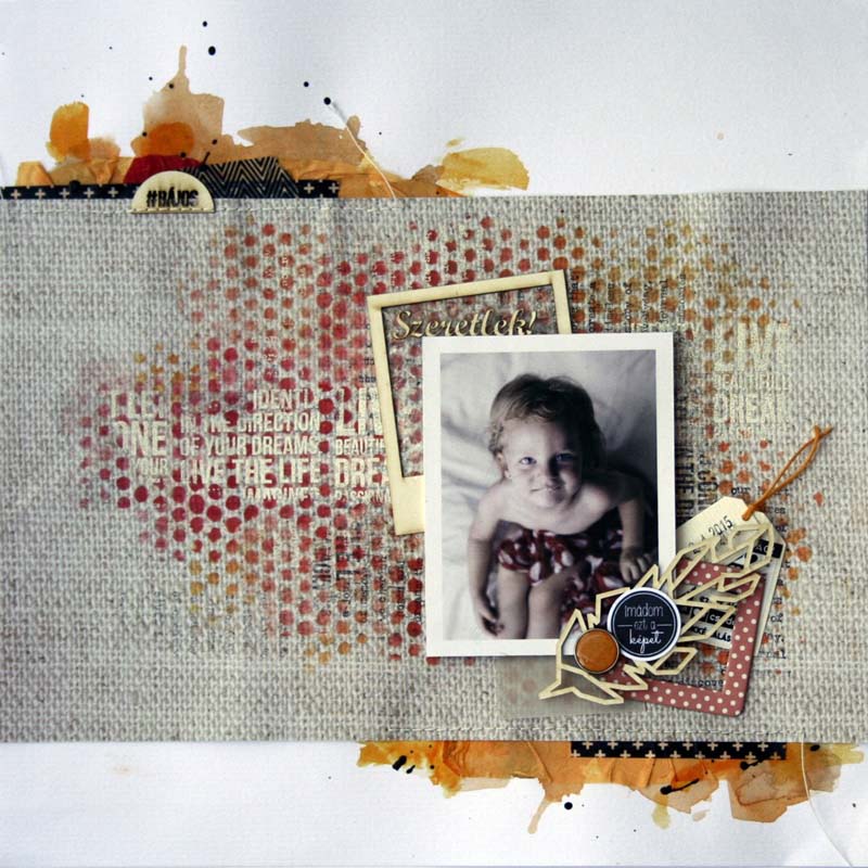 Fogtam egy pöttyös stencilt, és applikátor segítségével próbálgattam átmenetet tintázni. Tetszett az eredmény, ezért gyorsan kerestem hozzá egy fotót a meglévők közül. A kép érdekessége az, hogy Boróka lányom azzal a pöttyös kendővel pózol rajta, amit anno a babafotózáson is használtunk. Ez jól passzolt a pöttyös stenciles háttérhez, és a tinta színeihez is .