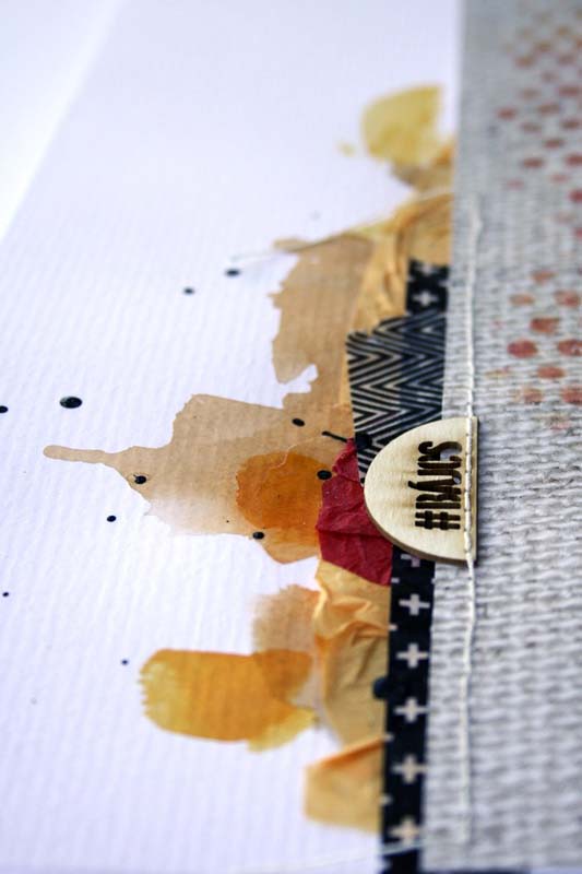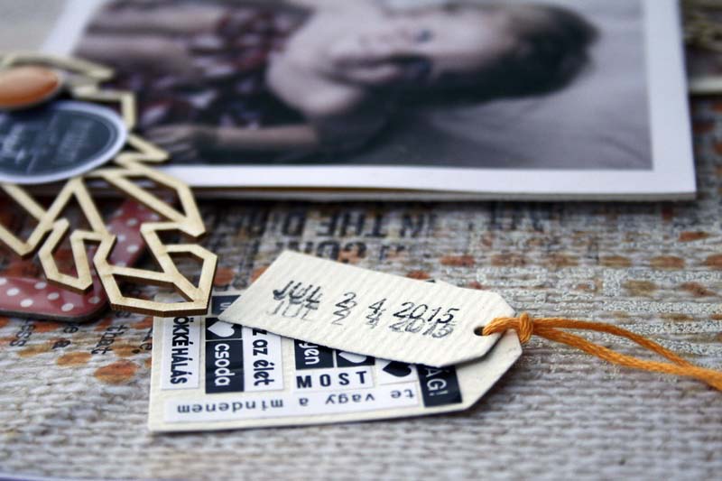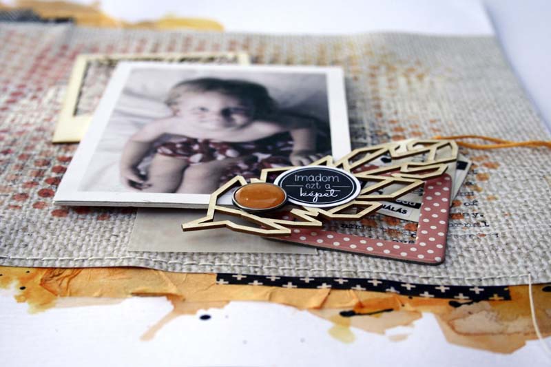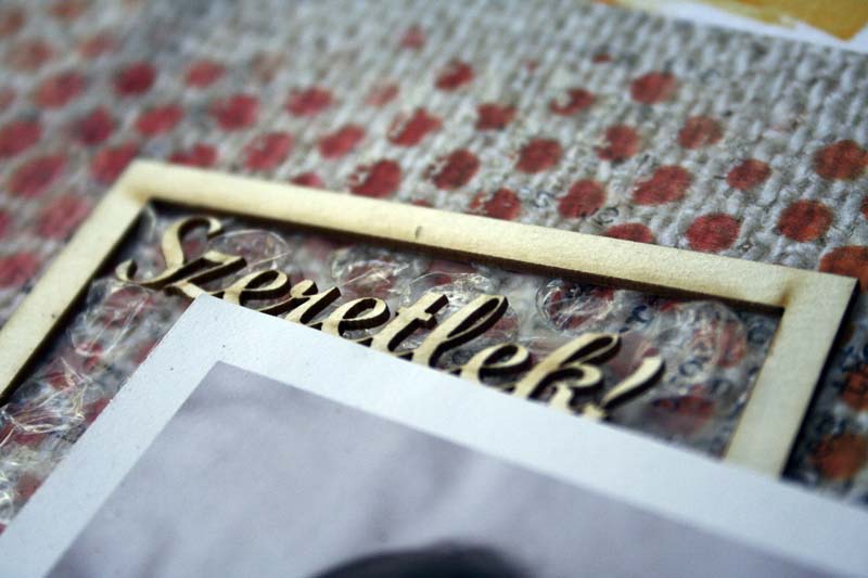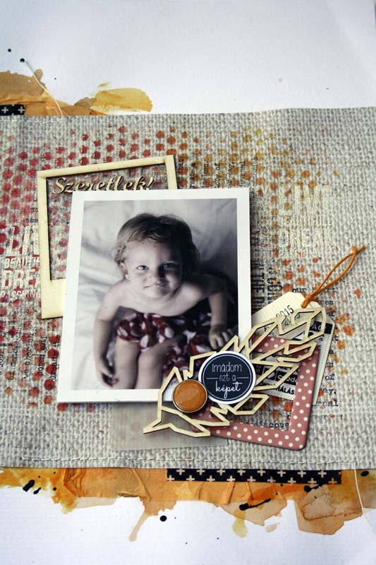 Nem szerettem volna egyszínű hátteret, így a választásom erre a zsákvászon mintásra esett. Először írásos bélyegzővel pecsételtem – direkt ilyen esetlegesen – majd fehér domborport égettem rá hőlégfúvóval. Erre ismét megcsináltam a szivacsos átmenetes tintázást a Desert Heat színű kombinációval. Az alapkartonra vízfestékkel pacáztam, majd selyempapírt és dekortapaszt tettem rá, aztán kétoldalúval rögzítettem a vászon mintás papírt. A fotóm alá vastagabb kartont ragasztottam. A polaroid keretbe bubis fóliát vágtam, és mikor a kép helye véglegessé vált, a ”szeretlek” feliratot a fóliára ragasztottam. A pöttyös keretet csak két oldalán ragasztóztam be, mert egy kis tag-et toltam alá, amire az új szöveges matricákból választottam párat.