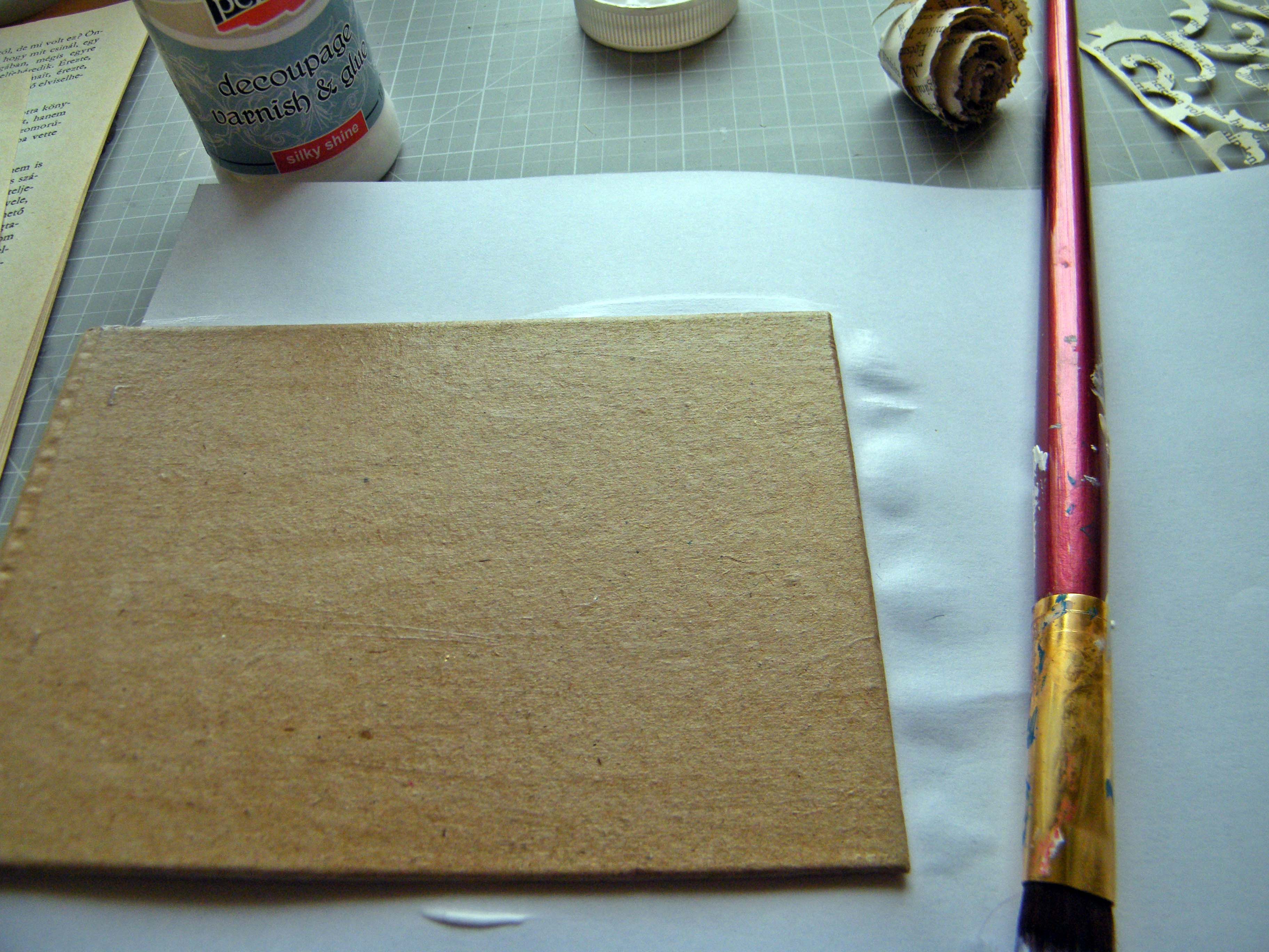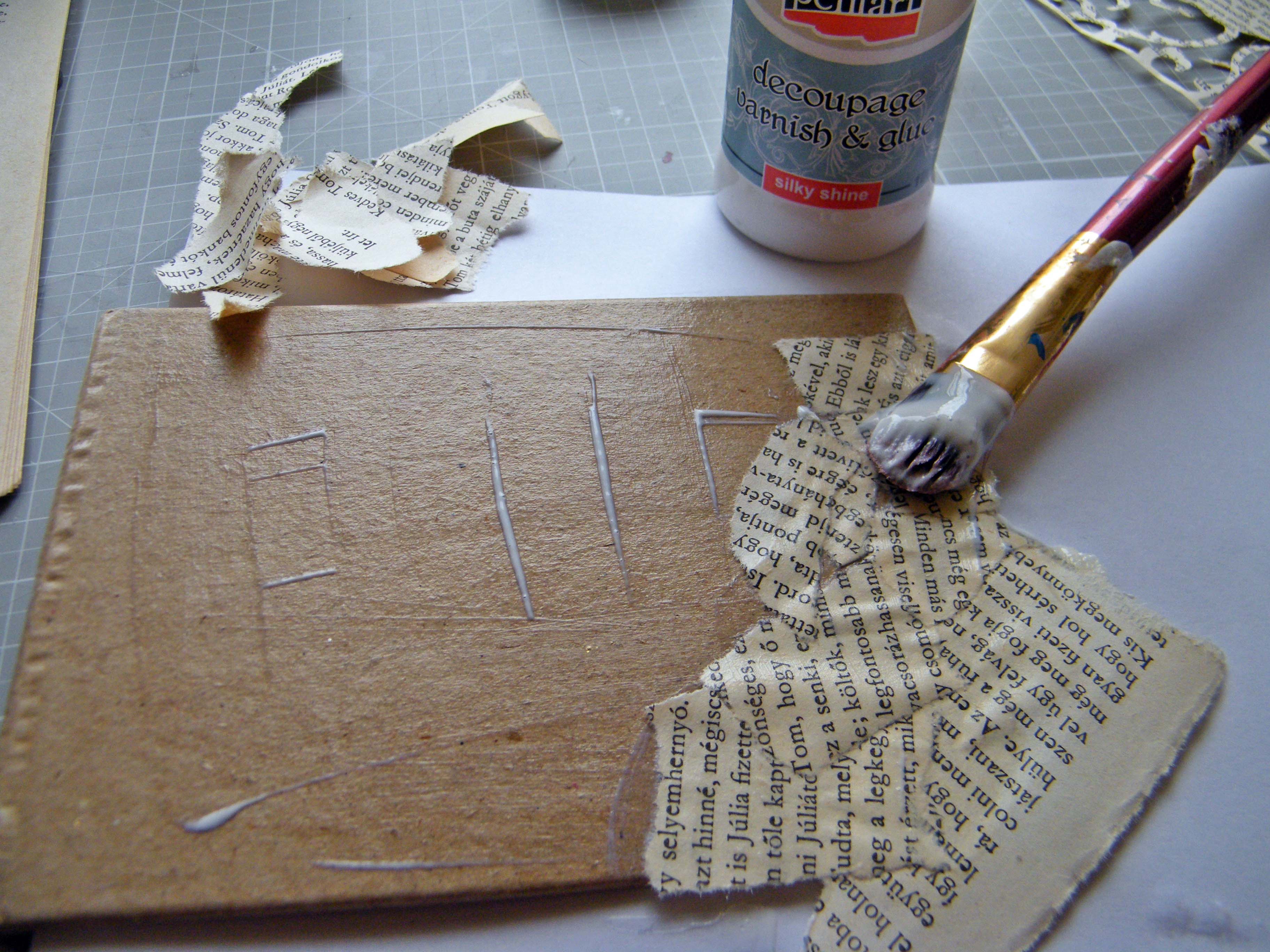 Fecnikre tépkedtem a könyvlapokat, majd dekupázs ragasztóval felragasztottam az albumra. Alatta-fölötte is kell ragasztózni, az a biztos – ugyanakkor örömmel jelzem, hogy az albumborítóm így egyben vízálló is lett, bár gondolom, ez egyáltalán nem követelmény. Hanem mellékhatás.