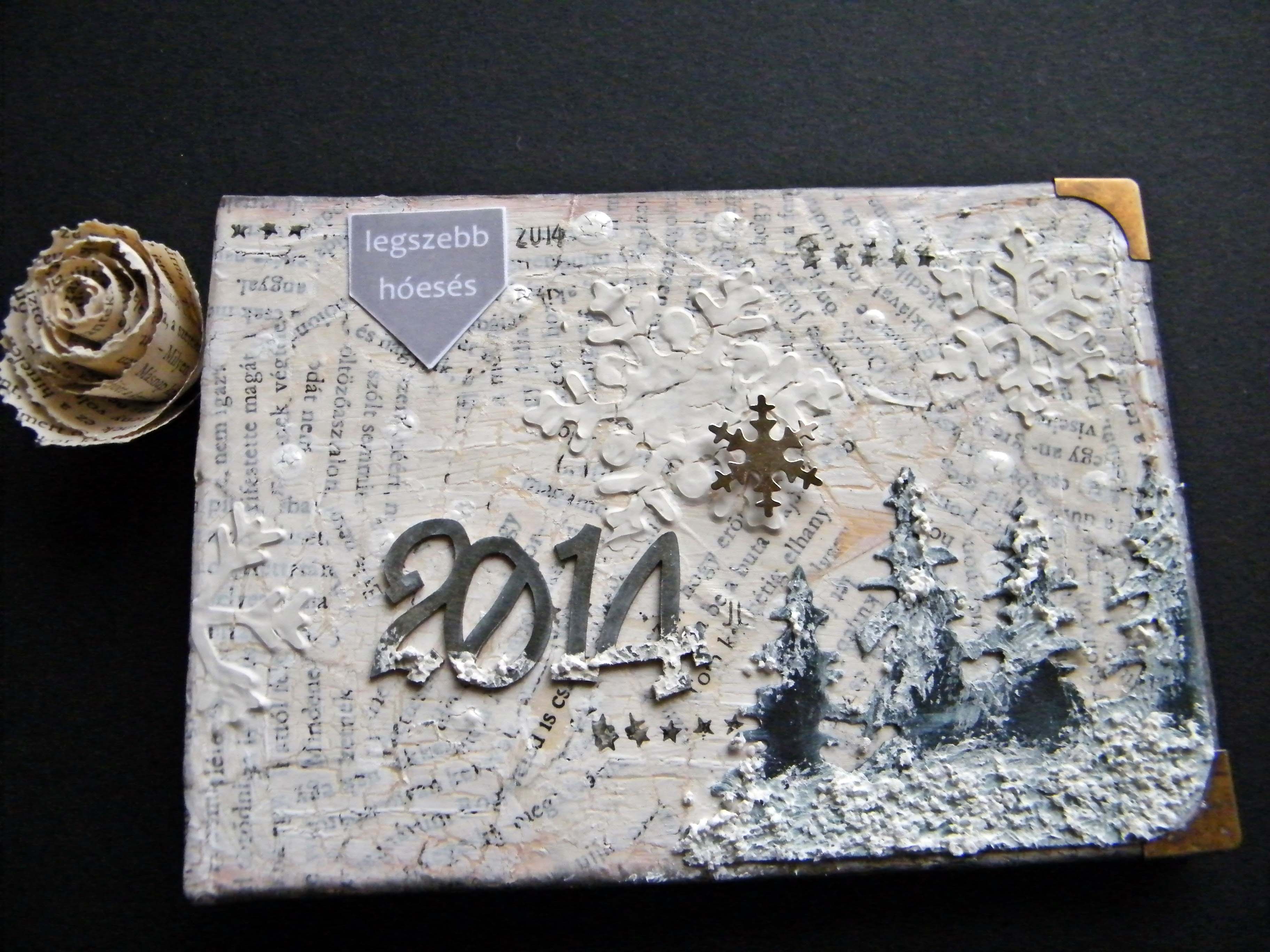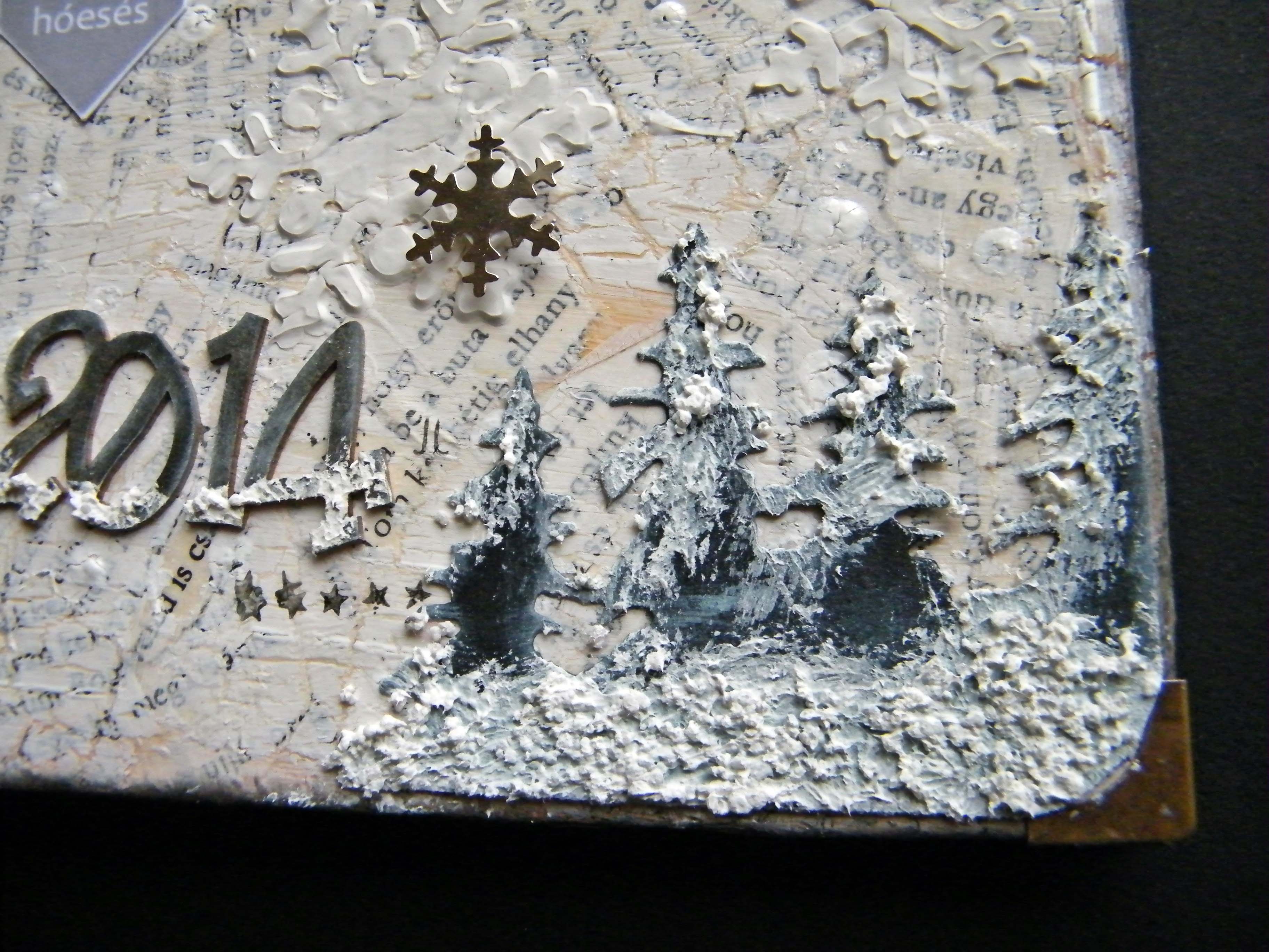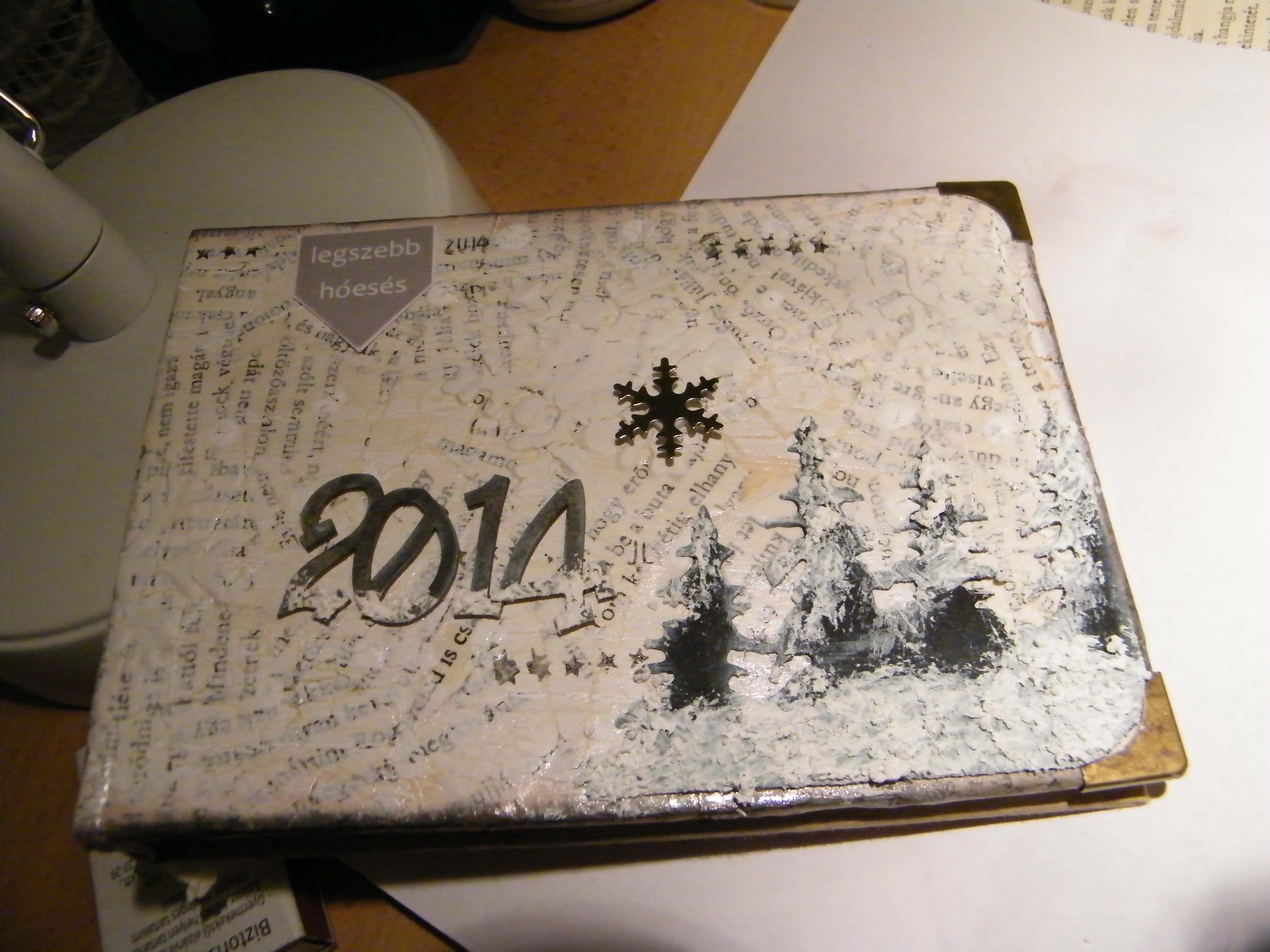 Ez után lefestettem fehér akrilfestékkel az egész borítót, majd repesztőlakkal, és száradás után ismét fehér akrilfestékkel, majd itt-ott pár hópihét is felkentem struktúrpasztával, sablon segítségével.