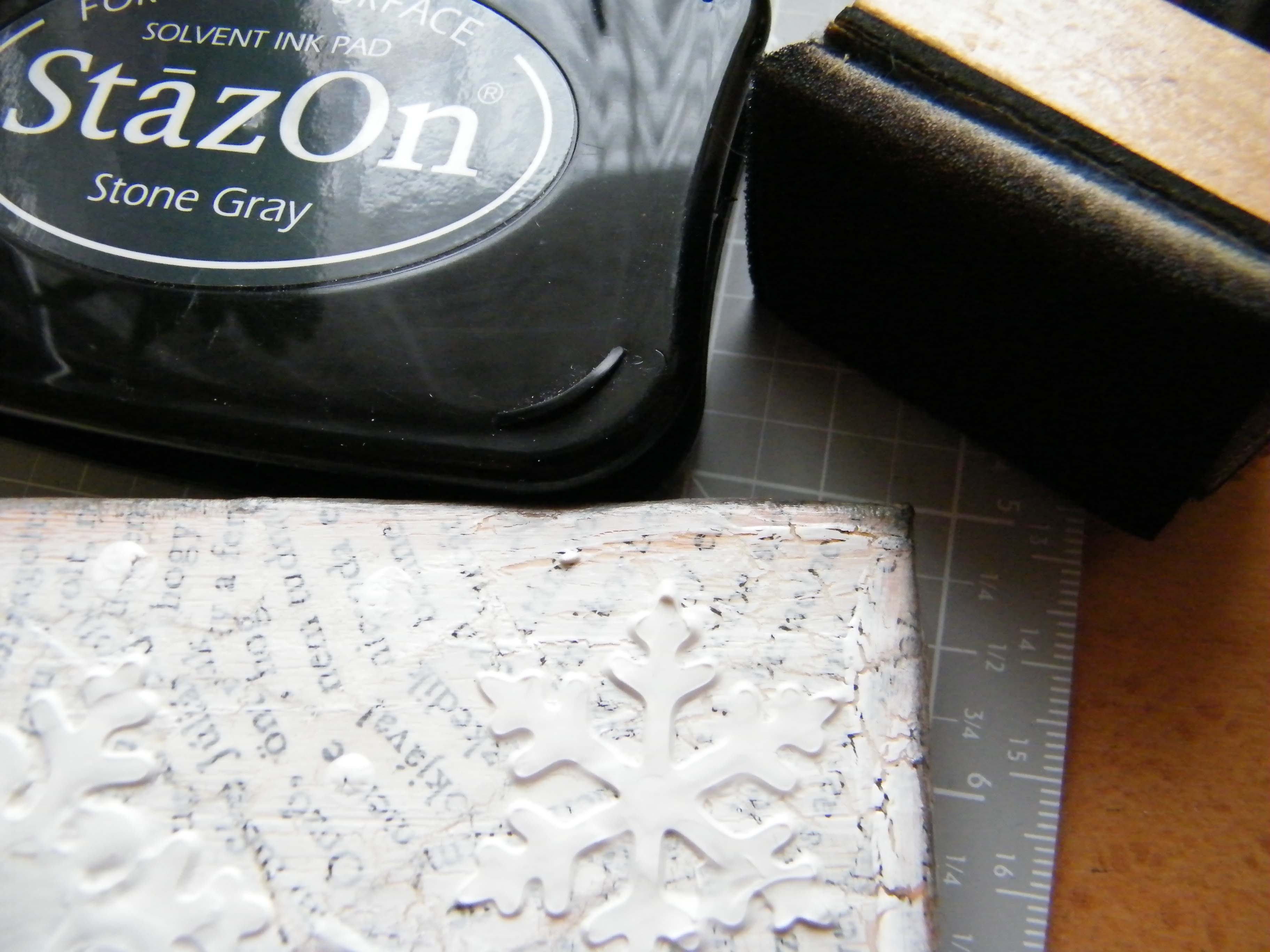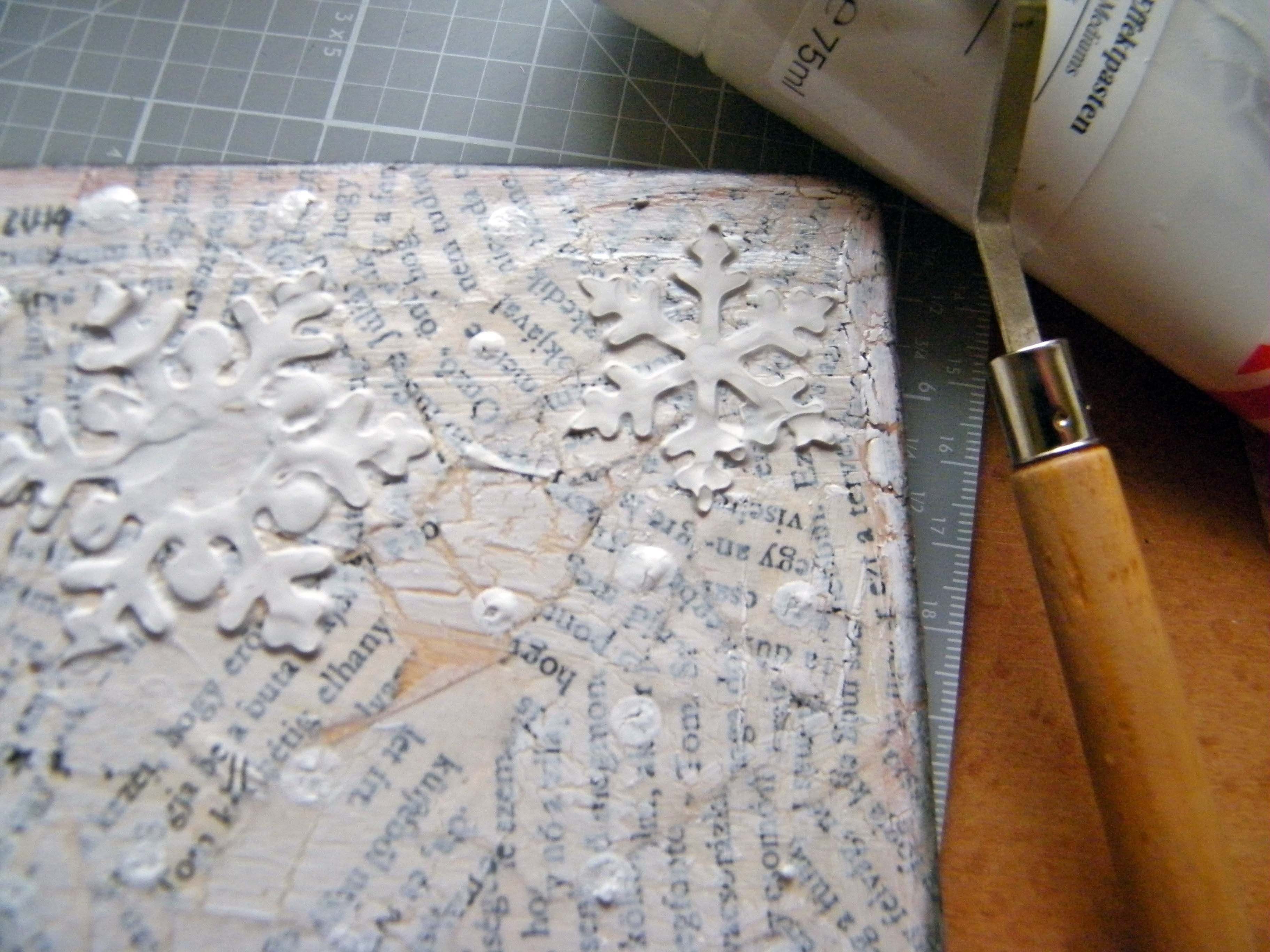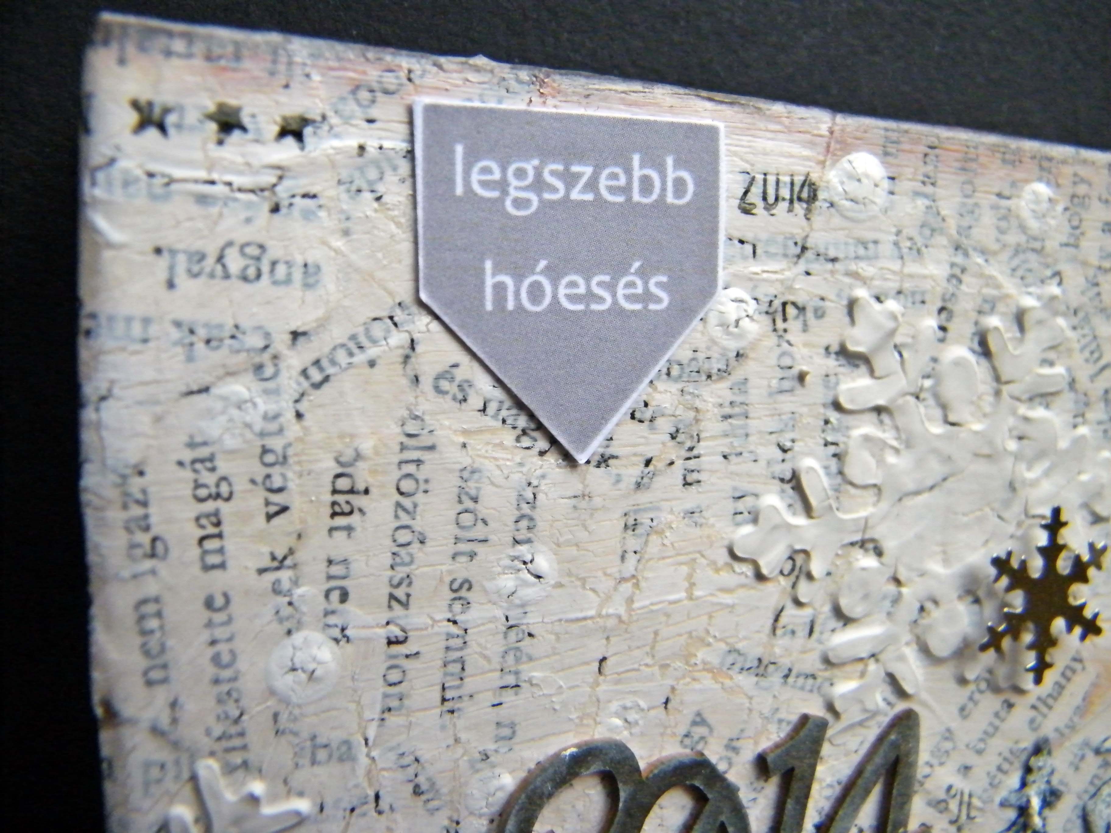 Ez után lefestettem fehér akrilfestékkel az egész borítót, majd repesztőlakkal, és száradás után ismét fehér akrilfestékkel, majd itt-ott pár hópihét is felkentem struktúrpasztával, sablon segítségével.