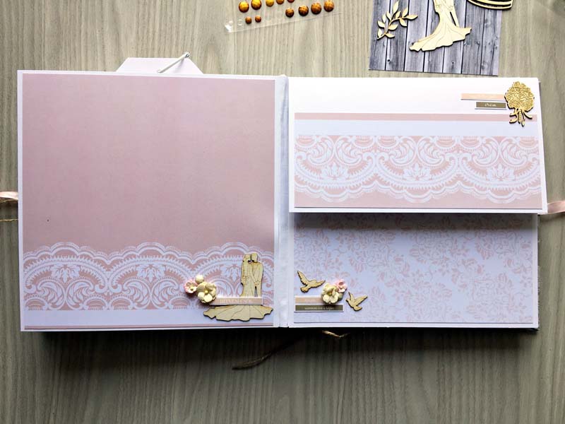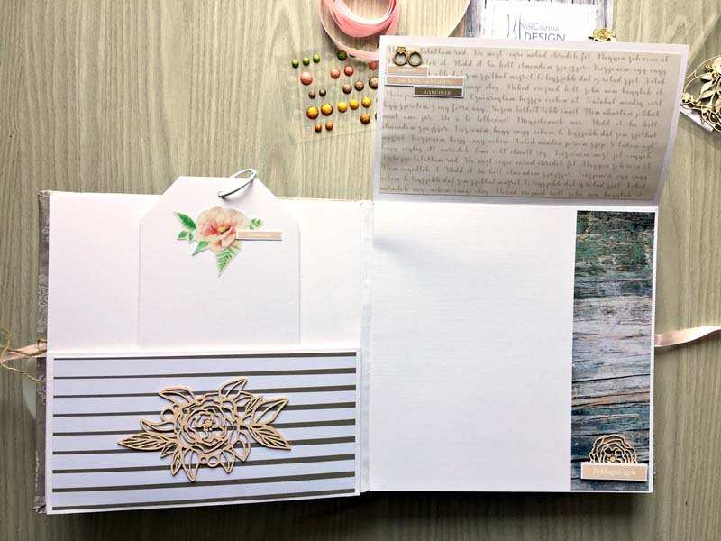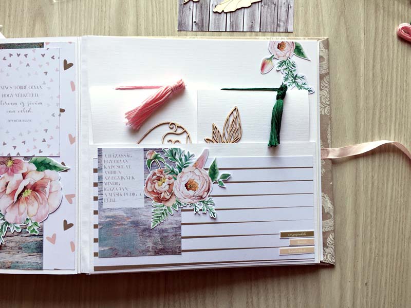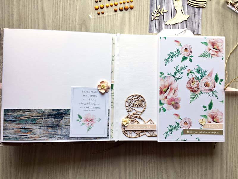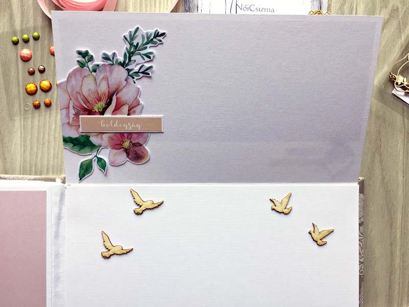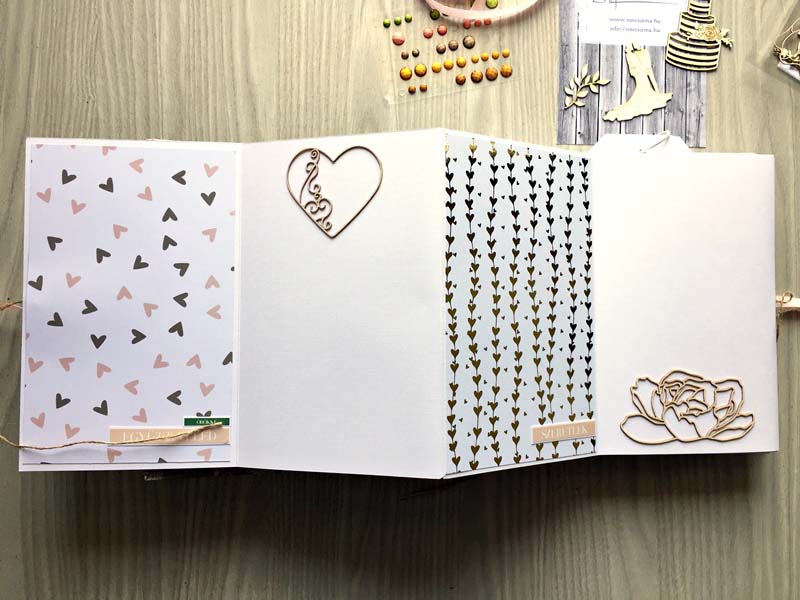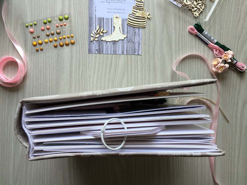 A chipboardokat halvány rózsaszín domborporral színeztem, kivéve azokat, amelyek gravírozottak voltak. Többféle kihajhatós, illetve harmonika oldalt készítettem, hogy a 12 oldalra sok fényképet lehessen pakolni. Valamint készítettem mini albumokat is, melyek egy-egy zsebben rejtőznek.
