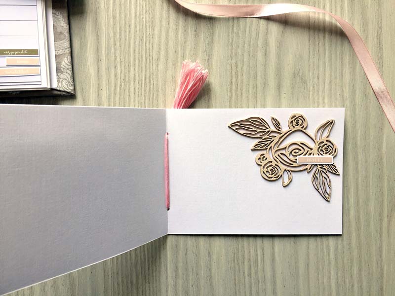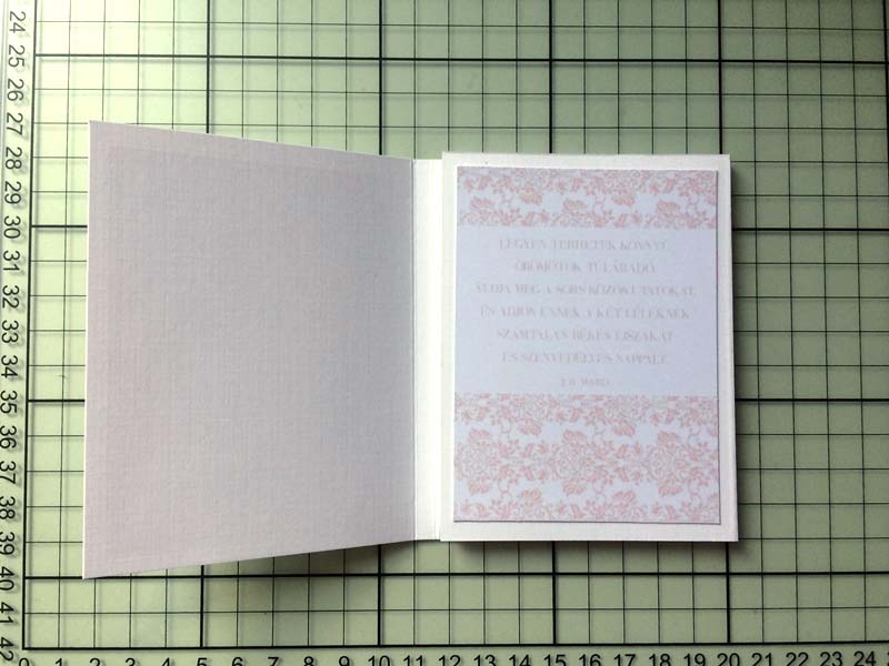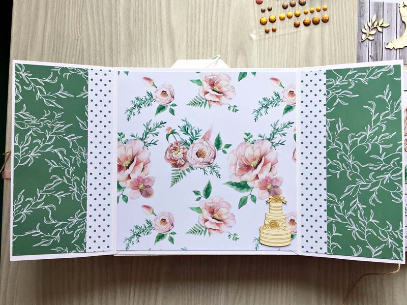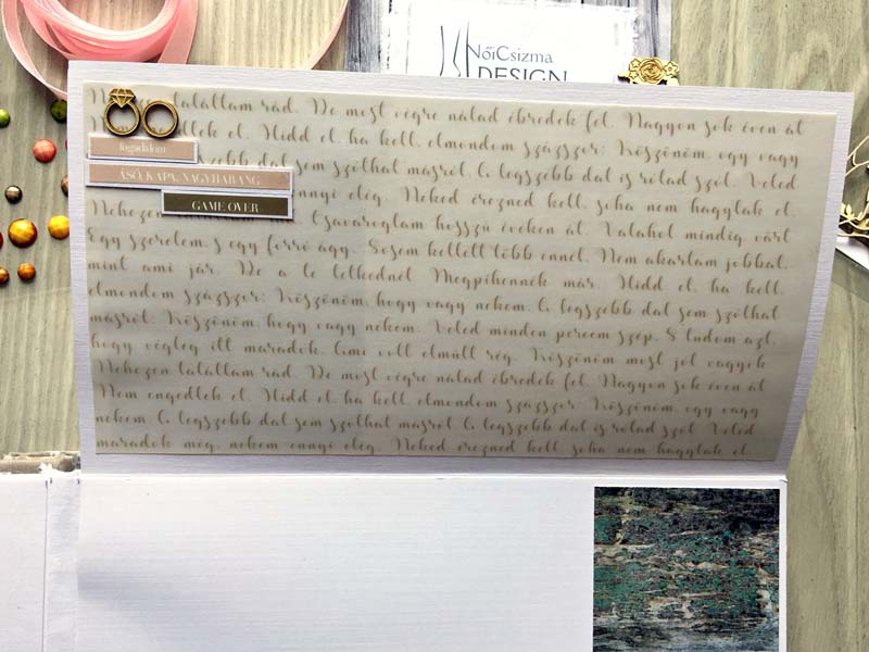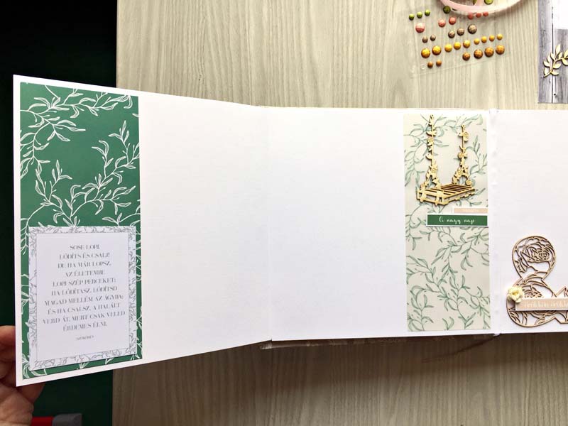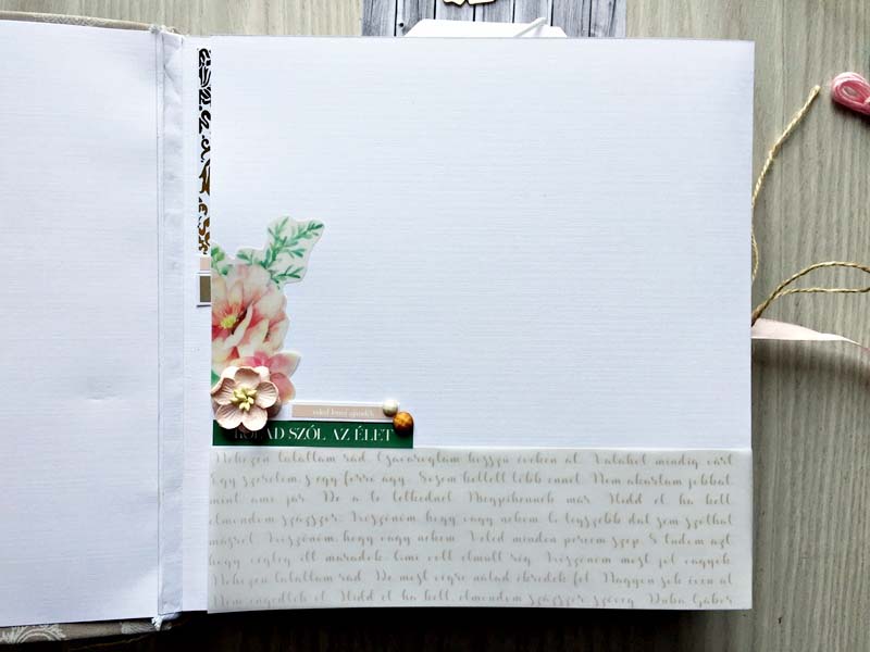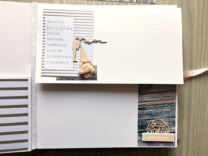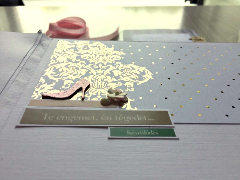 A chipboardokat halvány rózsaszín domborporral színeztem, kivéve azokat, amelyek gravírozottak voltak. Többféle kihajhatós, illetve harmonika oldalt készítettem, hogy a 12 oldalra sok fényképet lehessen pakolni. Valamint készítettem mini albumokat is, melyek egy-egy zsebben rejtőznek.