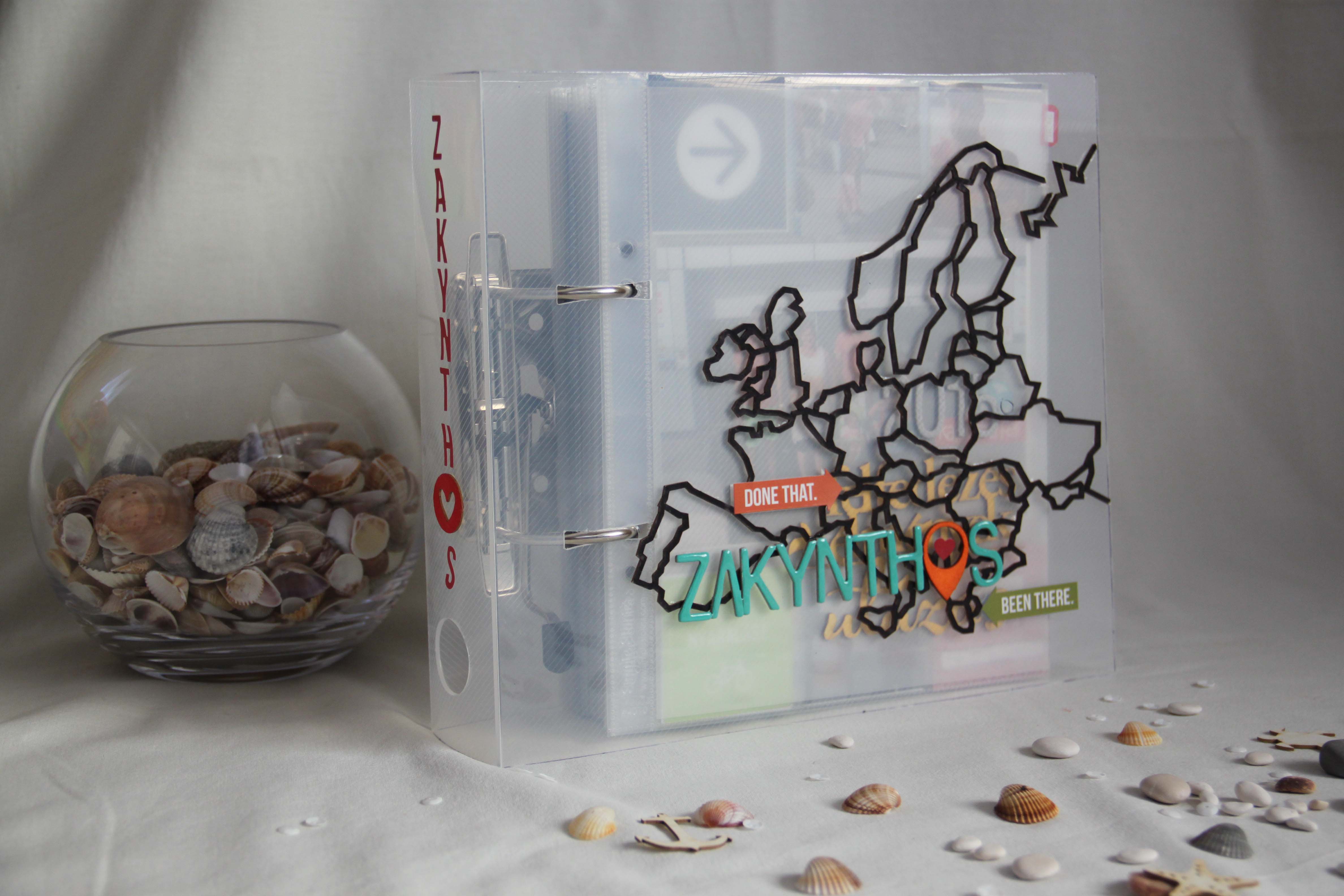 Amit már a kezdet kezdetén tudtam, hogy ez az album átlátszó lesz. Hát nem volt egyszerű az albumkeresés. Nem is találtam, csak A4es méretben olyat, aminek a gyűrűje 5mm -es volt. Így a nagy albumot a férjem A5ös méretre vágta. A borítón az Európa térképet lefestettem feketére, majd a betűket mentára és glossyztam. Az o betűt egy nyilacskával helyettesítettem ki, aminek a vége a szigetünkre mutat. Nagyobb díszítést nem is került a borítóra.