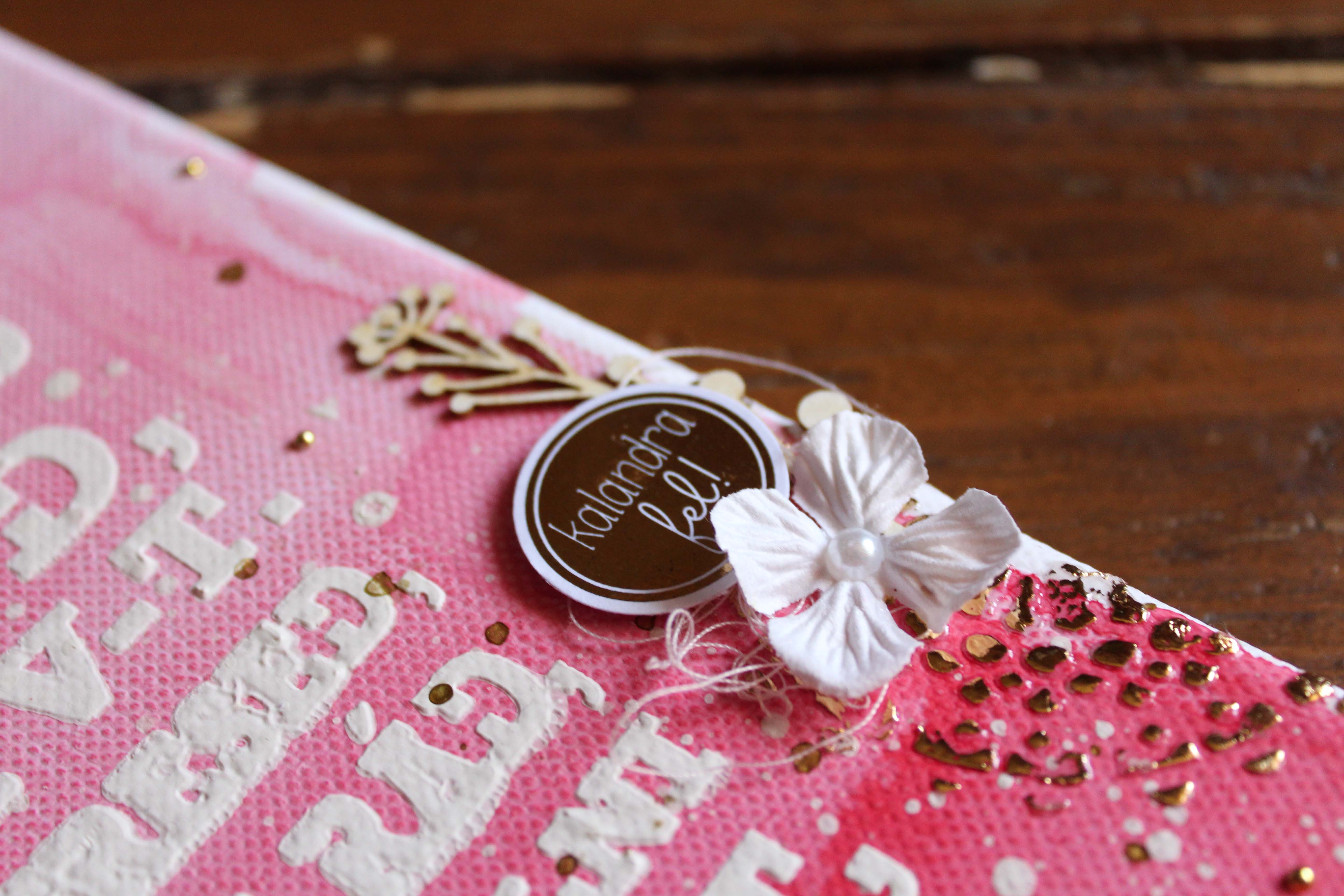 6. Jobb oldalt alul még hiányzott egy kis dekoráció, ezért bevettem az arany fóliázott címkémet, egy ágacskát, meg némi cérnát és virágot.