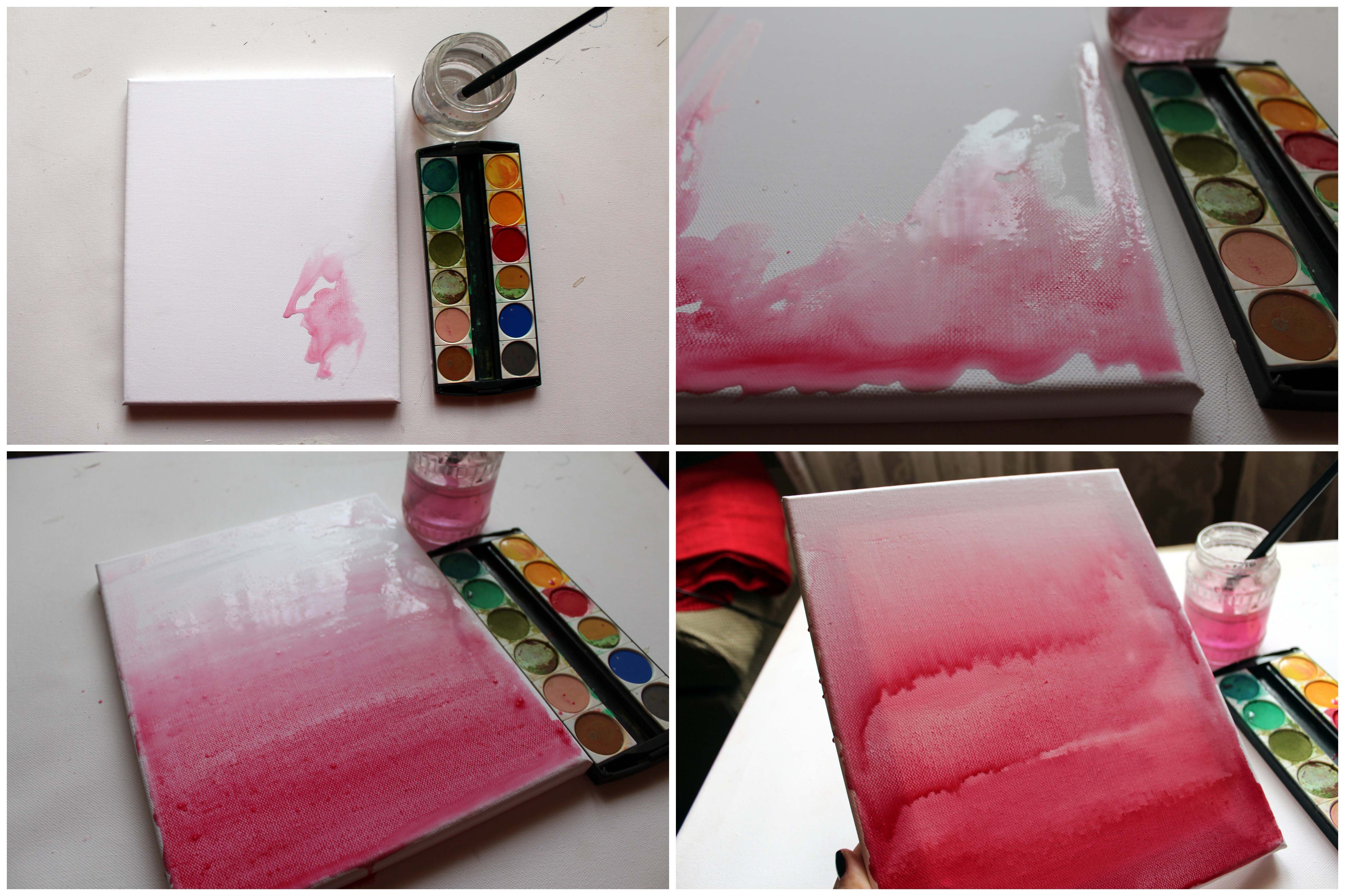 1. Először is lefestettem a vásznat vízfestékkel. Jóóóó sok vizet használtam, a festéket pedig átmenetesen adagolta bele. Alul többet tettem bele, felül meg már szinte csak a vizes ecsettel mostam át a vásznat. Picit megszárítottam, de csak annyira, hogy méga zért folyjon a víz rajta. Akkor felemeltem a vásznat, és megfolyattam kicsit. Visszafektettem, és így megszárítottam teljesen.