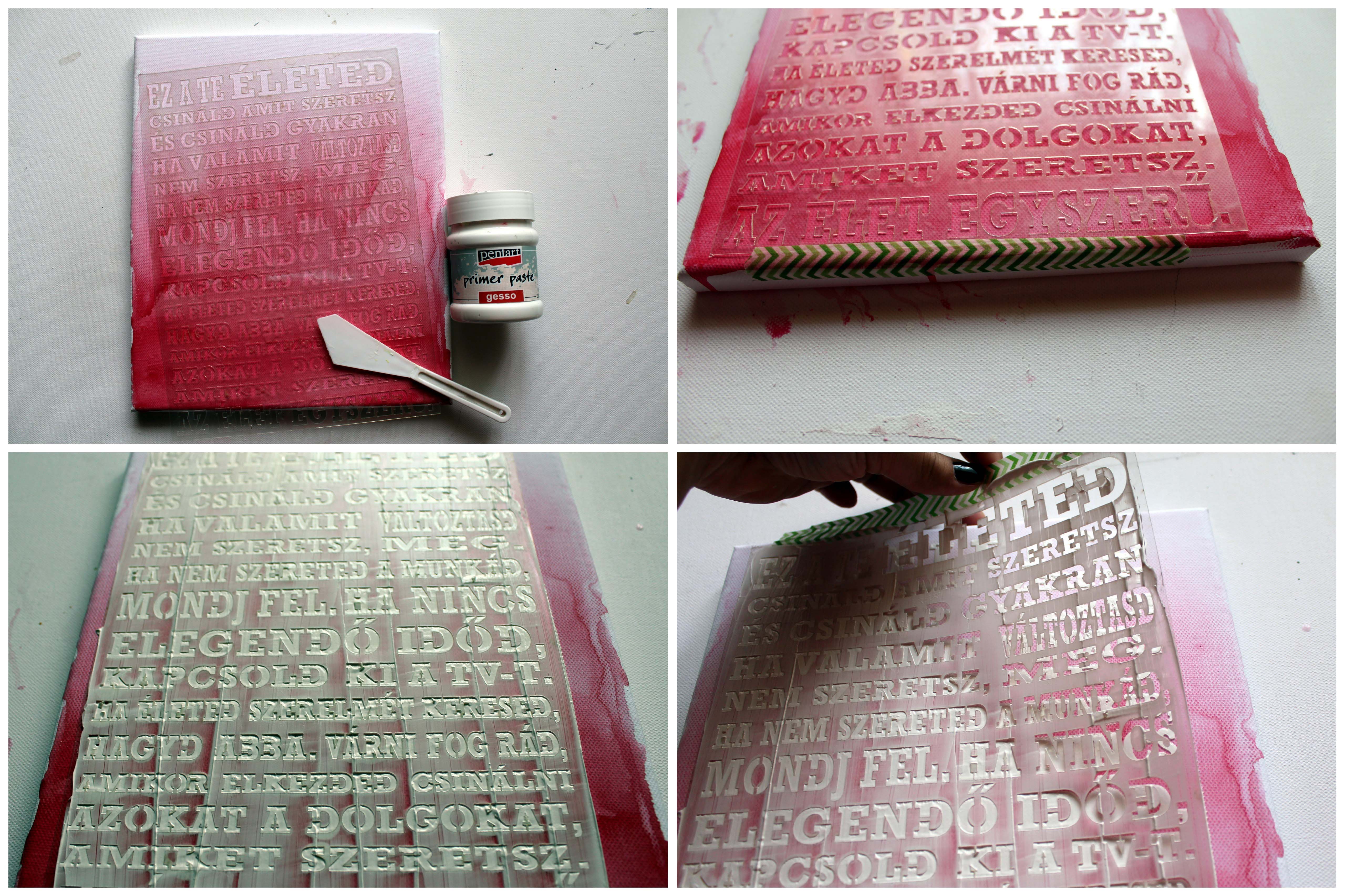 2. Ezután munkába állítottam a stencilt. Alul és felül egy darabka dekortapasszal rögzítettem a vászonhoz, majd gessoval és spatulával elkészítettem a mintát. (Itt jegyzem meg, hogy jó ötlet volna egy kis 3D port keverni a gessoba, azzal elkerülhettem volna, hogy néhol aláfolyjon a stencilnek.)