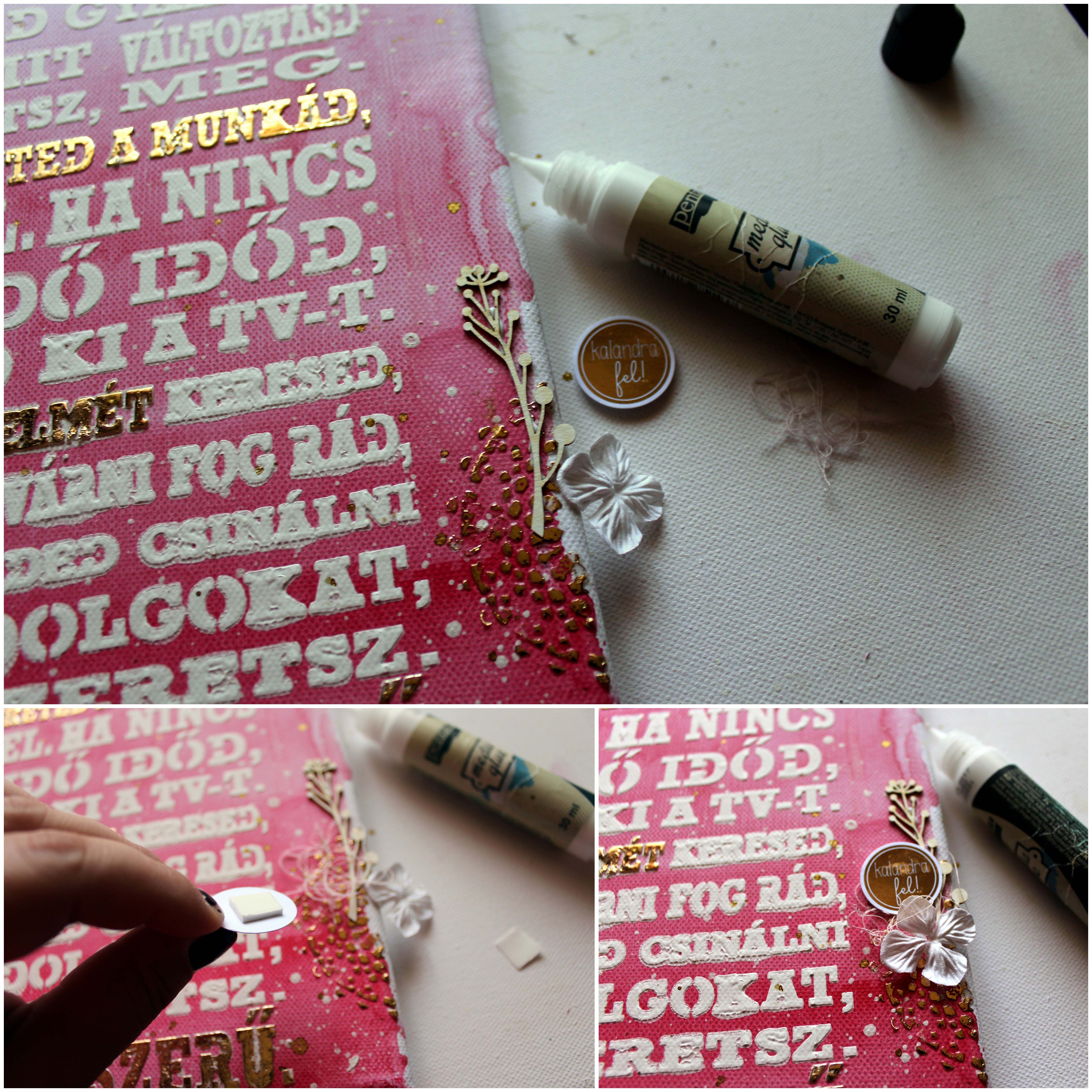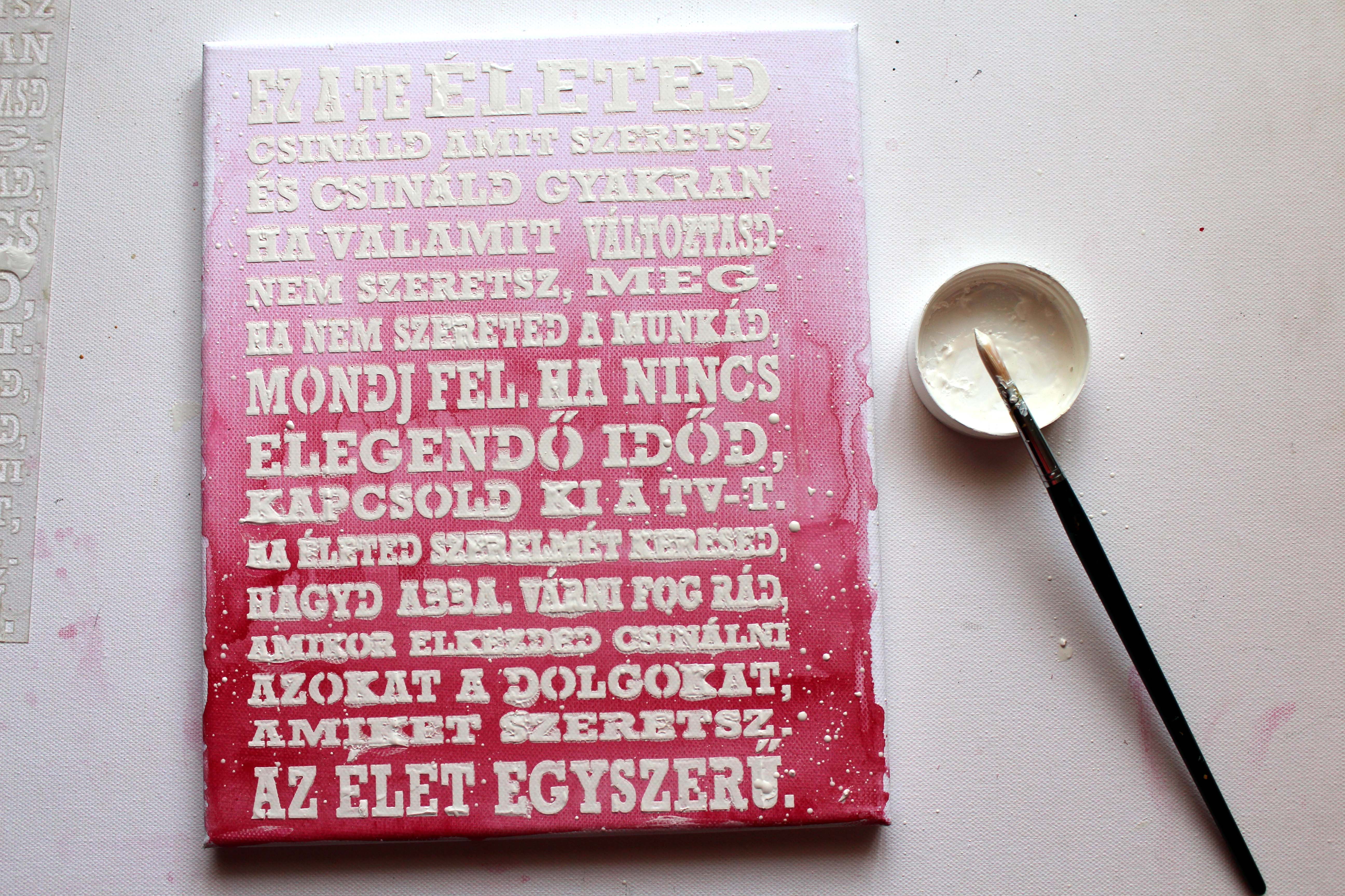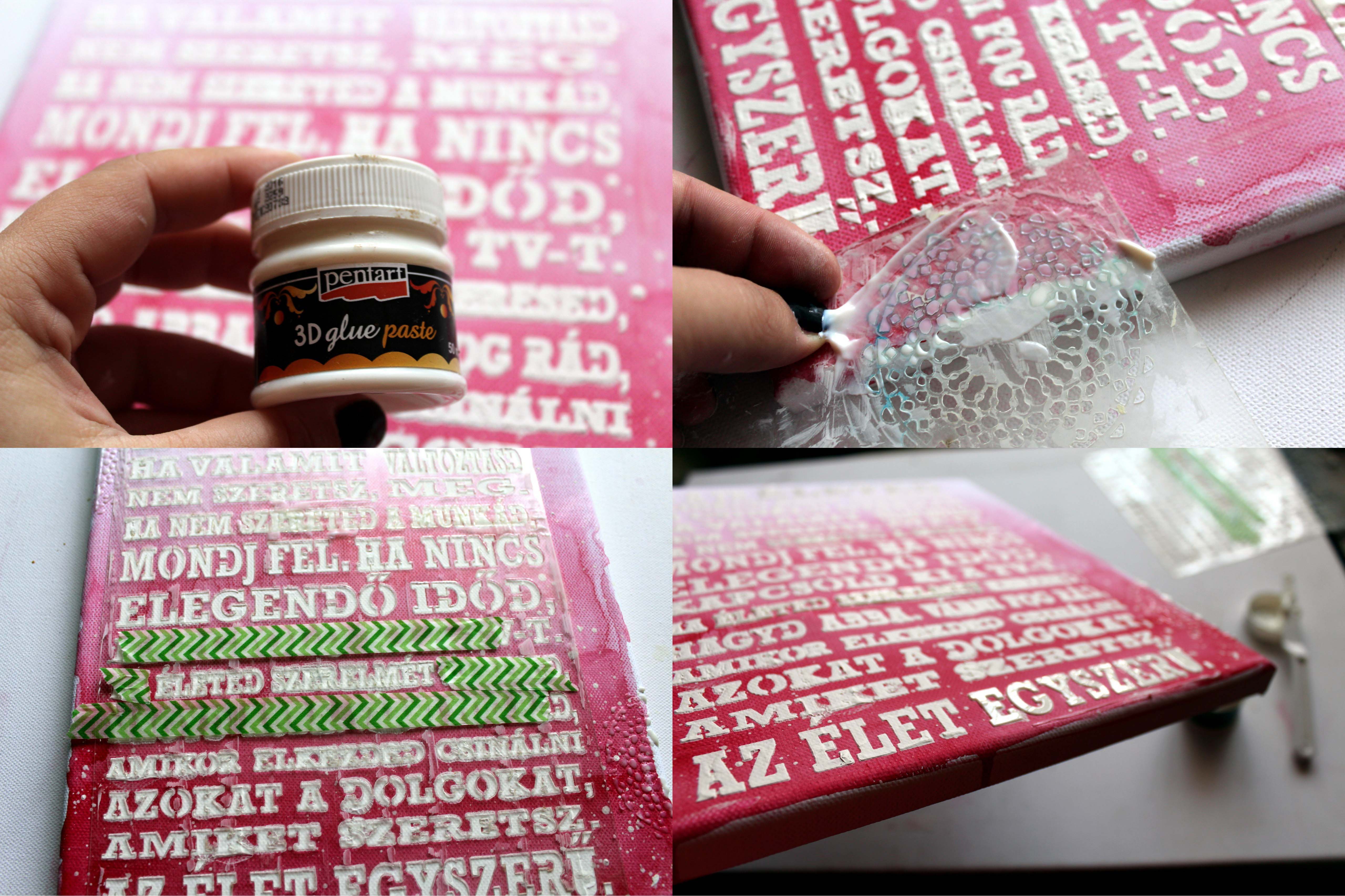 4. Ezután bevetettem a kedvencemet, a 3D ragasztó pasztát, visszatettem a stencilt, és némelyik szót "áthúztam" a ragasztóval. VIGYÁZAT: csak teljesen száraz stencilt tegyetek vissza! TIPP: ha körberagasztjátok a szót, amit stencilezni akartok, akkor az jelentősen megkönnyítni a dolgotokat! 🙂