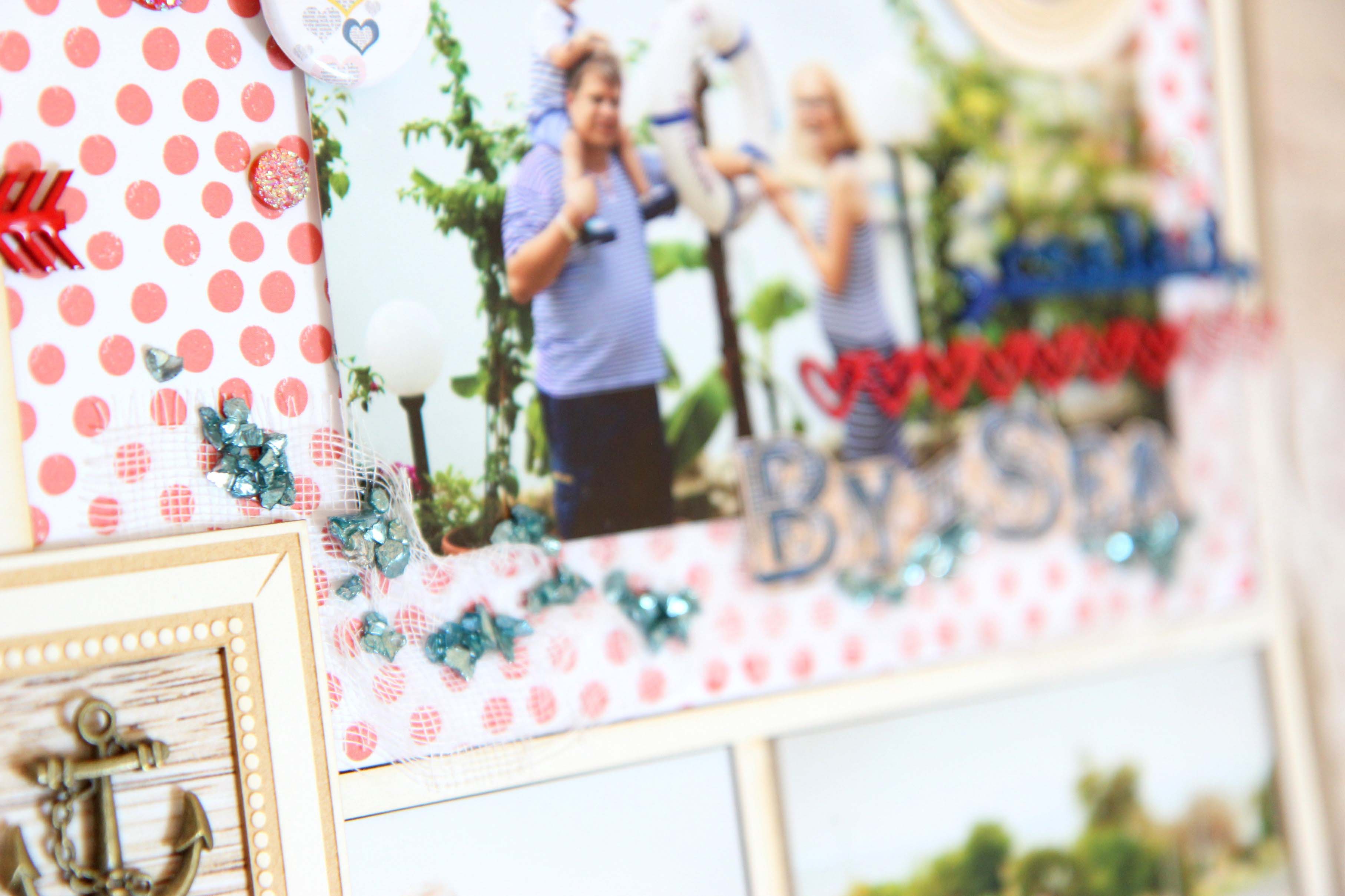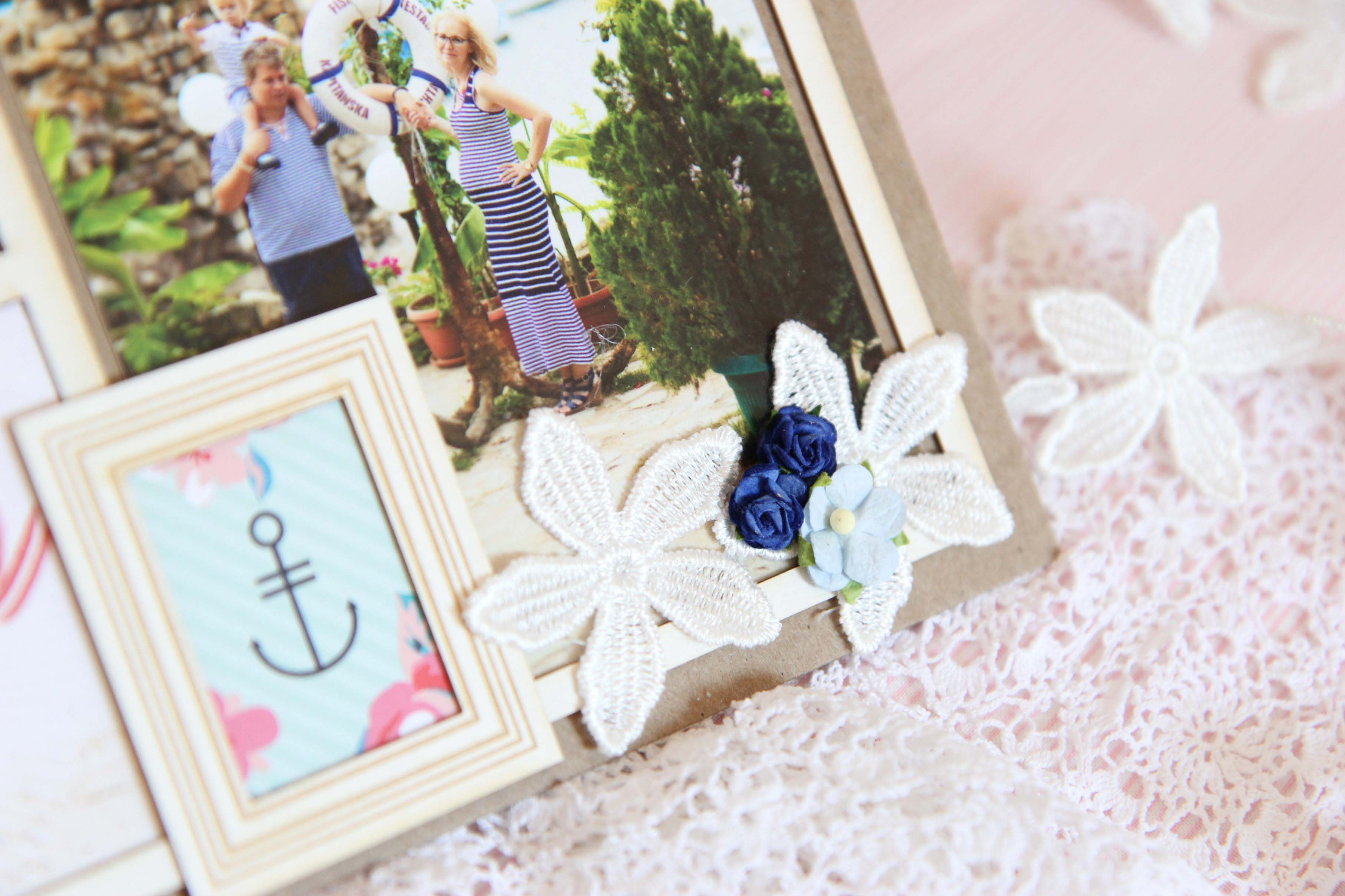 Kivágtam fényképeket méret alapján, festettem chipboardot, hozza tettem egy virágos csipkét és pár darab papír virágot. A kis kavicsot Glossy Accenttel ragasztattam fel.