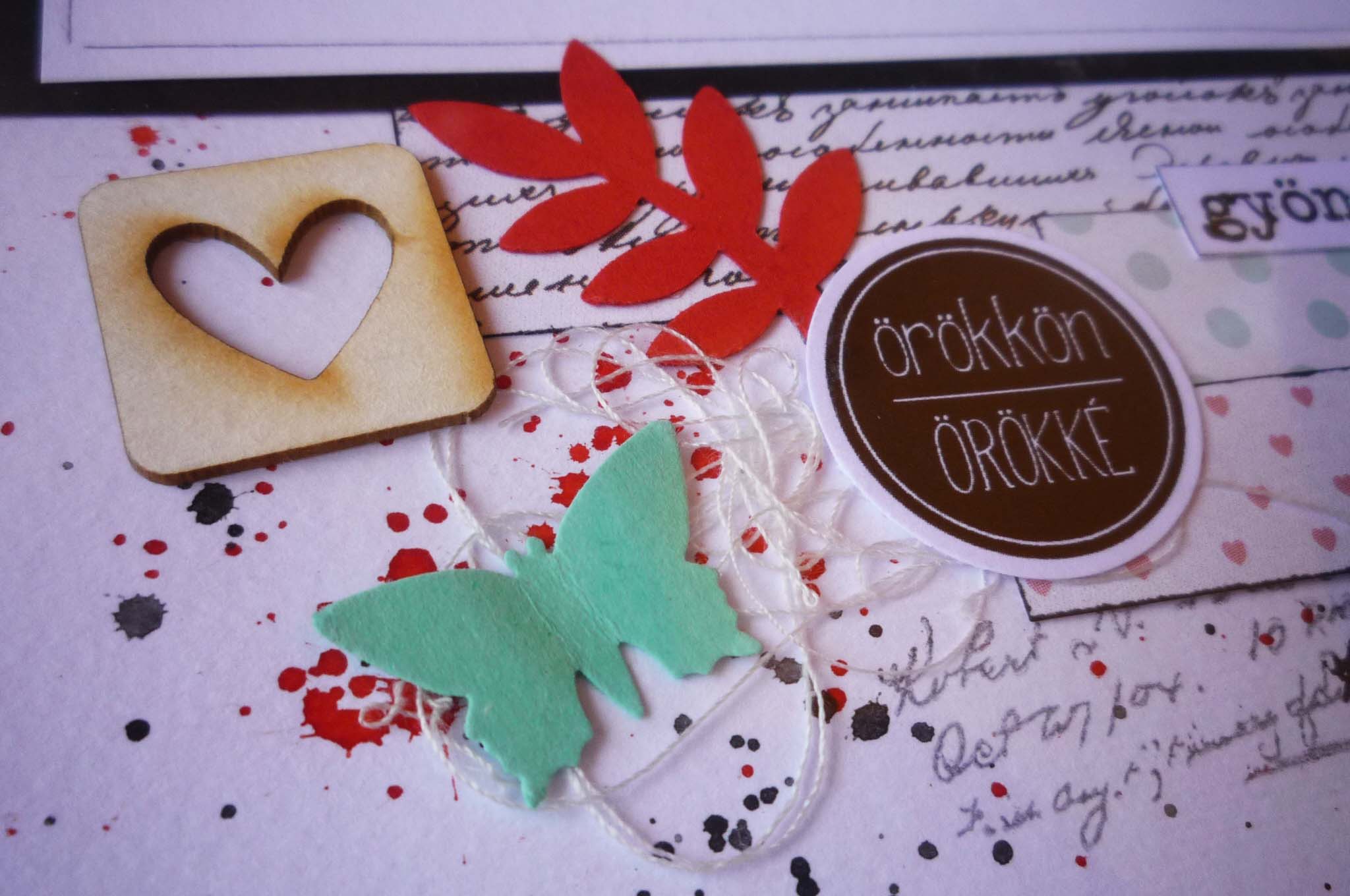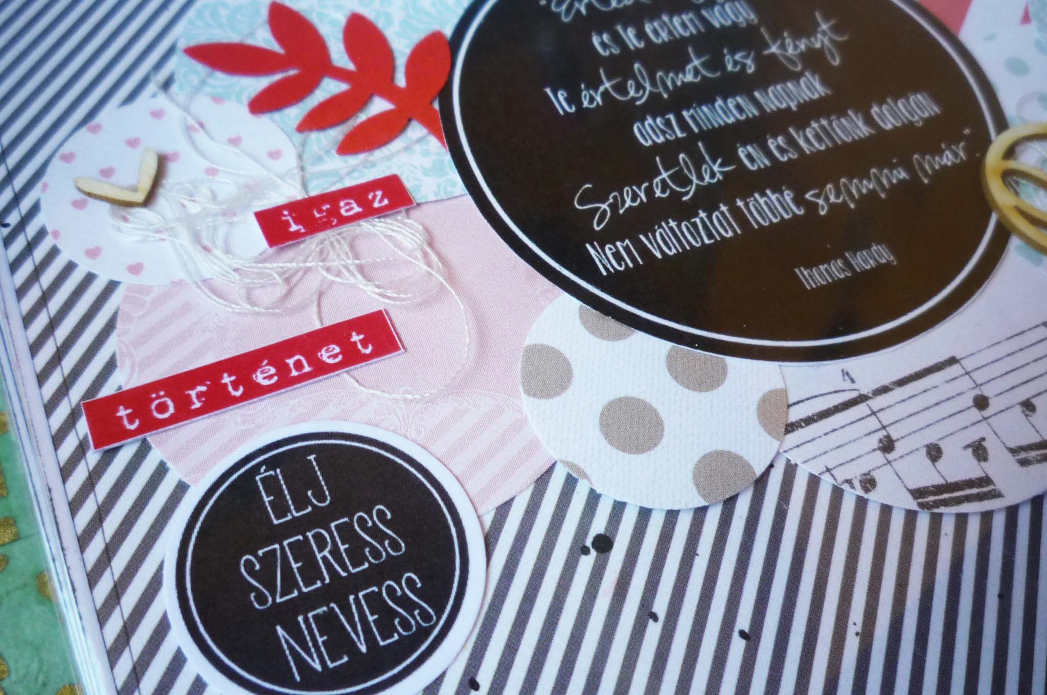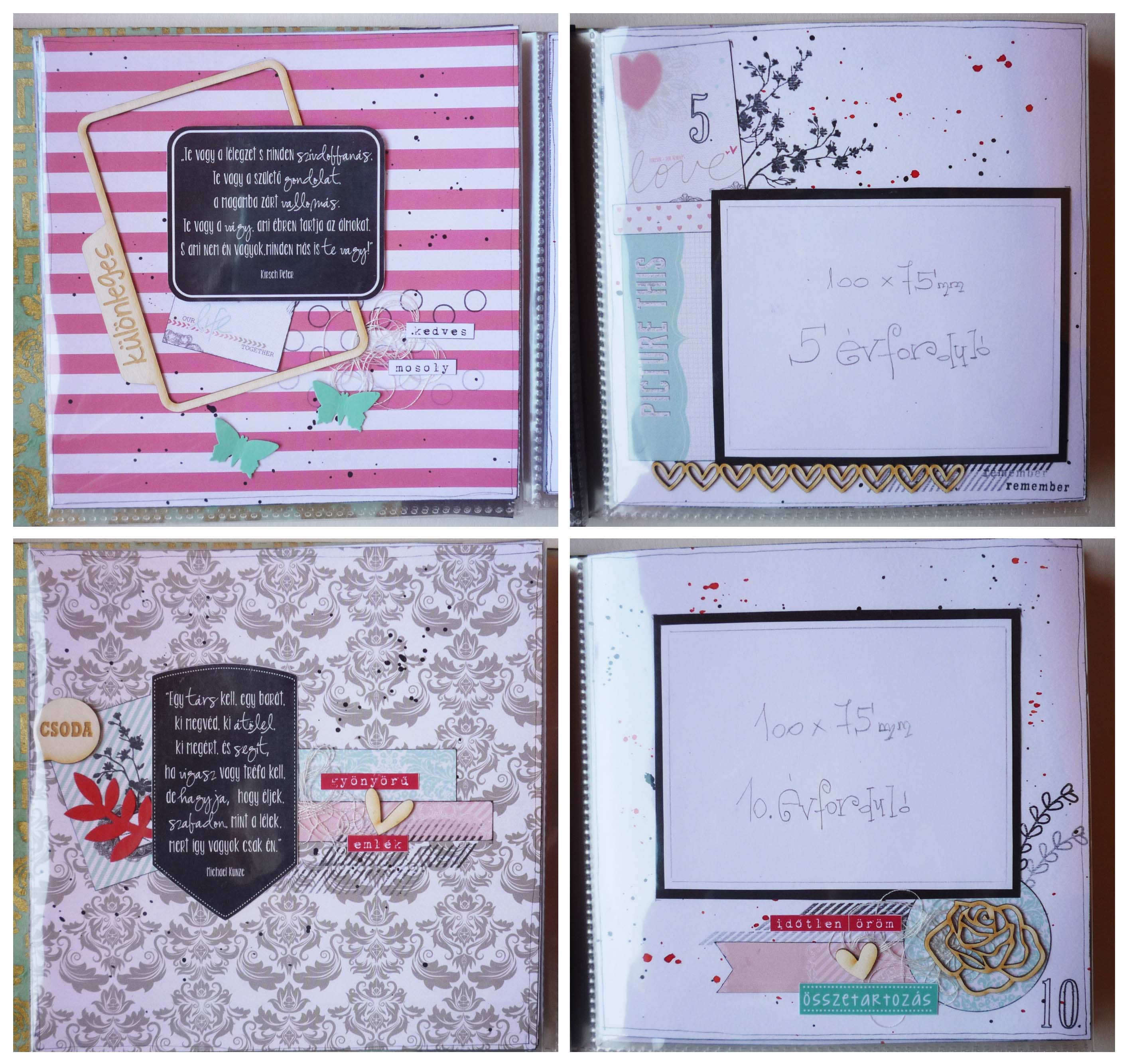 Az album alapkoncepciója, hogy 5 évente kell egy fotót készíteni a párnak a házassági évfordulójukon és azt az adott oldalra ragasztani. A fotós oldalakat fehéren hagytam, fröcsköltem pirossal és feketével és (magamhoz képest) minimálisan díszítettem. Az idézetes oldalakhoz papírkészletet használtam, és Veronika esküvős albumából inspirálódva, kereteket. Nagyon megtetszett ez a fajta felhasználása. Adriennek köszönöm a sok pecsétet és a lyukasztókat, mert amit a téma és a papírkészlet hangulata követel nem áll hozzám közel, ezért kiegészítőim sem voltak hozzá. Viszont, amit imádtam, a gépírós szócímke csomag. Még ehhez a témához is tökéletesen passzolt, és jól lehetett díszíteni vele a cérnahalmokat.