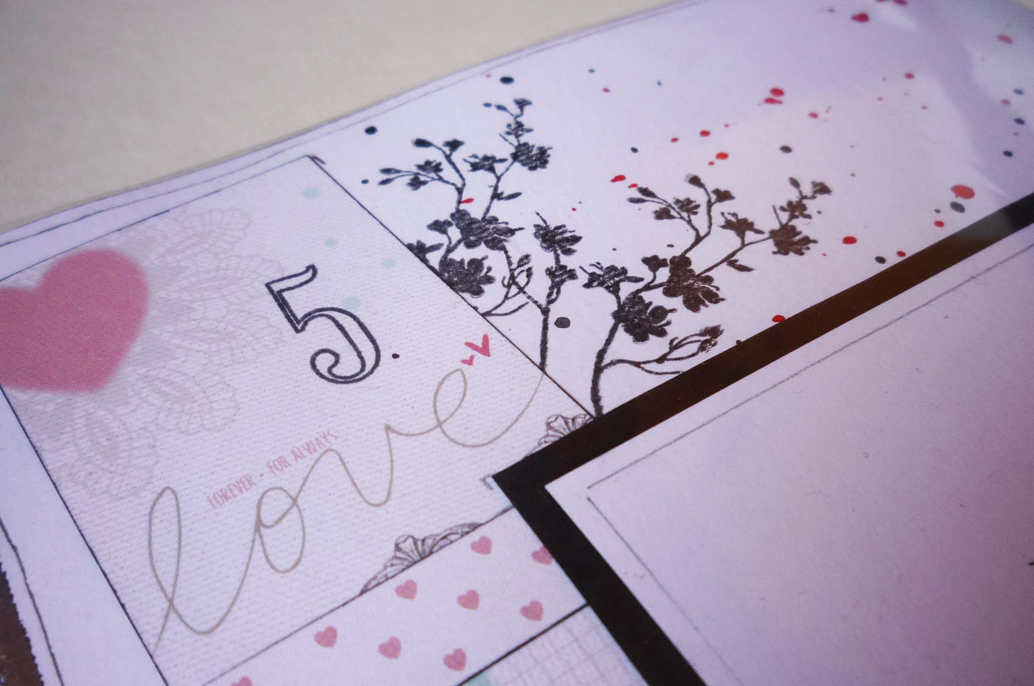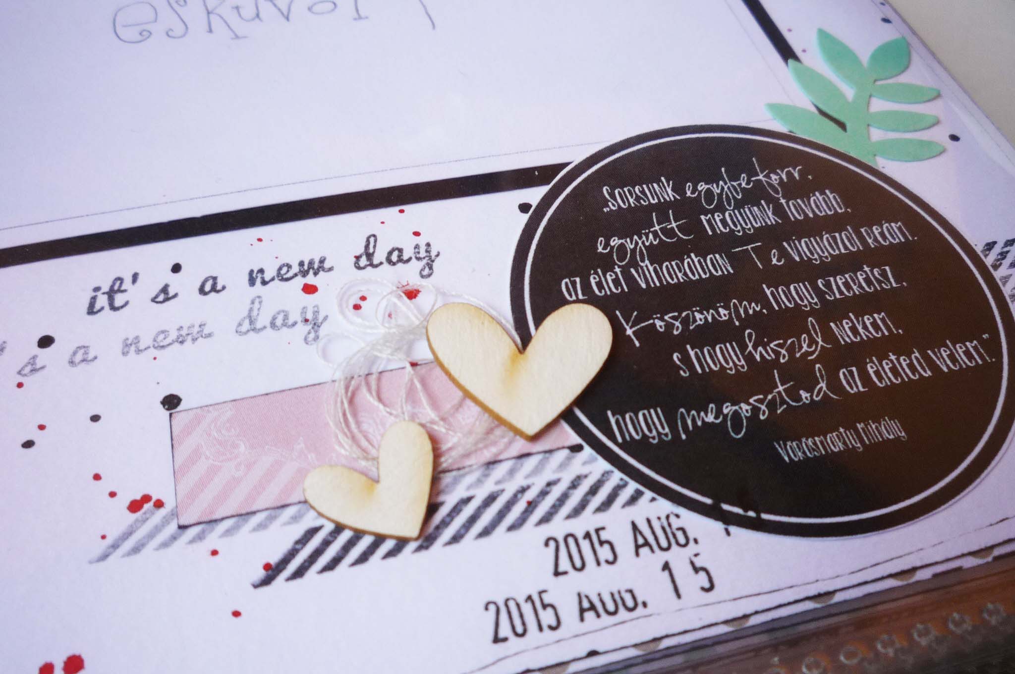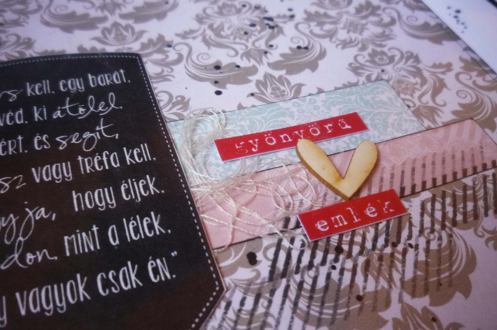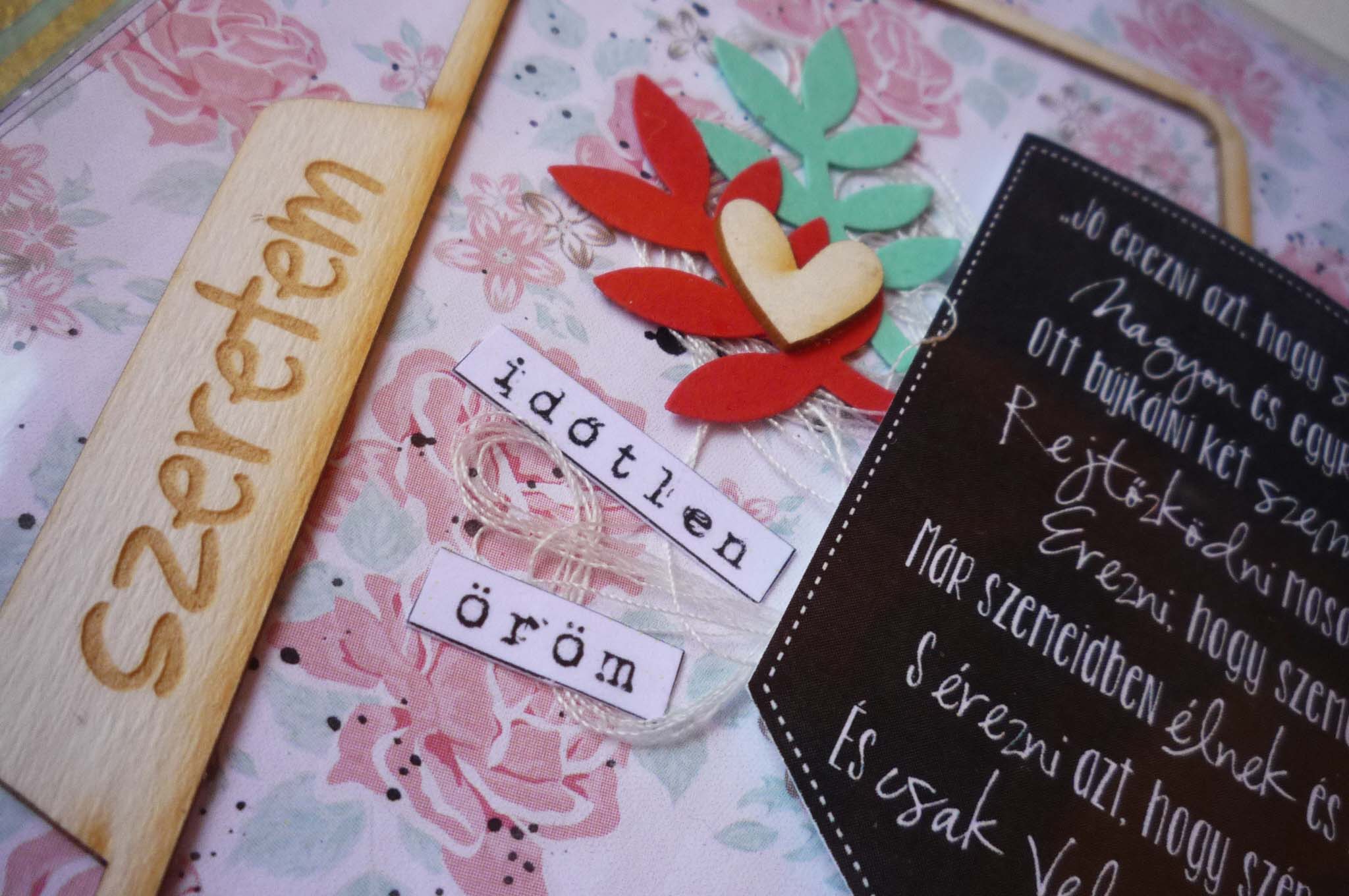 Az album alapkoncepciója, hogy 5 évente kell egy fotót készíteni a párnak a házassági évfordulójukon és azt az adott oldalra ragasztani. A fotós oldalakat fehéren hagytam, fröcsköltem pirossal és feketével és (magamhoz képest) minimálisan díszítettem. Az idézetes oldalakhoz papírkészletet használtam, és Veronika esküvős albumából inspirálódva, kereteket. Nagyon megtetszett ez a fajta felhasználása. Adriennek köszönöm a sok pecsétet és a lyukasztókat, mert amit a téma és a papírkészlet hangulata követel nem áll hozzám közel, ezért kiegészítőim sem voltak hozzá. Viszont, amit imádtam, a gépírós szócímke csomag. Még ehhez a témához is tökéletesen passzolt, és jól lehetett díszíteni vele a cérnahalmokat.