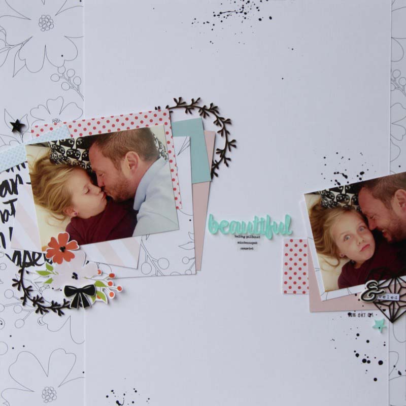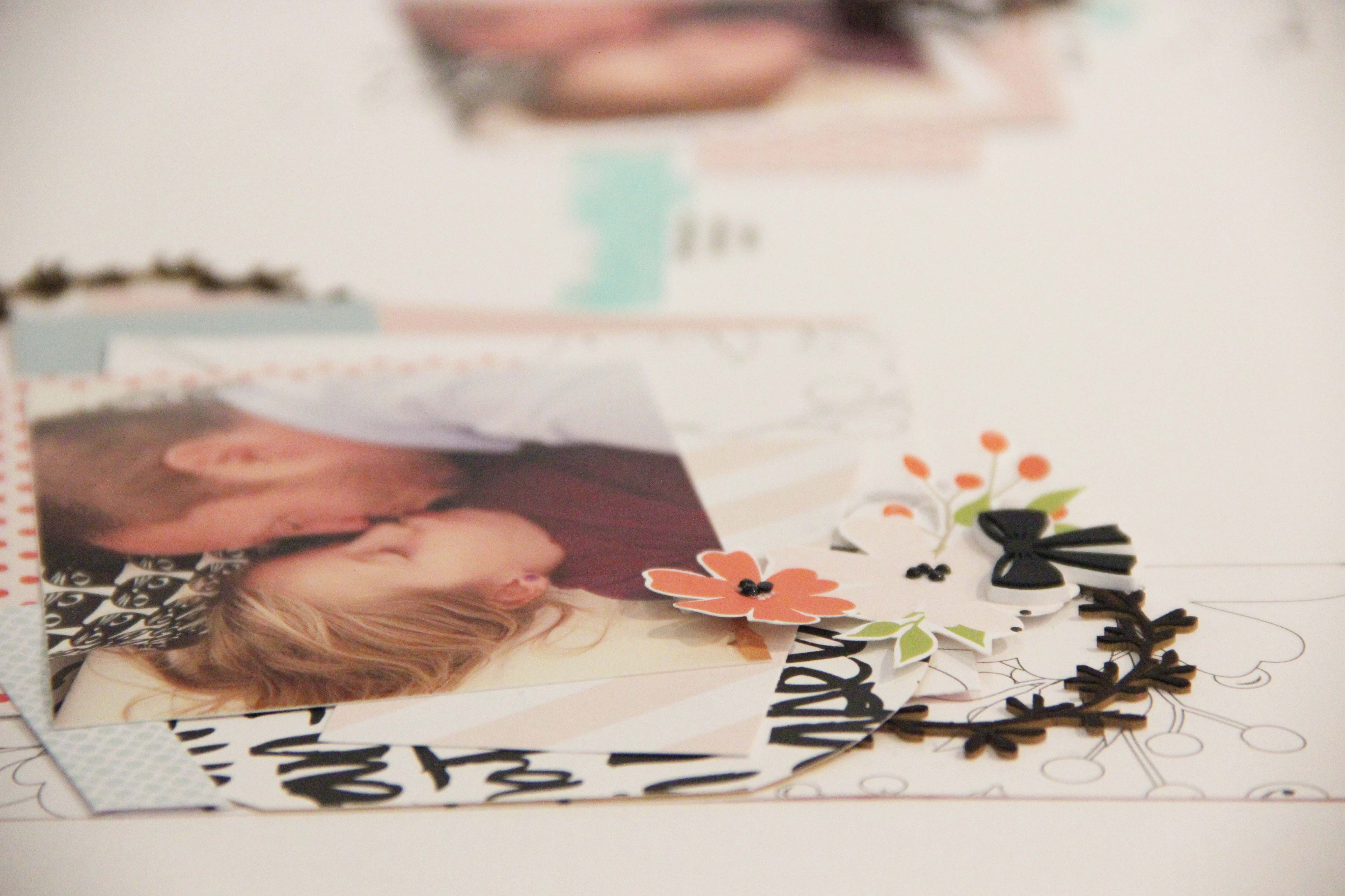 Maga az oldal nagyon kevés díszítőelemmel készült, papírok, pár chipboard és matrica került rá. Az oldalon Zsóka és Apa éppen érzékeny búcsút vesznek egymástól. A fotók nagyon frissek, a hétvégén készültek, amikor a férjem egy legénybúcsúba készült és Zsóka mindenféle fondorlattal megpróbálta még egy pár percig maradásra bírni! 😀