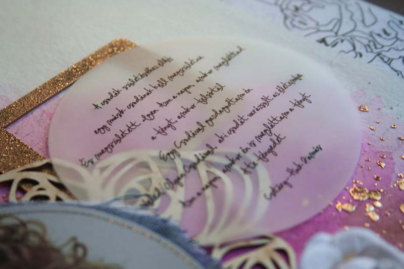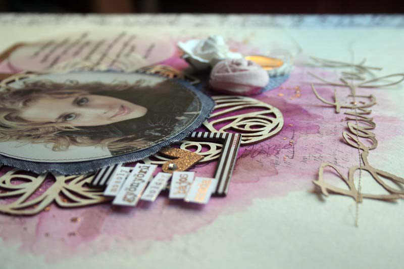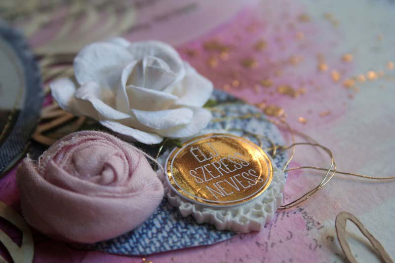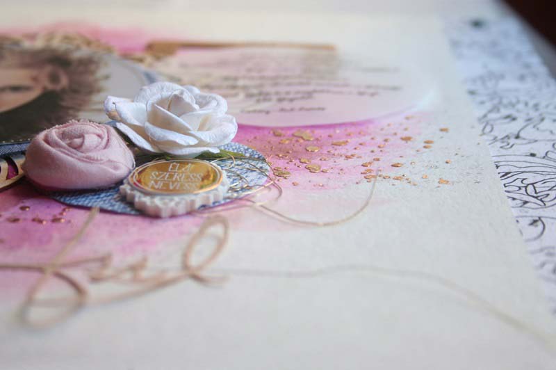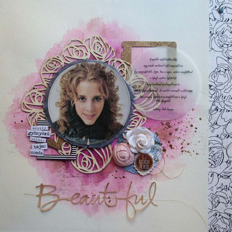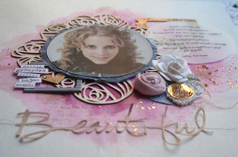 Látom, ahogy bontogatja a szárnyait, nagylány lett, hiába… Farmerben gondolkodtam, arannyal, virágokkal… Akvarell papírra dolgoztam, mert mostanában szeretek alapnak Ecoline-t használni, pecsétekkel, 3D pasztával és dekorfóliával. A rózsás chipboardot először egészben tettem a kép alá, aztán szétvágtam és elfordítottam, így kicsit olyan lett, mintha egy tiara lenne a nagylány fején. A rózsahalmot tettem először a kép jobb oldalára, de még hiányzott valami. Egy csíkos polaroid keretre szócímkéket ragasztottam, ez került balra, és egy aranyozott fa polaroid chipboard jobb felülre az idézet alá. Curioval kivágtam a „Beutiful” feliratot, ezt rávarrtam a kép aljára. A fotó alá egy kék textilt vágtam, ezt is varrtam.