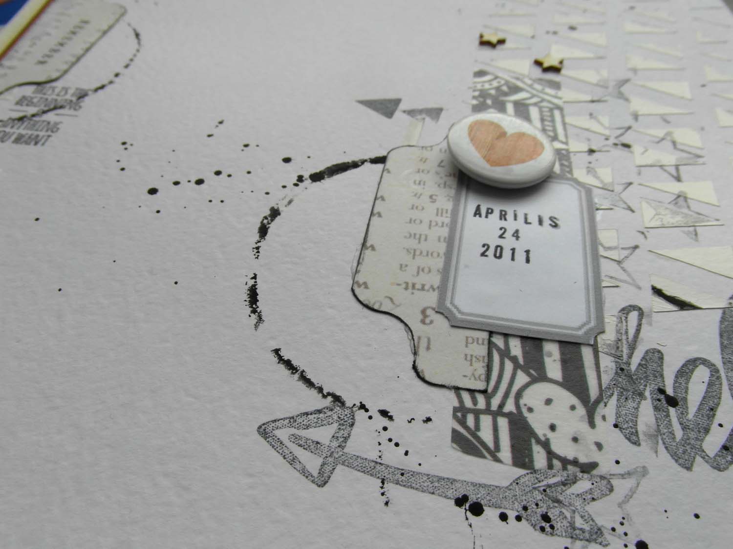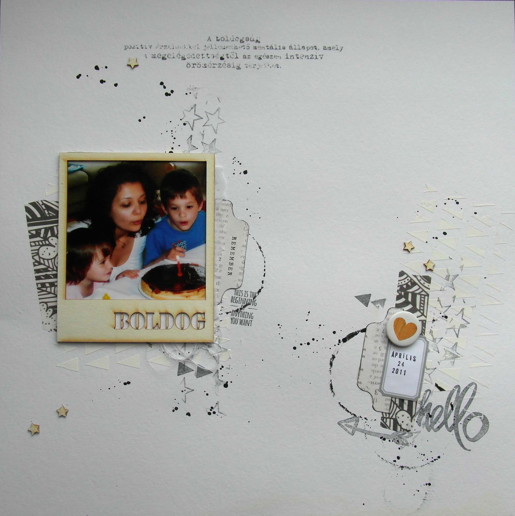 Nagyon örültem, amikor Edit felkért vendégalkotónak, de meg is ijedtem, mert be kell valljam, az elmúlt másfél évben alig készítettem nagy oldalakat, szinte csak a snap albumomba alkottam. Ahogy keresgéltem, hogy milyen oldalt is készítsek, rá kellett jönnöm, hogy a snap az ízlésemre is rányomta a bélyegét. Régebben sokkal több alapanyagot és eszközt használtam az alkotáshoz, de most néhány bélyegző, chipboard és papírfecni is elég volt.