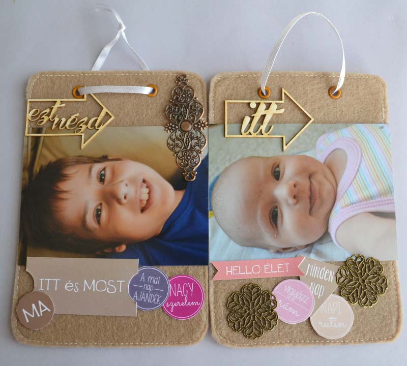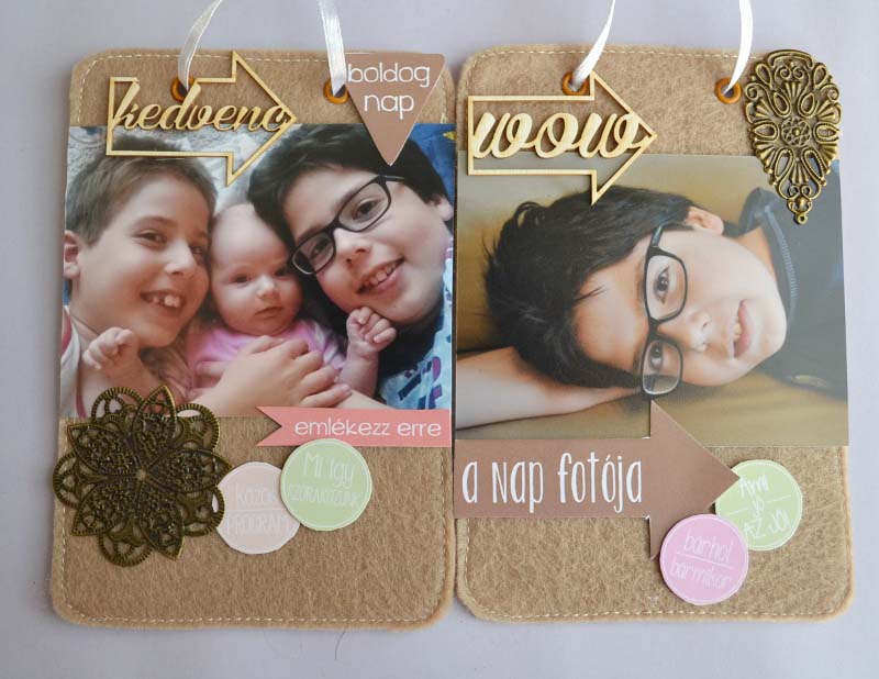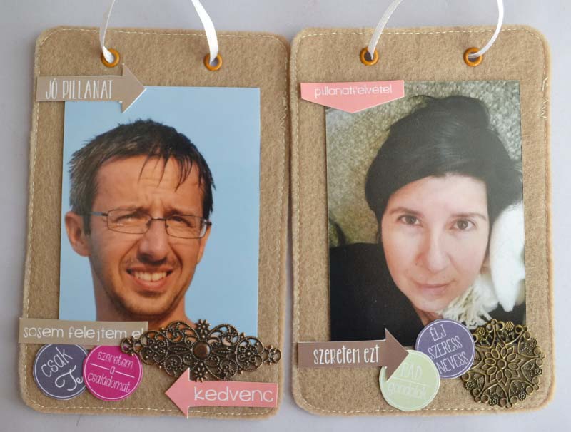 A dekoráláshoz javarészt címkéket használtam illetve chipboardokat és fém kiegészítőket (filcre is jól felragasztja a Pentart Media Ragasztó a fémet, nemcsak papírra). Mivel a fotók nem fűződnek semmilyen eseményhez, csak egyszerűen portrék rólunk, a címkéket is a családtagokhoz válogattam össze. Apró gondolatok, de mindegyik találó 🙂