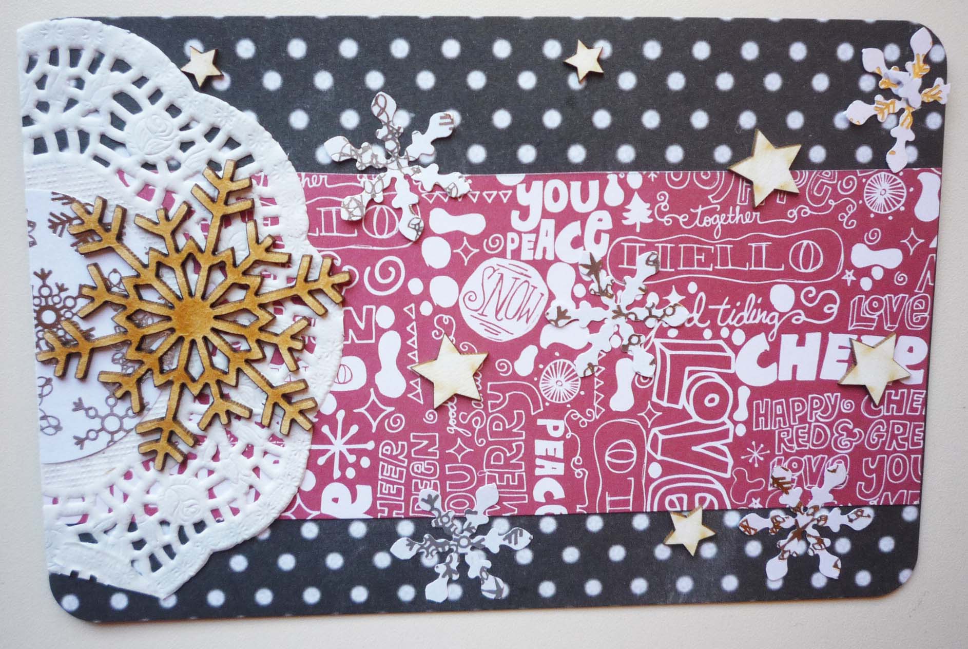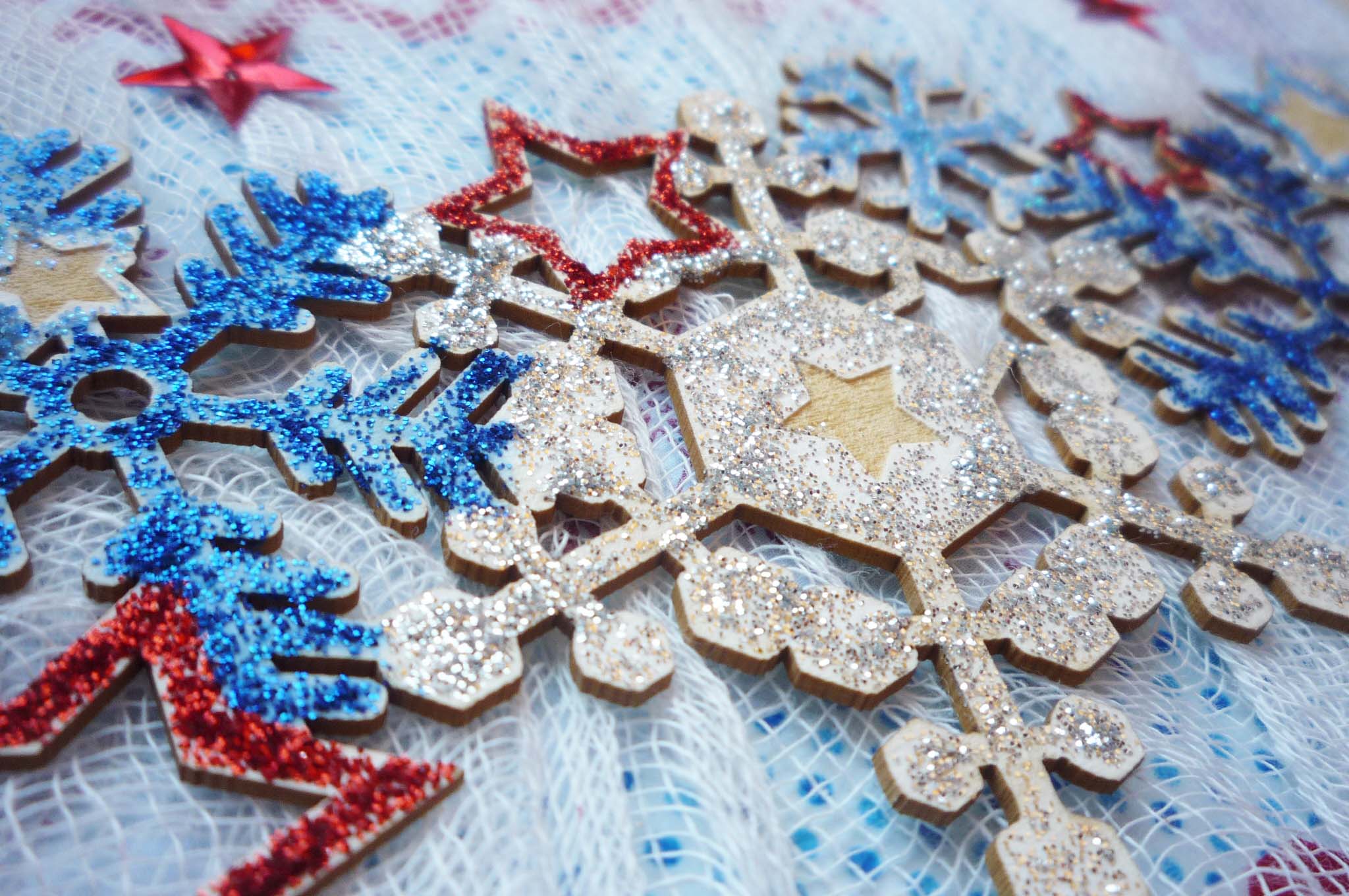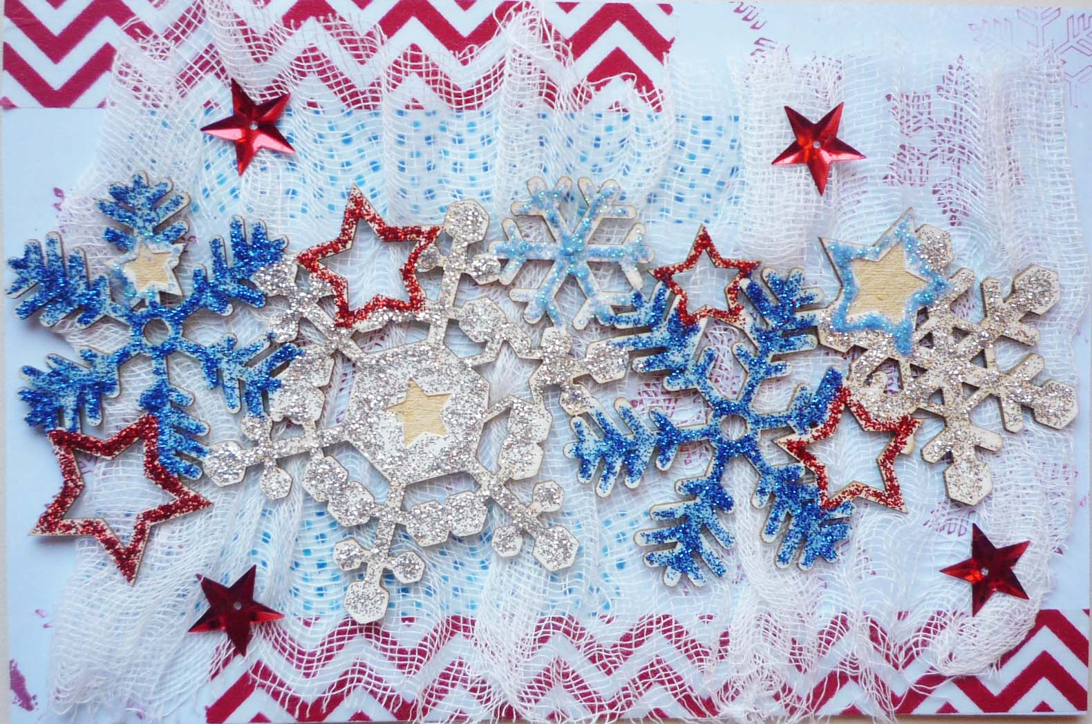 A hópelyhes girlandot csillámos ragasztóval átrajzoltam. A papírkészlet, amit a DD-hez vettem, kék piros, ezért itt is ezeket a színeket használtam. A két sarkára ragasztottam washi tapet, hogy kontrasztosabb legyen és a girland alá gézt gyűrtem be.