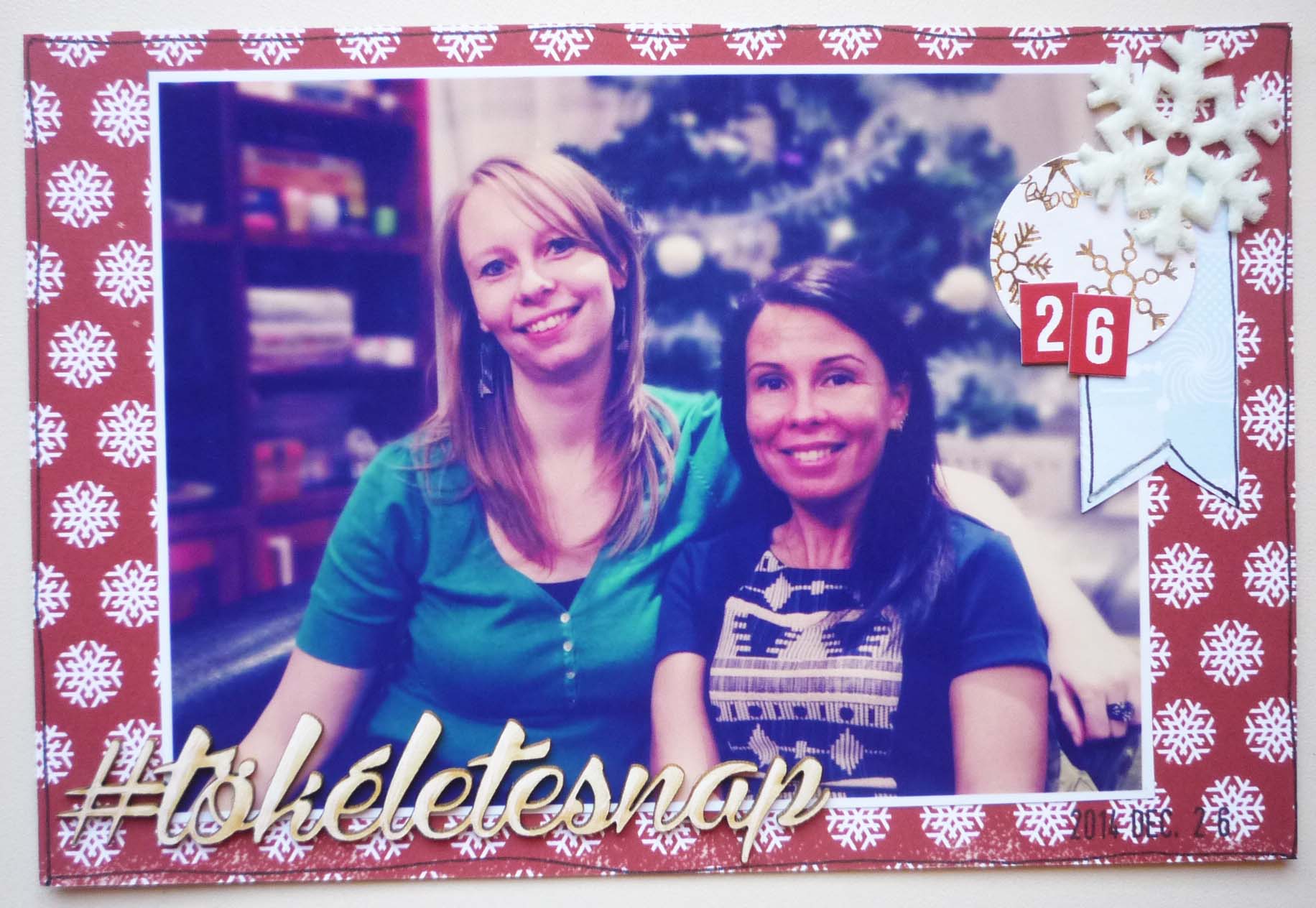 Ez lett a nyitó oldalam (15x21cm). A címfeliratot bordó tintapárnával beszíneztem, majd fehér tollal körbe kontúroztam, hogy télies hatást keltsen.