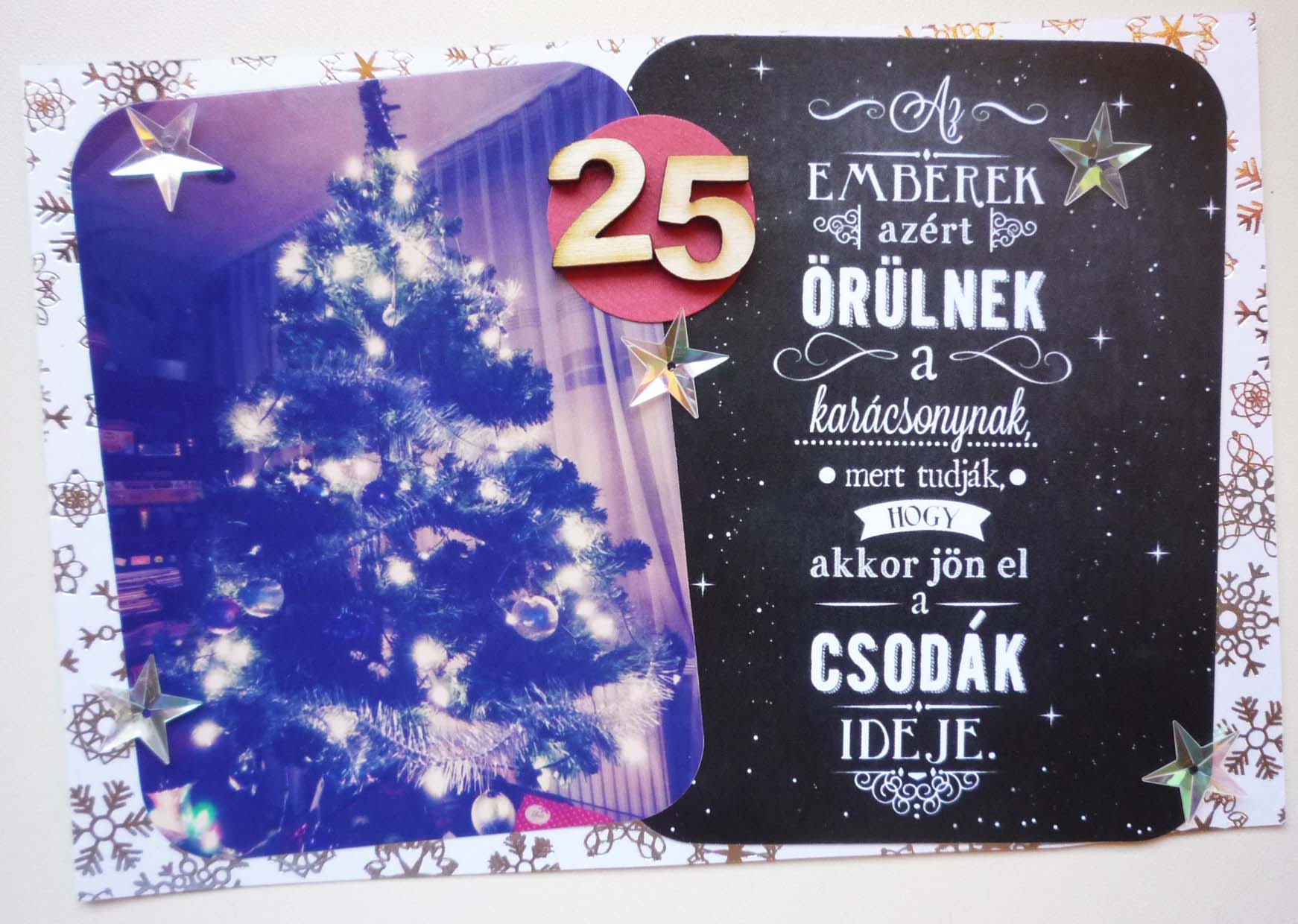 Nekem már csak 3 nap hiányzik, hogy kész legyen a teljes decemberem. Idén a snap albumom keretén belül készítettem el a December napjait. Vásároltam hozzá külön papírkészletet, és a flitter csillagok díszítésével, igazán karácsonyi hangulatúra varázsoltam a kis kártyákat.