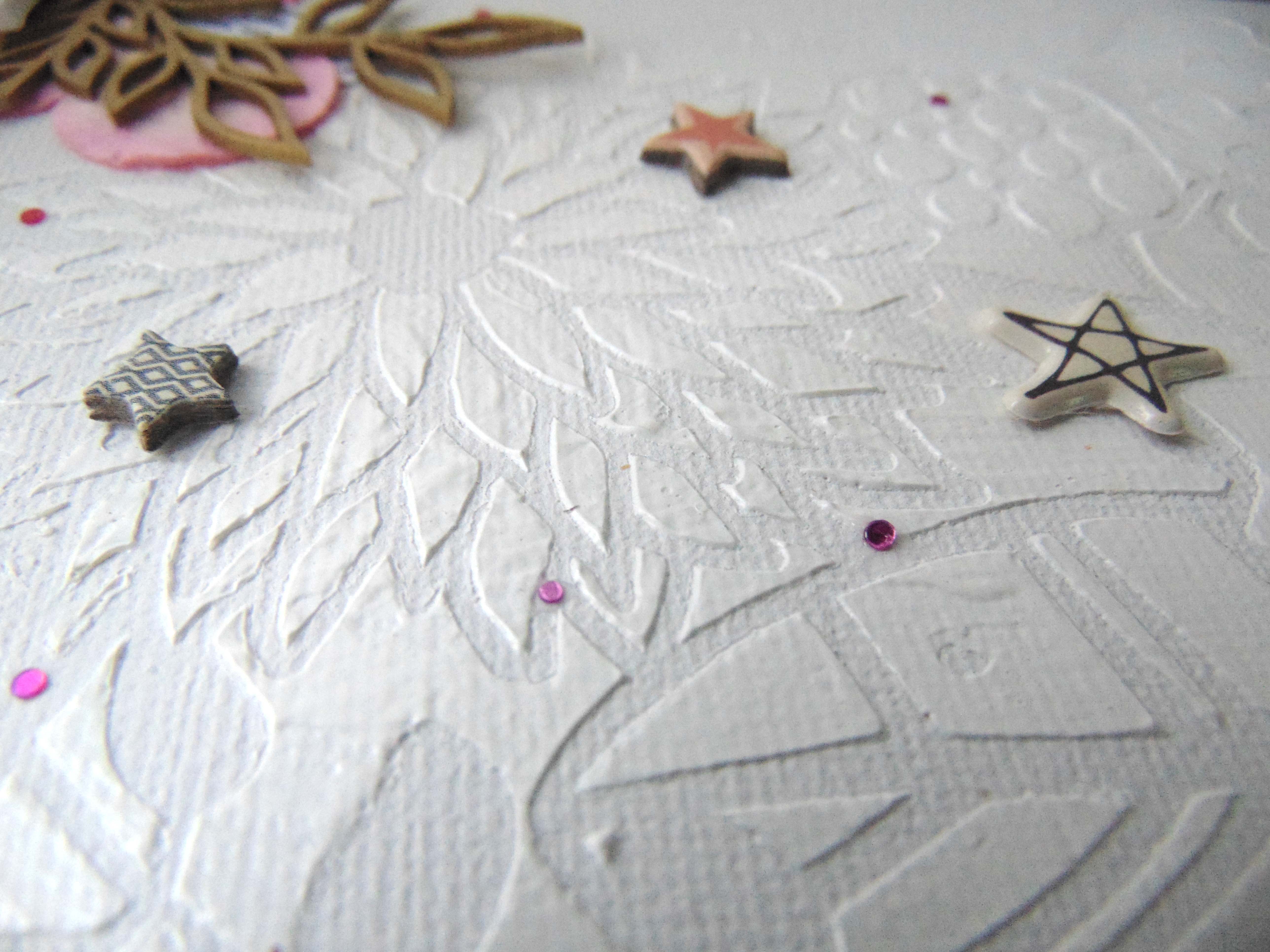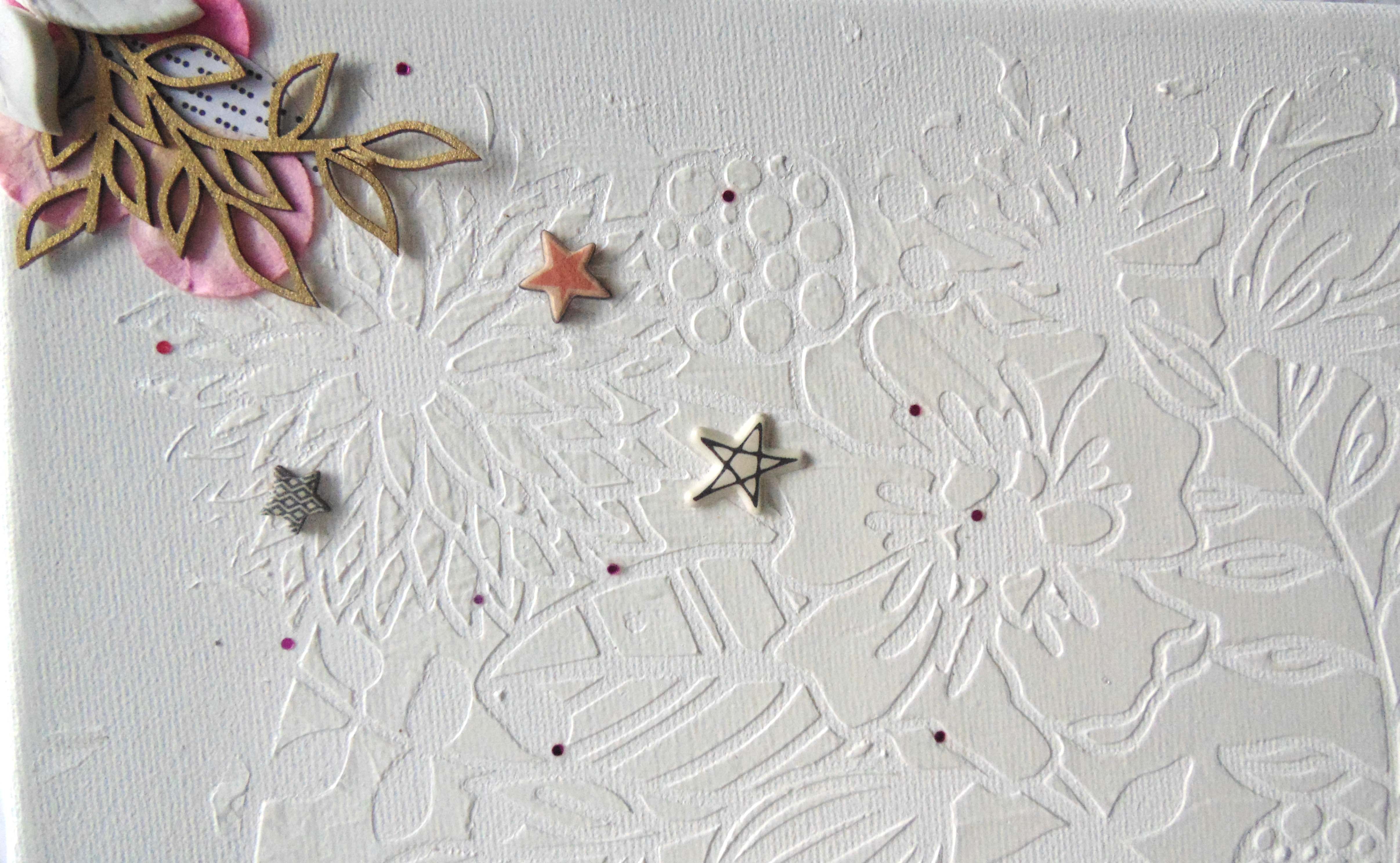Fehér akrilfestékhez gélpasztát kevertem, körülbelül fele-fele arányban, és stencillel felkentem a vászonra.