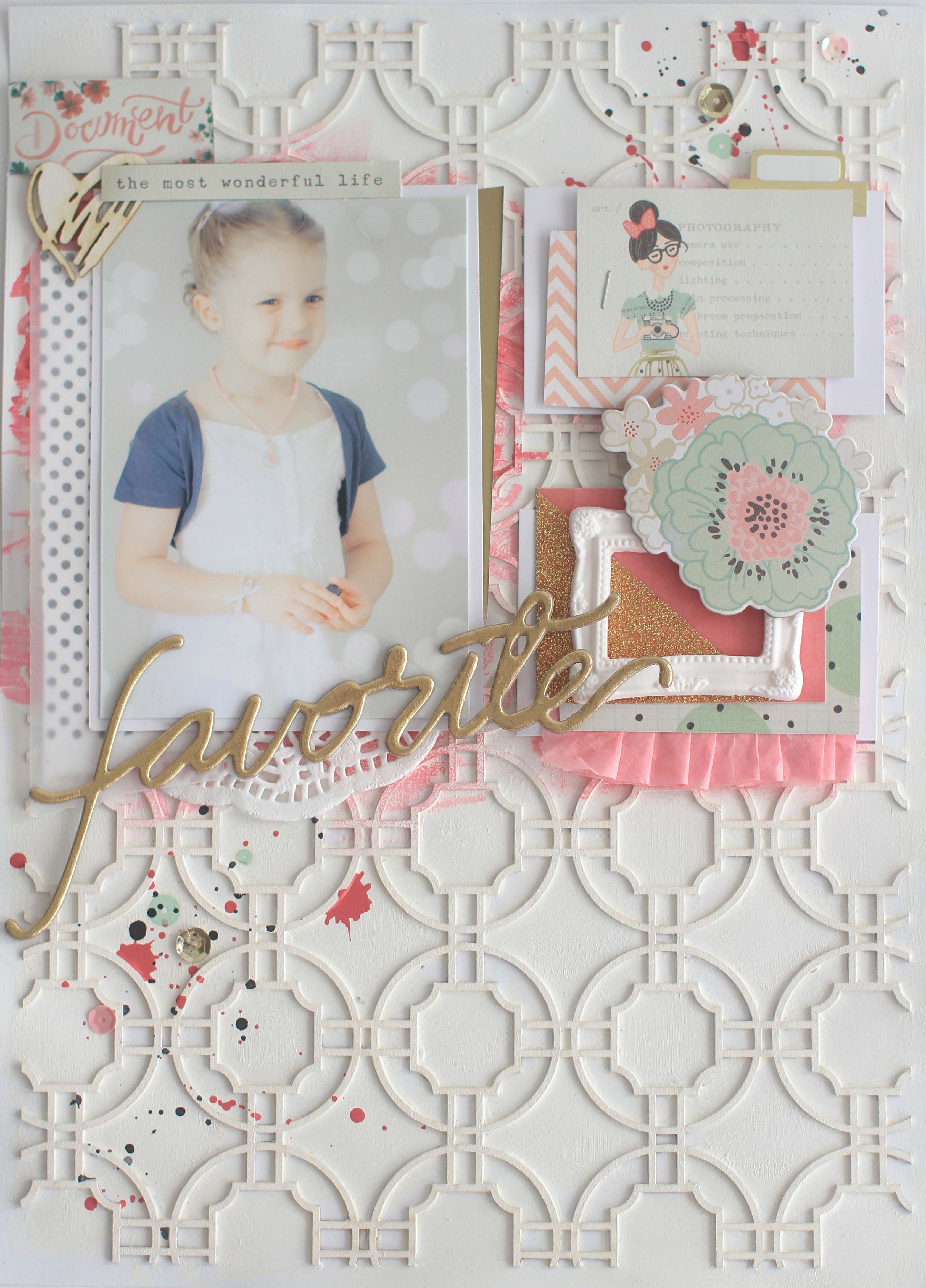 A nagyobb rózsaszín pacákat a bal felső sarokba lévő „Document” kártyán látható virágokhoz, míg a kis feketéket az oldalon több helyen fellelhető pöttyös kiegészítőkhöz igazítottam (fotó alatti papír, a virág chipi bibéje, illetve az alatta lévő zöld pöttyös papír).