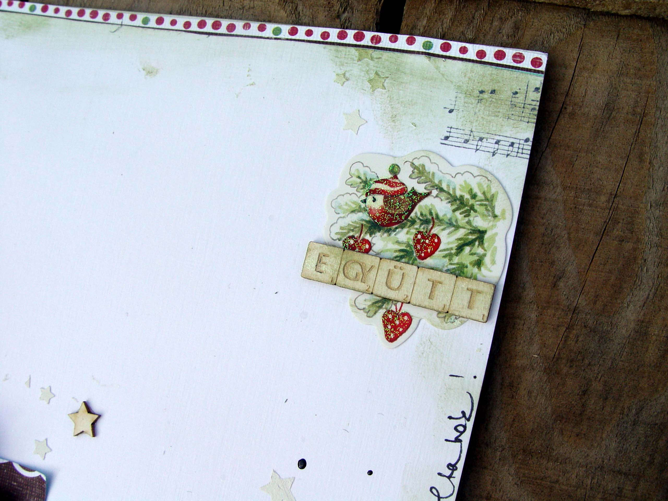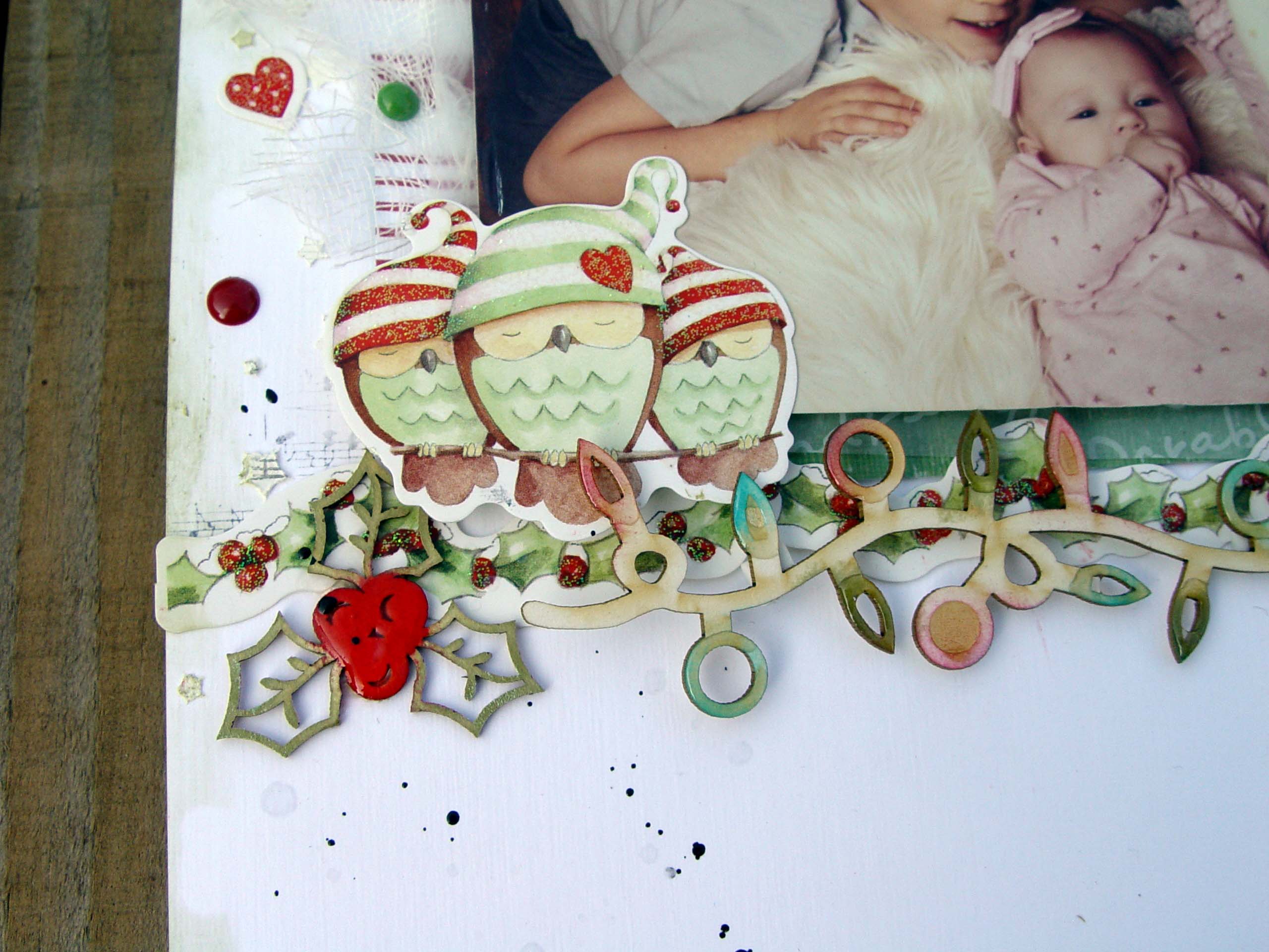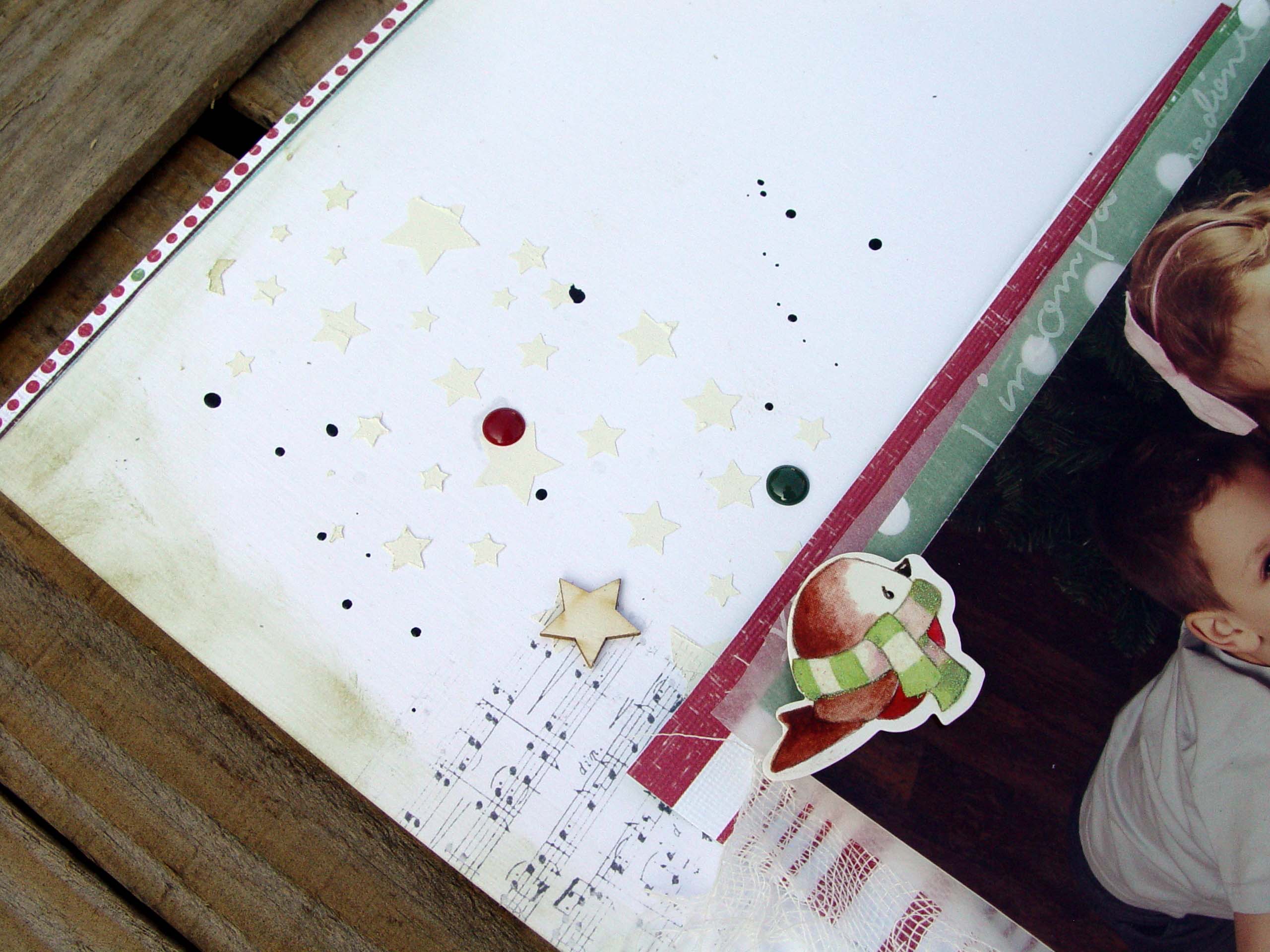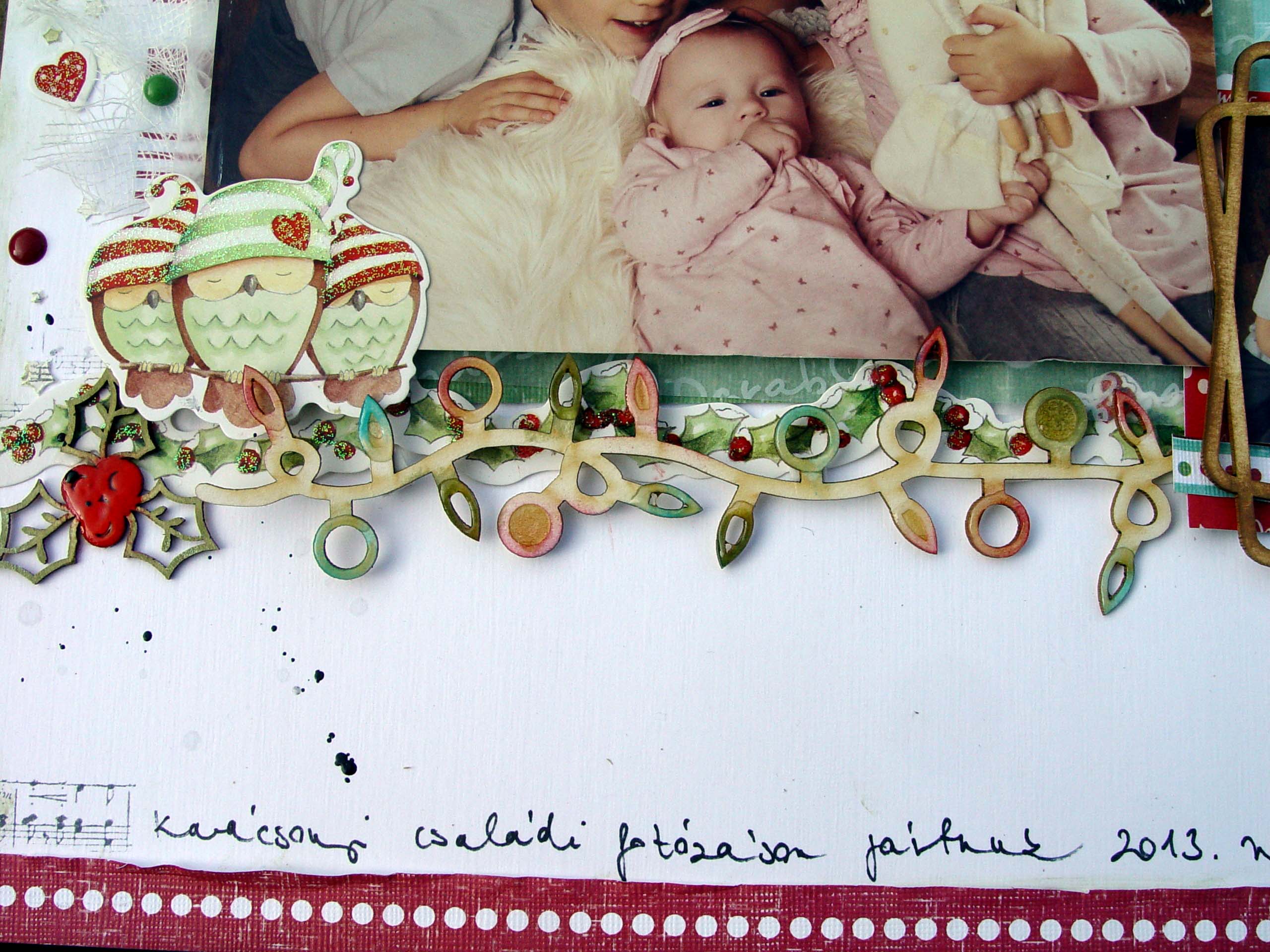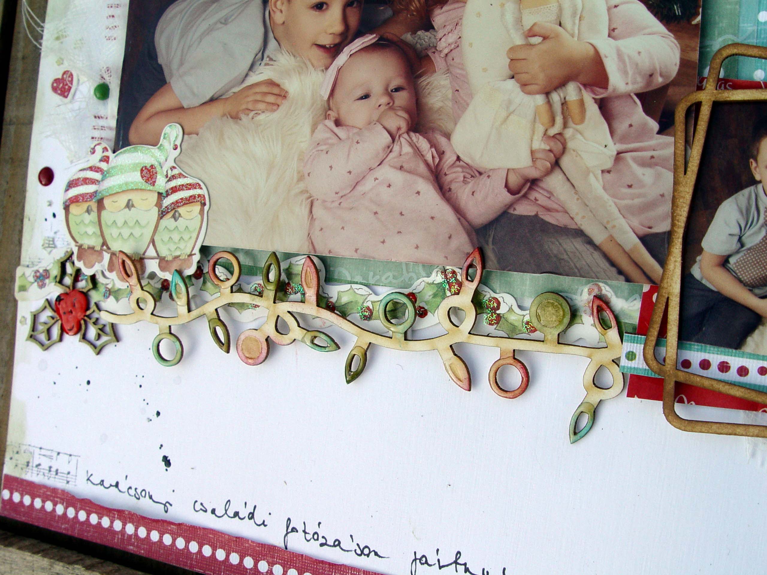 A fehér alapkartonra kis csillagokat vittem fel stukrtúrpasztával, majd száradás után picit összemaszatoltam zöld tintával, itt-ott pecsételtem rá kotta mintát, majd elővettem a tavaly ajándékba kapott jó-lesz-ez-még-valamire papírkészletem, meg az idén vásárolt jesszusom-de-cuki matricáimat, -amiből a 3 kis bagoly a múltkori baglyos oldalam után szinte kötelező elemnek számított-, és összeraktam az oldalt. A nagyobb kép alá több rétegben használtam a papírt, a rétegek közé 3D matricát tettem, a kisebbik képet pedig a csodás, magyalos keretettel emeltem ki. A karácsonyi újdonságok közül a két nagy kedvencem a scrabble szavak és az izzósor szintén kihagyhatatlanok voltak. 🙂 Az izzókat különböző színű tintapárnával színeztem meg, majd glossyval lekentem csak az égőket, hogy üvegszerűek legyenek. A végén még muszáj volt néhány fekete tintapaca meg színes akrilpötty, aztán késznek nyilvánítottam. 🙂