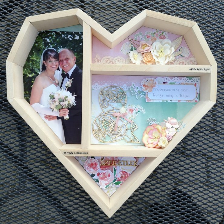 A keret adta mélységet igyekeztem kihasználni: sok 3D ragasztót használtam, például az alsó háromszögben a kivágóívből kivágott rózsákat ezzel ragasztottam rá az amúgy is virágos háttérpapírra. A „szeretlek” feliratnak csak a vége van az így megemelt rózsára ragasztva, a többi a levegőben lóg.