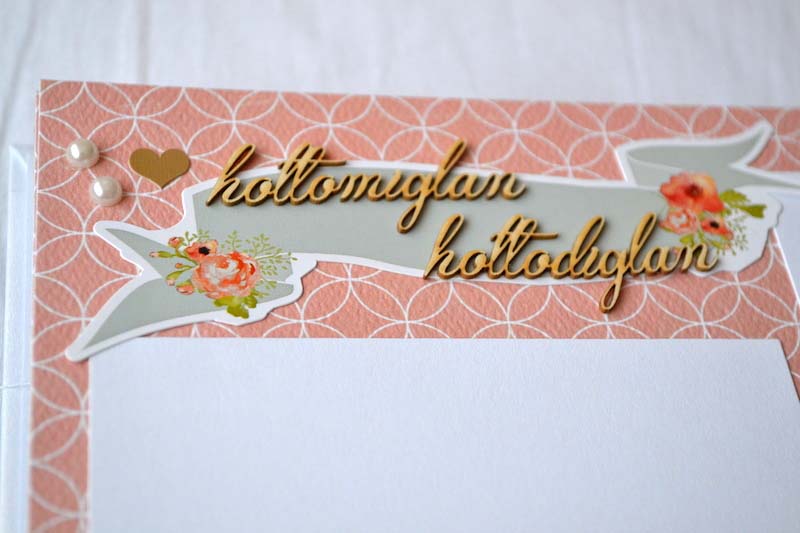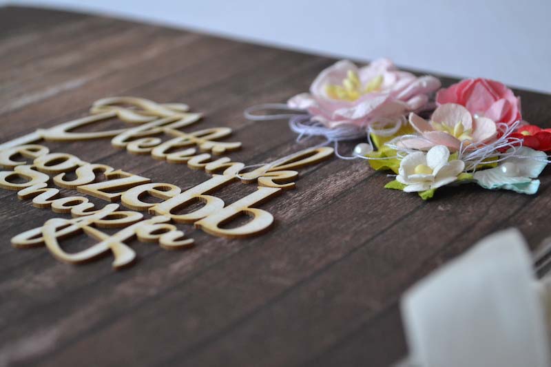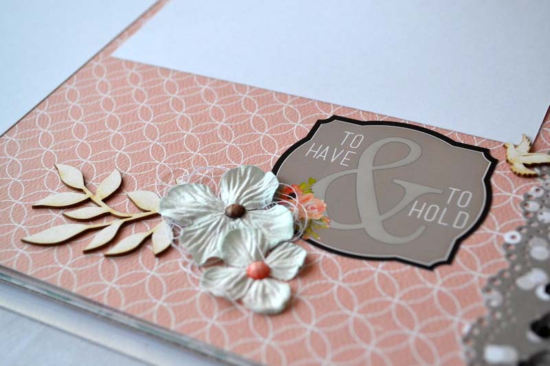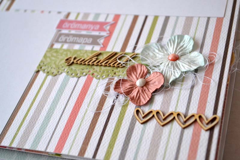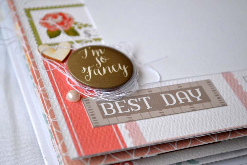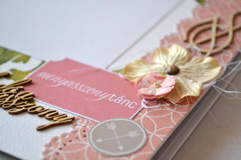 Az albumot végül spirálosan fűztem össze a Cinch-csel, ami valóban egy kincs, és szerintem nagyban megkönnyíti a munkát. A legszebb papírt tettem a borítóra, ezért nagyon nem is díszítettem túl, a chipboard címfeliratot is natúran hagytam, hogy érvényesülni tudjanak rajta a virágok. Sok kedvenc részletem lett az albumban, ezeket igyekszem is megmutatni: