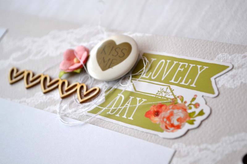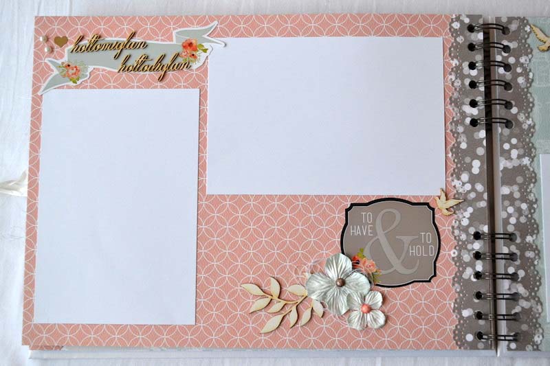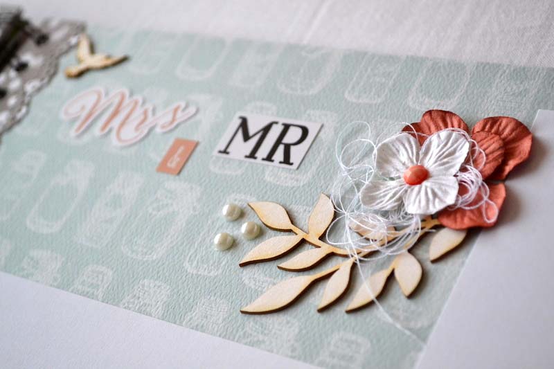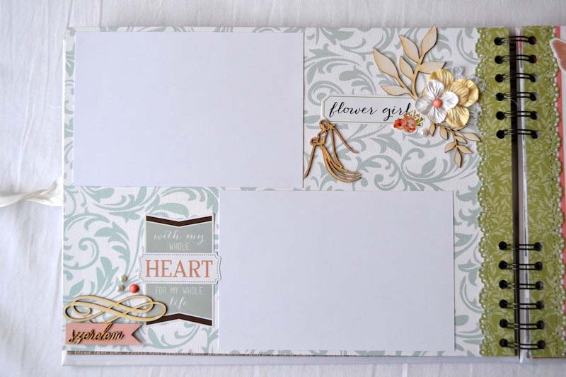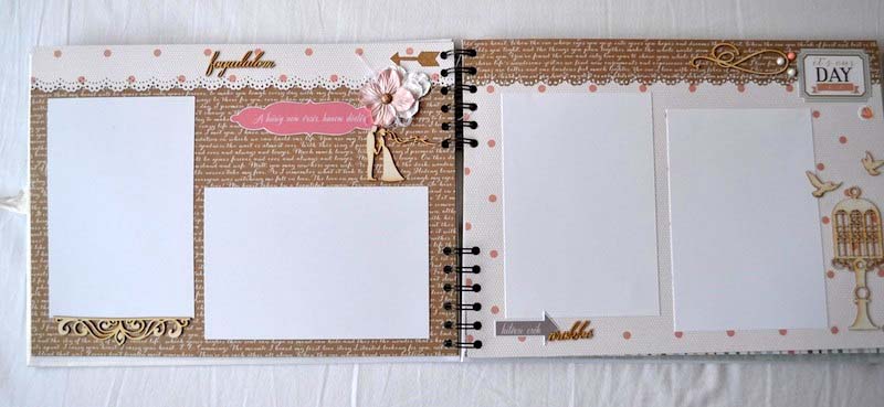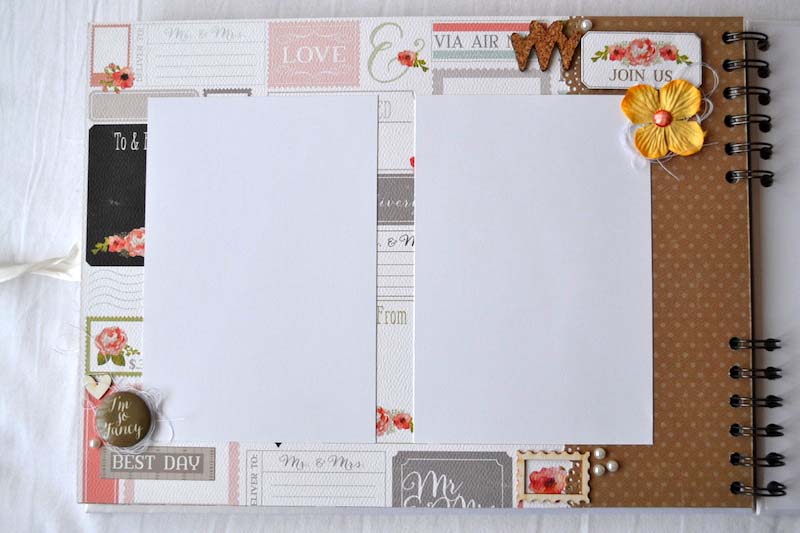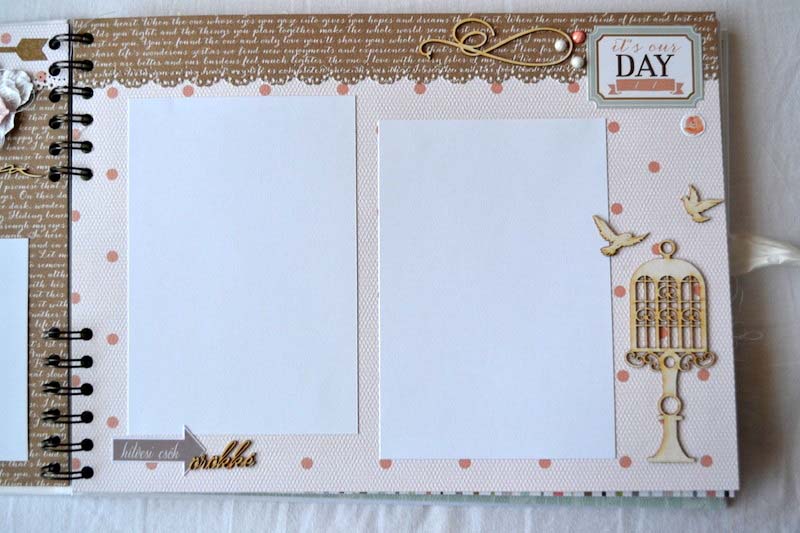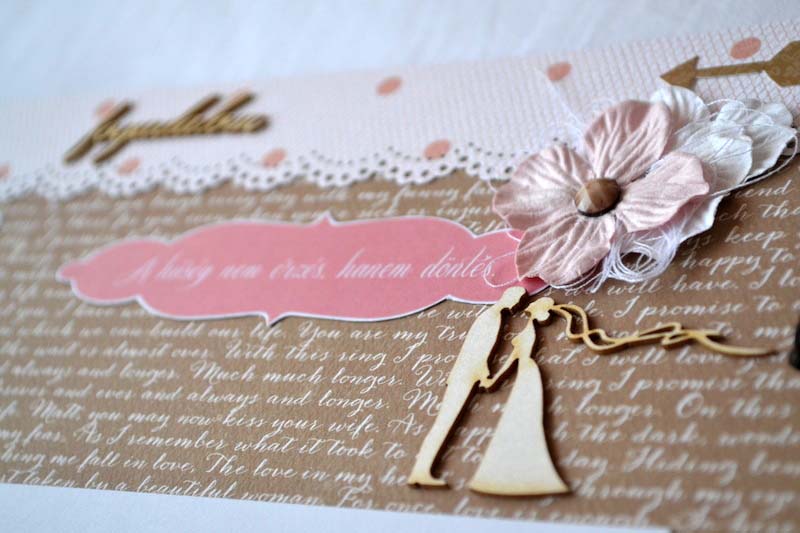 Az alkotás során nagyon megszerettem ezeket a gyönyörű papírokat, amelyek a Carta Bella Rustic elegance papírkészletéből vannak. Imádom a finom mintákat, pasztellszíneket, a virág- és csipkemotívumokat. Az albumba összesen 20 db fotó fér el, és igyekeztem „tematikusan” haladni egy esküvő történéseivel, hogy a legfontosabb pillanatok kapjanak benne helyet. Nagyszerűen fel tudtam használni a NCsD esküvős címkéit, elegáns esküvős chipboardjait és hát, persze a virágokat 🙂 Mindemellett a papírkészlethez tartozó matricákat is beleillesztettem, amelyekkel úgy érzem, egységes lett az album, de mégis különbözőek az egyes oldalak. Mivel nincsenek fényképek benne, ezért úgy gondoltam, hogy fehér alapkartonnal jelzem a fotók helyét, így a díszítőelemekkel is talán könnyebb volt a munka, és azok elhelyezése.