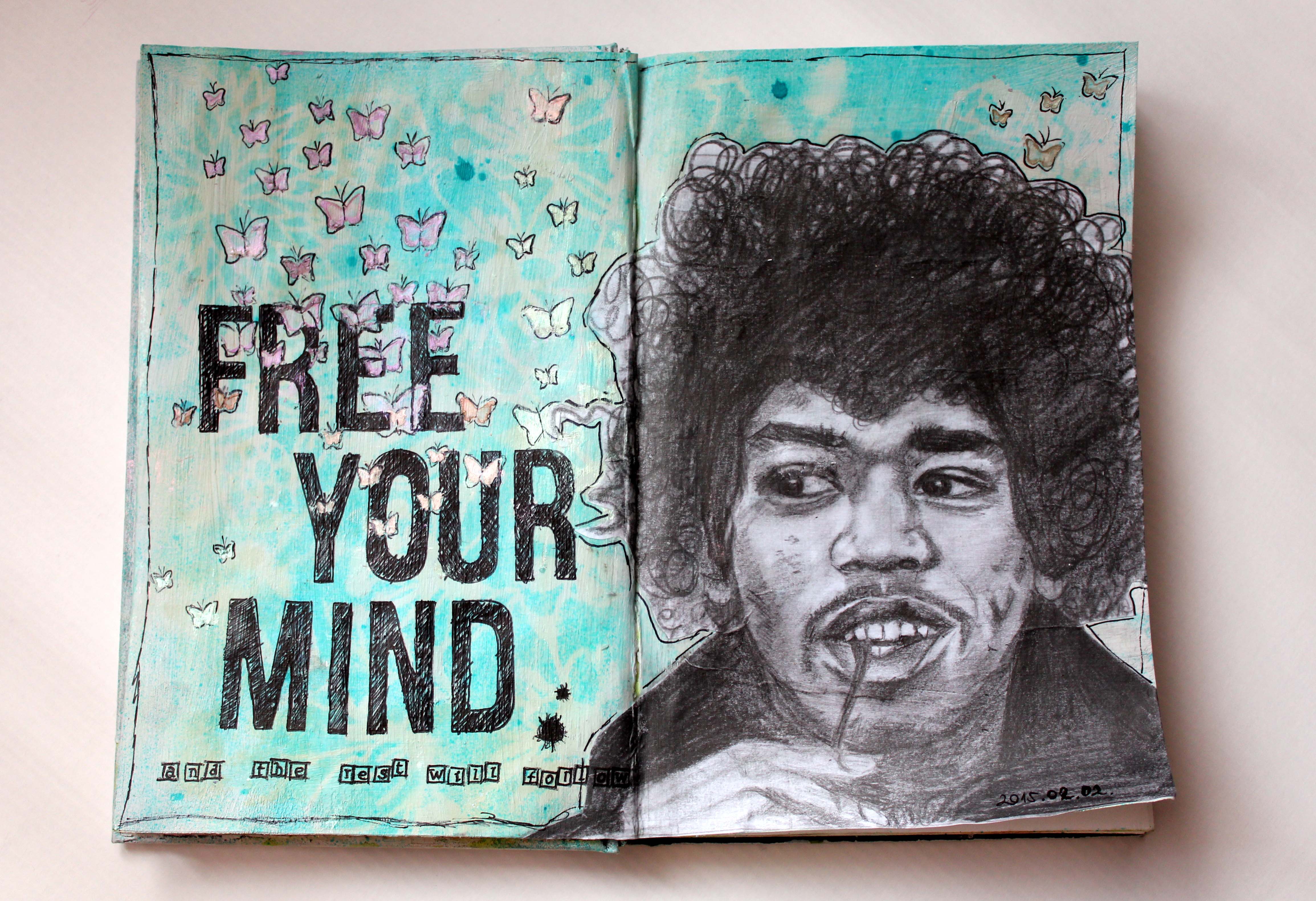Ez az oldal pl. úgy indult, hogy a jobb agyféltekés rajz tanfolyam után szerettem volna gyakorolni kicsit, és elkezdtem lerajzolni Jimi Hendrixet…Aztán gondoltam csak kéne valamit kezdeni az elkészült rajzzal, ne kallódjon már csak úgy a lakásban….Ahogy azon tűnödtem hol lenne a legjobb helye, már kezdett is összeállni a kép a fejemben, és már kezdtem is az újabb oldalt a naplómban 🙂
