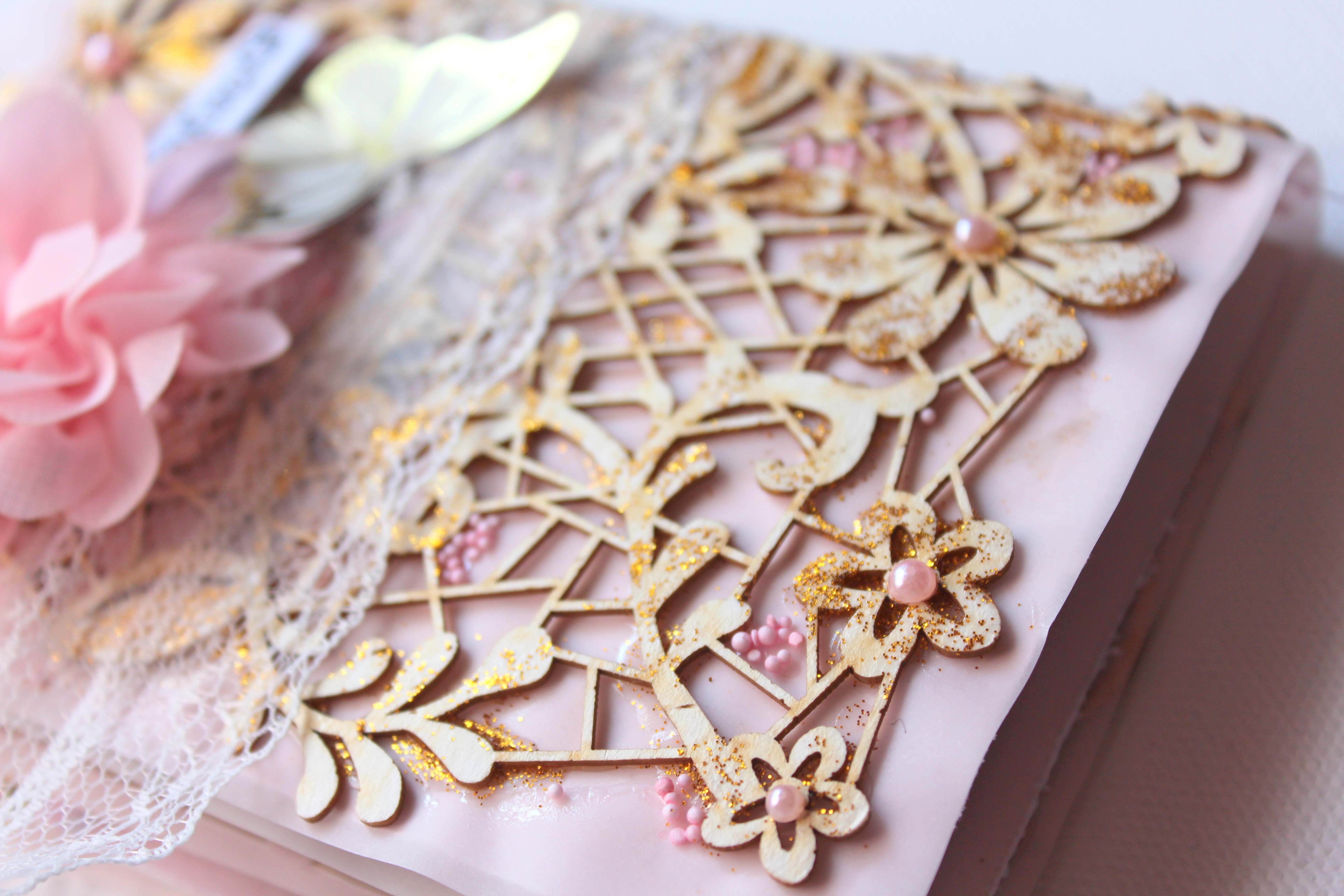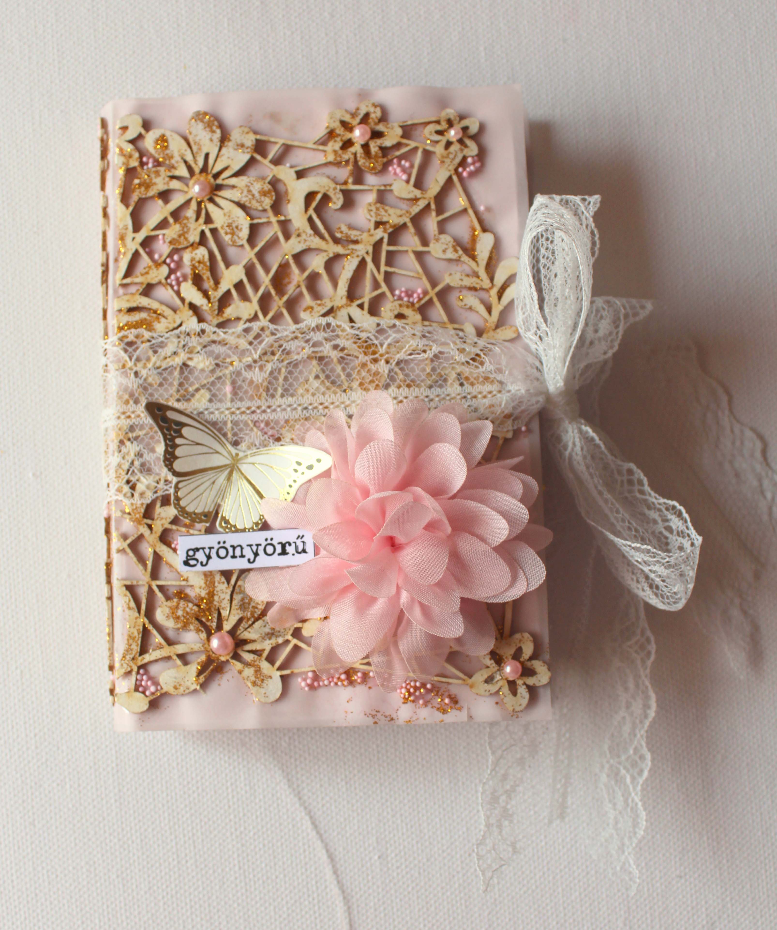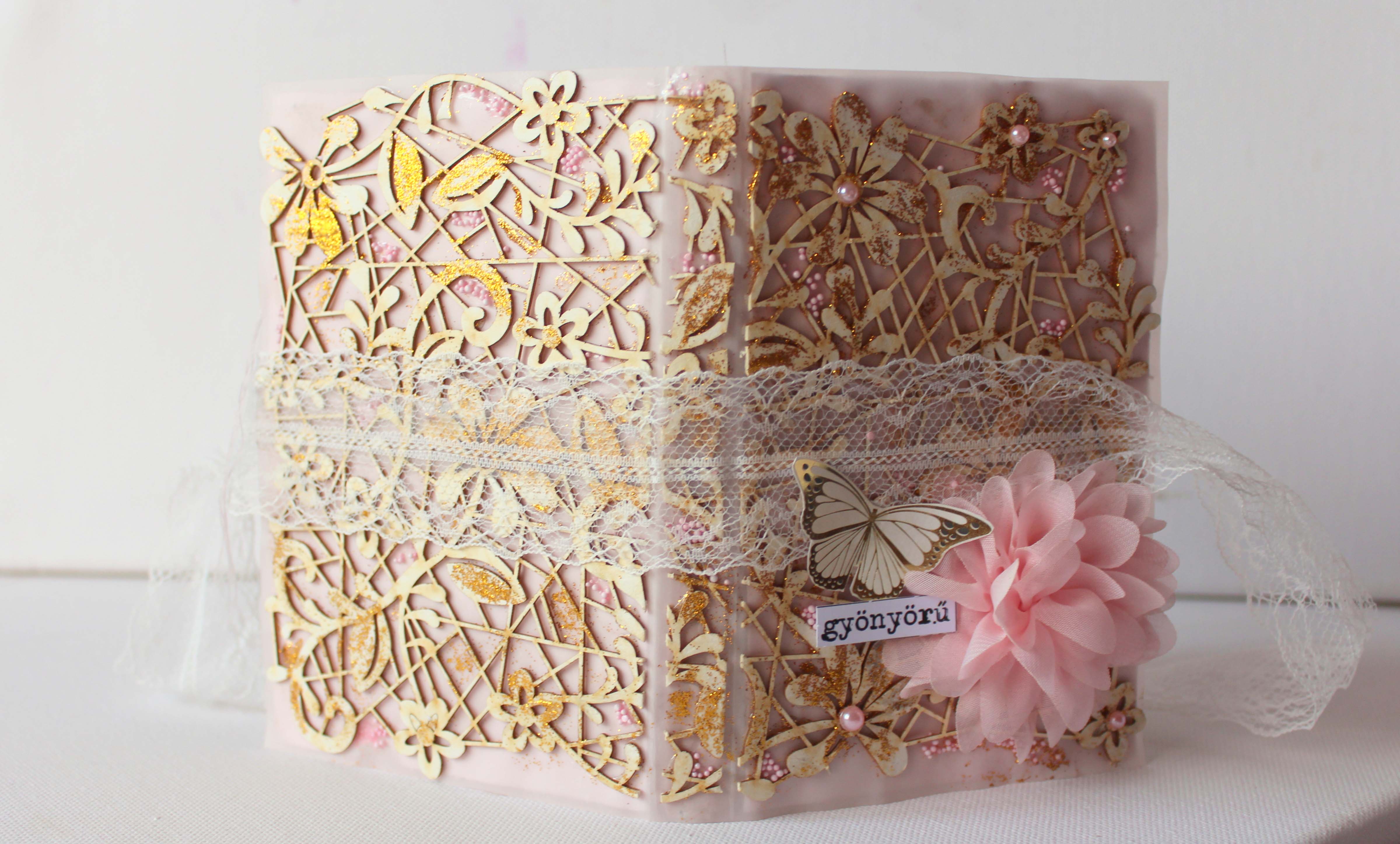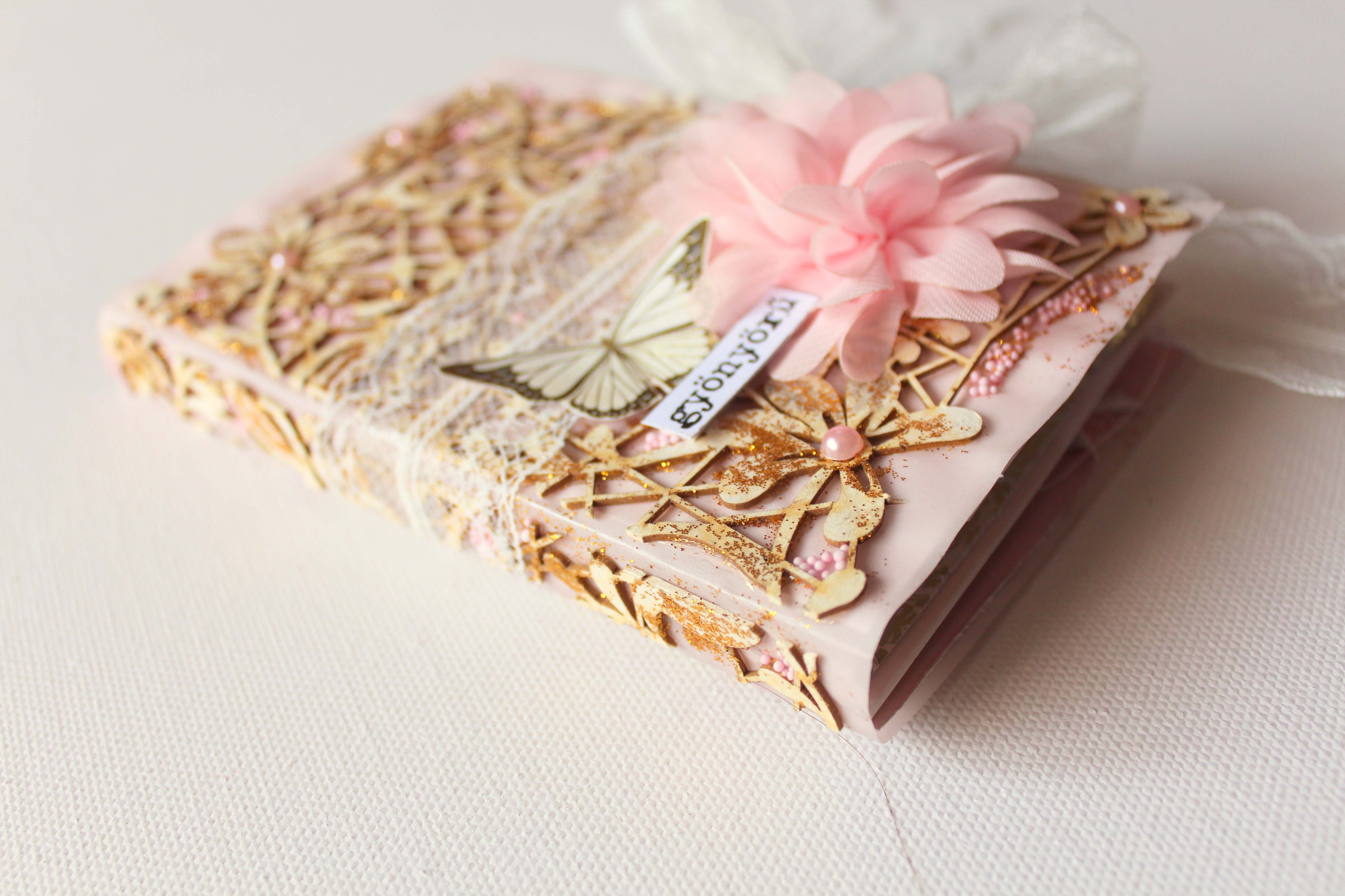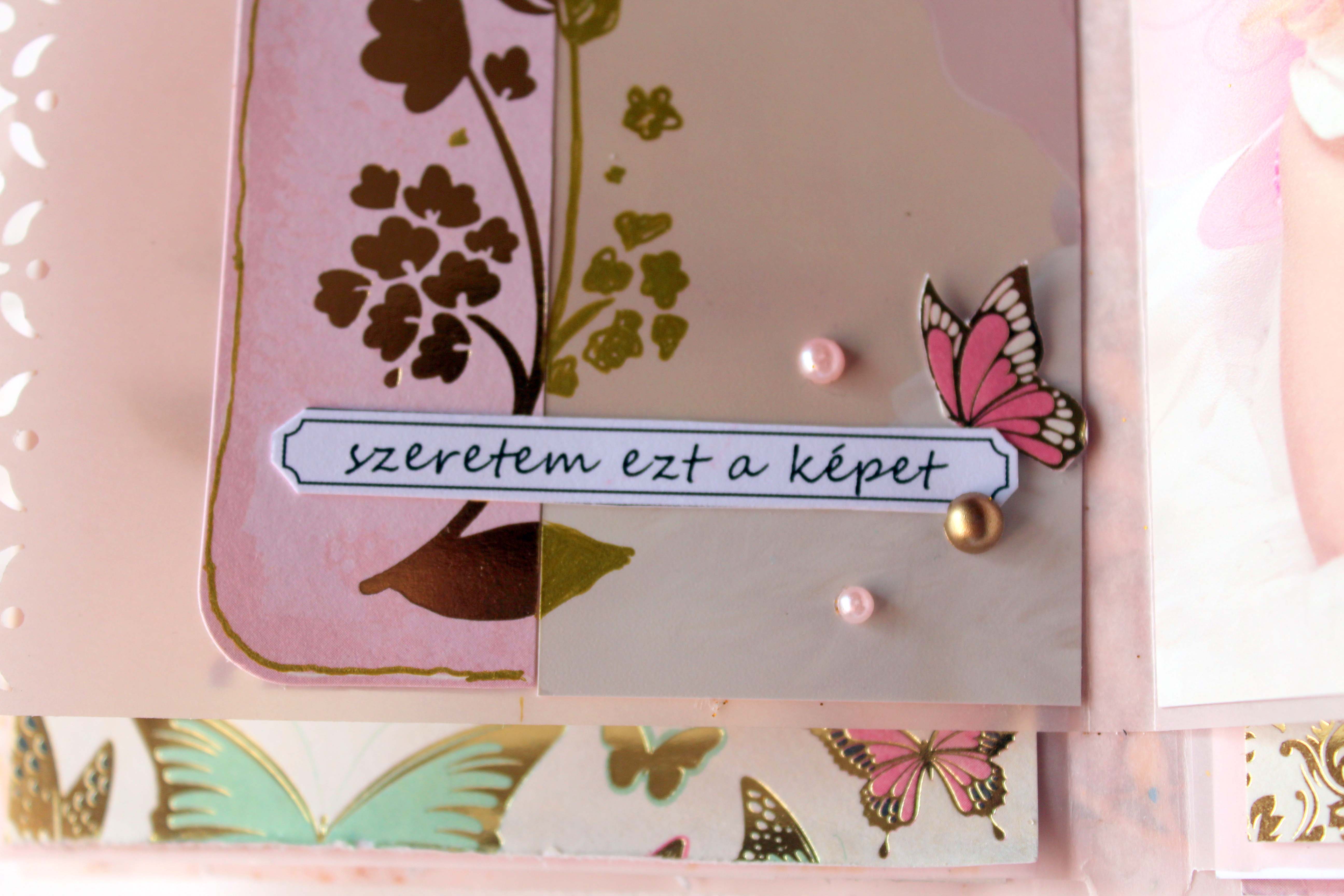 Hogy az albumot különlegessé tegyem, pauszra dolgoztam, azaz az egész album alapja a rózsaszín pauszpapír. 🙂 A borítót pedig egy virágos backgrounddal dobtam fel. Mivel a pauszra elég nehéz úgy ragasztani, hogy ne folyjon ki a ragasztó sehol, igyekeztem a hibából előnyt kovácsolni, és ahol kifolyt, ott csillámport, és pici rózsaszín gyöngyöcskéket szórtam a ragasztóba. Ezután már nem is kívánkozott sok díszítés, egy jó nagy selyem virág, meg némi csipke. 🙂