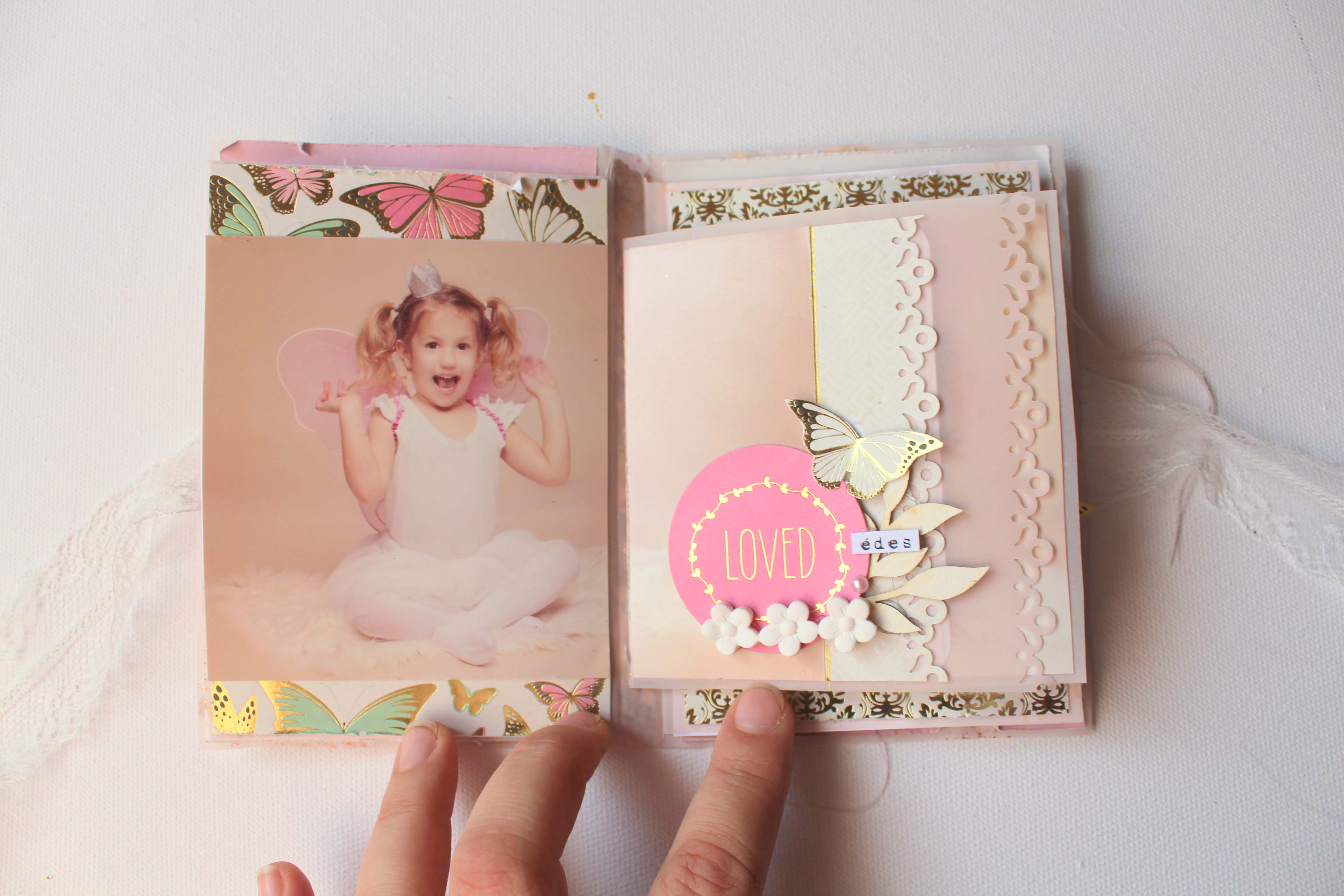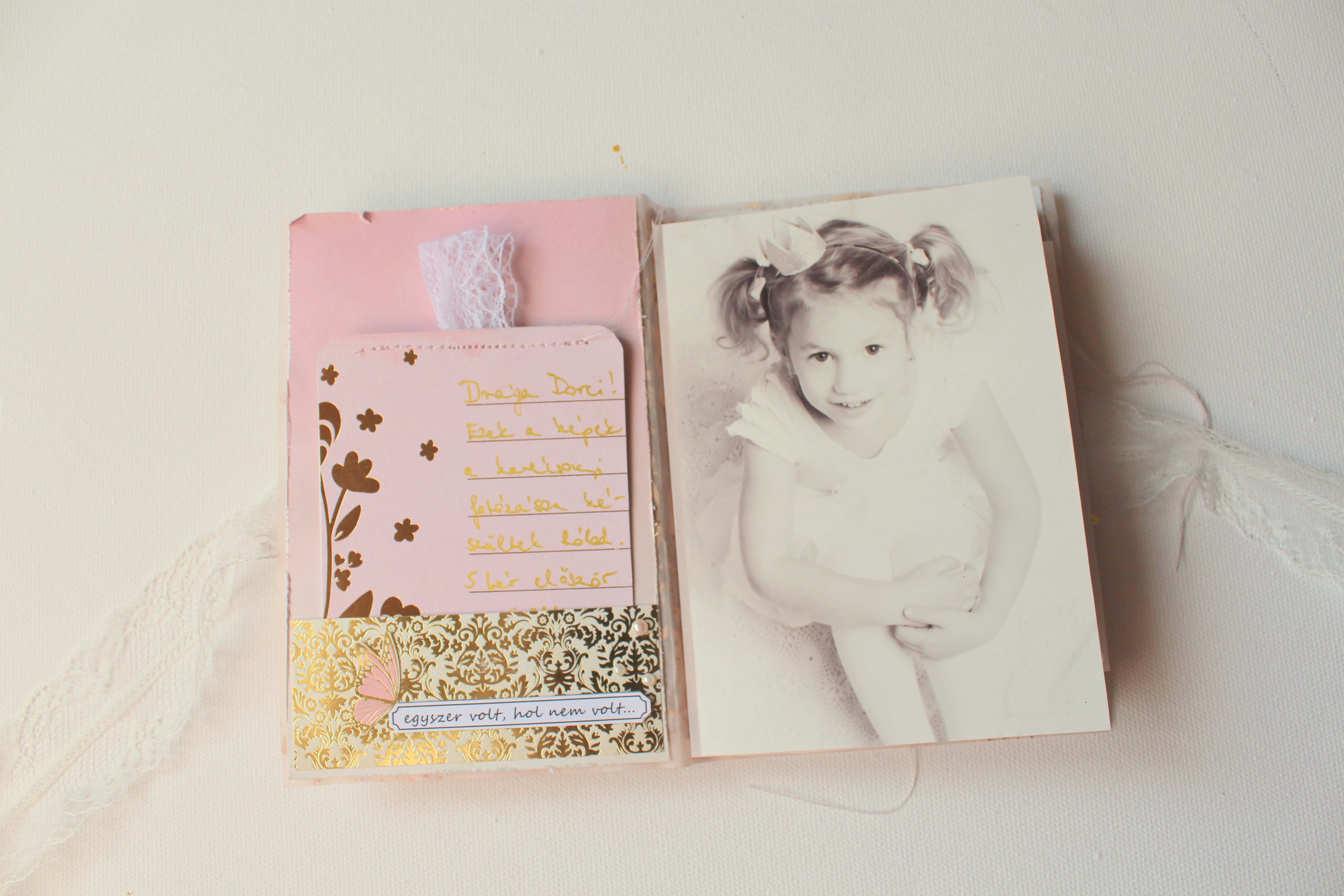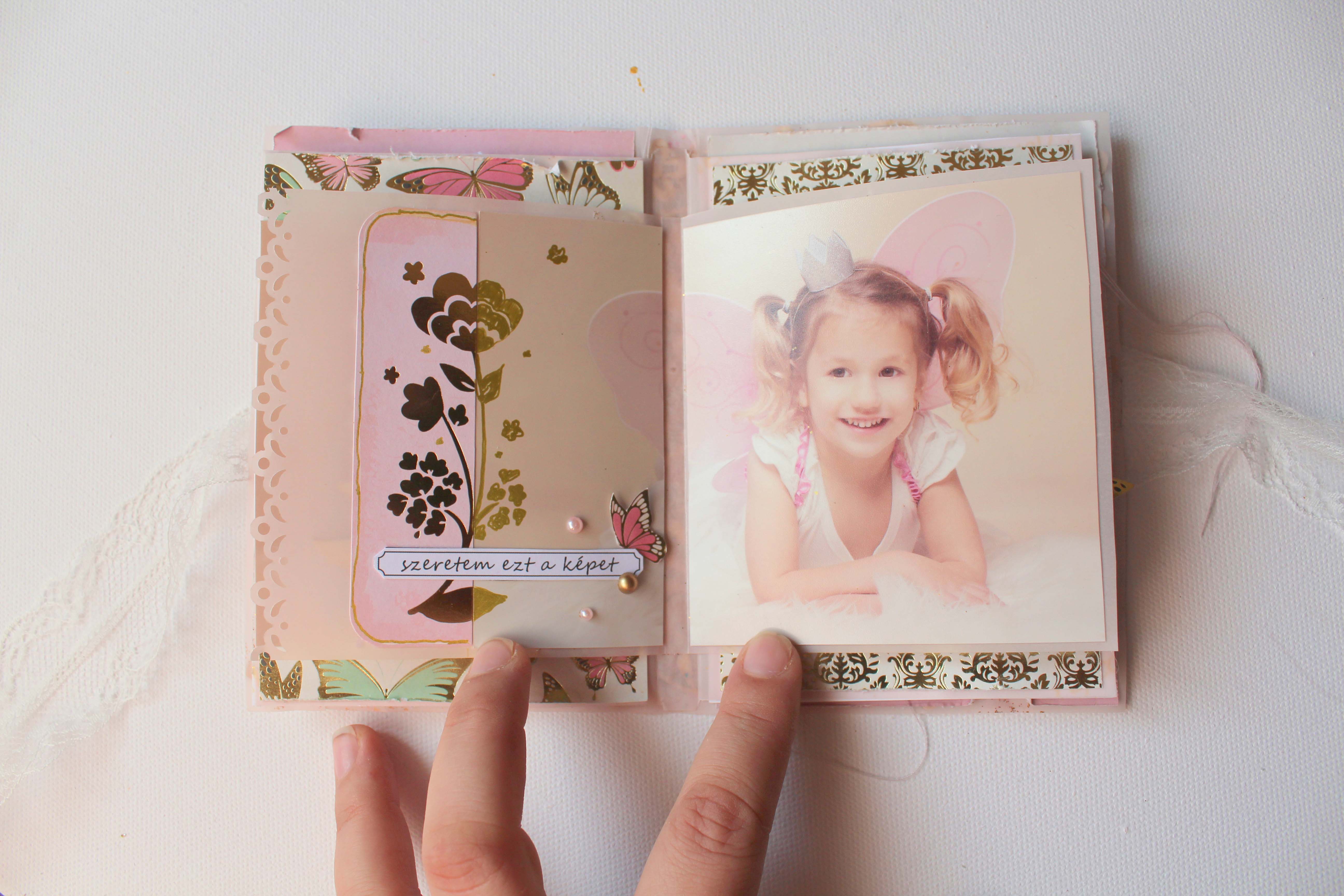 Volt pár képem Dorciról, amik a karácsonyi családi fotózáson készültek, és annyira édes rajtuk, hogy minialbumba kívánkoztak. 🙂 Mivel a képek nagyon finomak, nagyon királylányosak, épp ilyen albumot képzeltem. A Juli által megálmodott anyák napi készlet éppen tökéletes választásnak bizonyult az elképzelésemhez. 🙂 Az albumkötéshez is a workshopon tanultakat használtam fel, az album borítójához és belsejéhez viszont már elrugaszkodtam a Juli által elképzelttől. 🙂