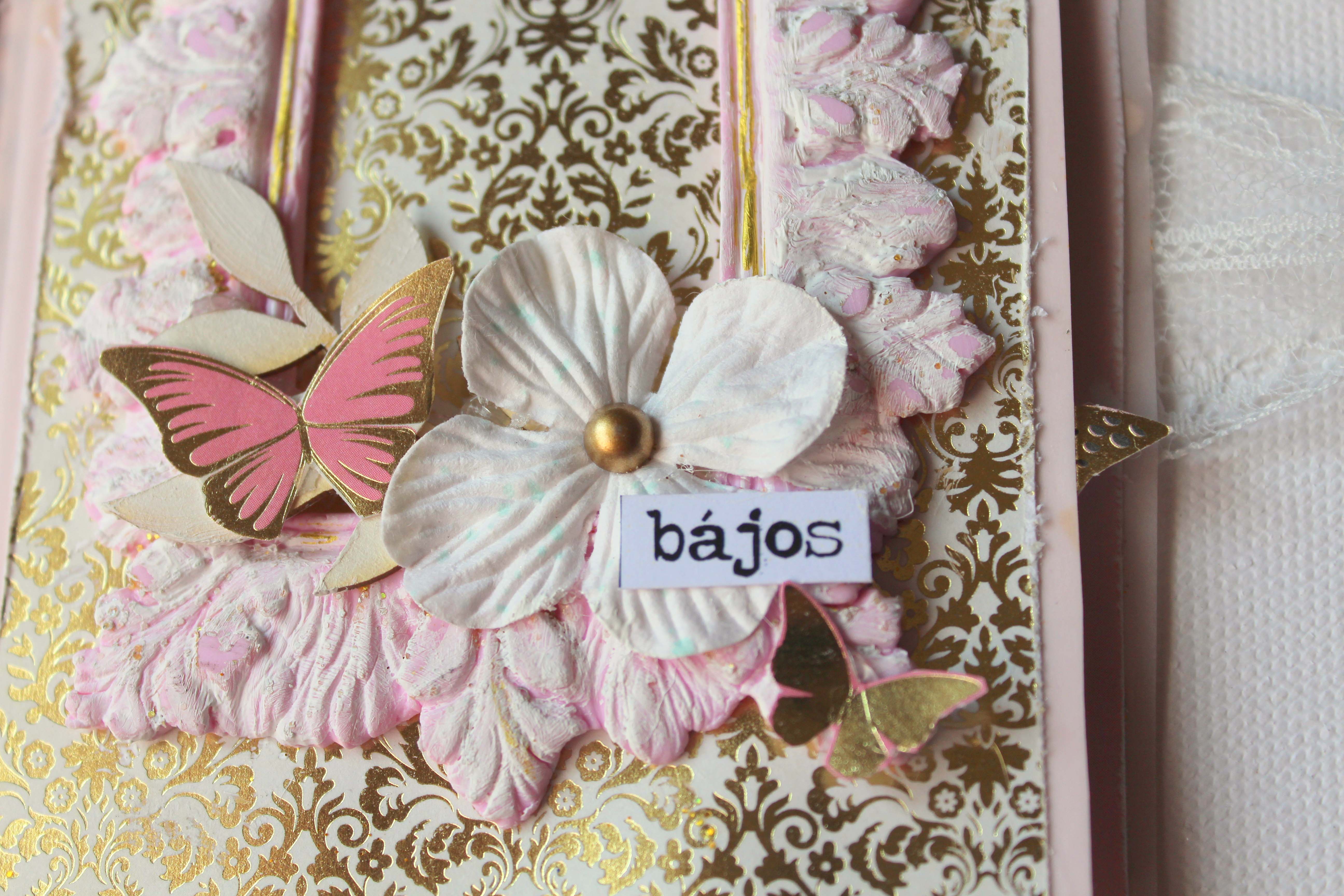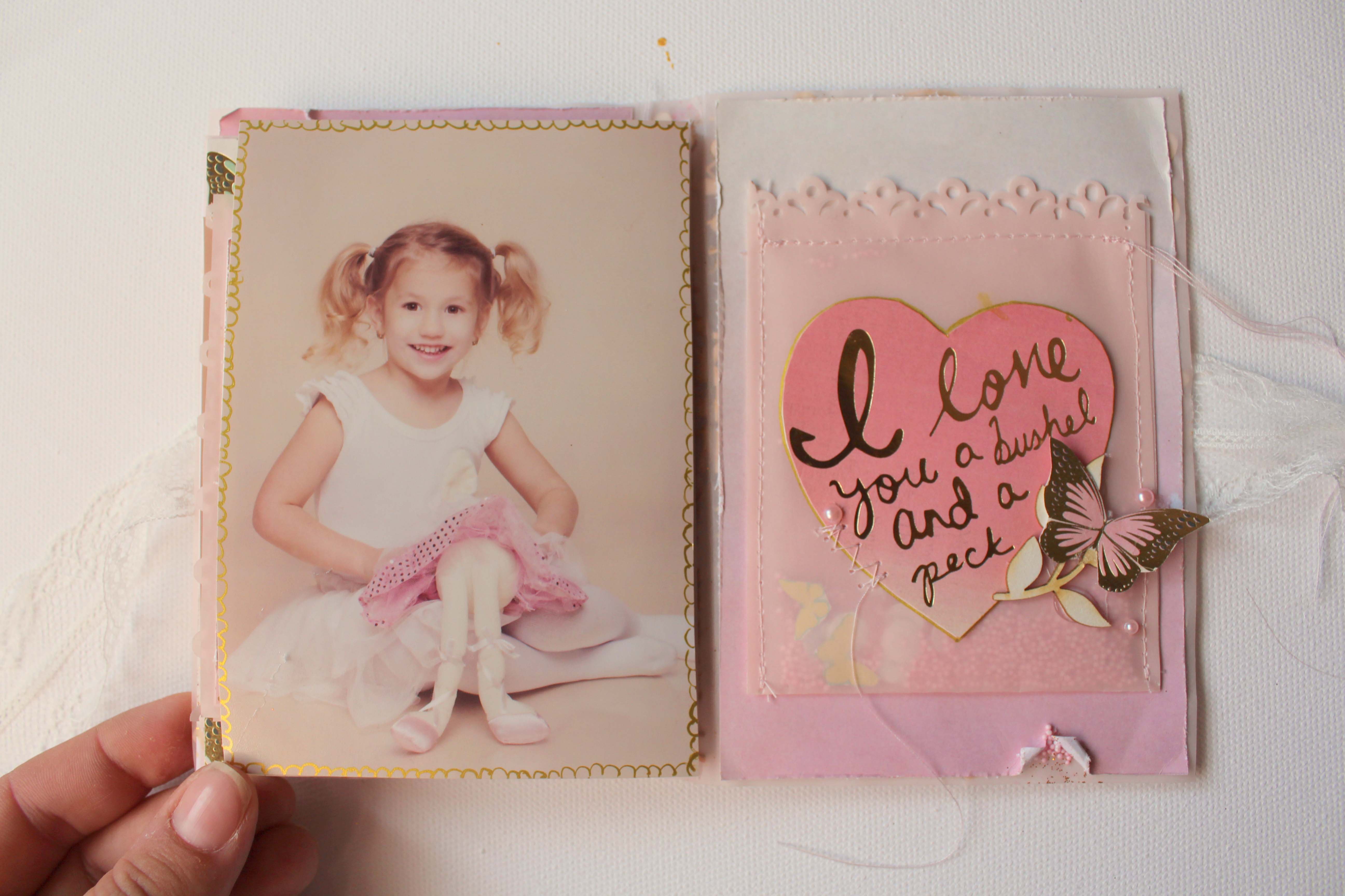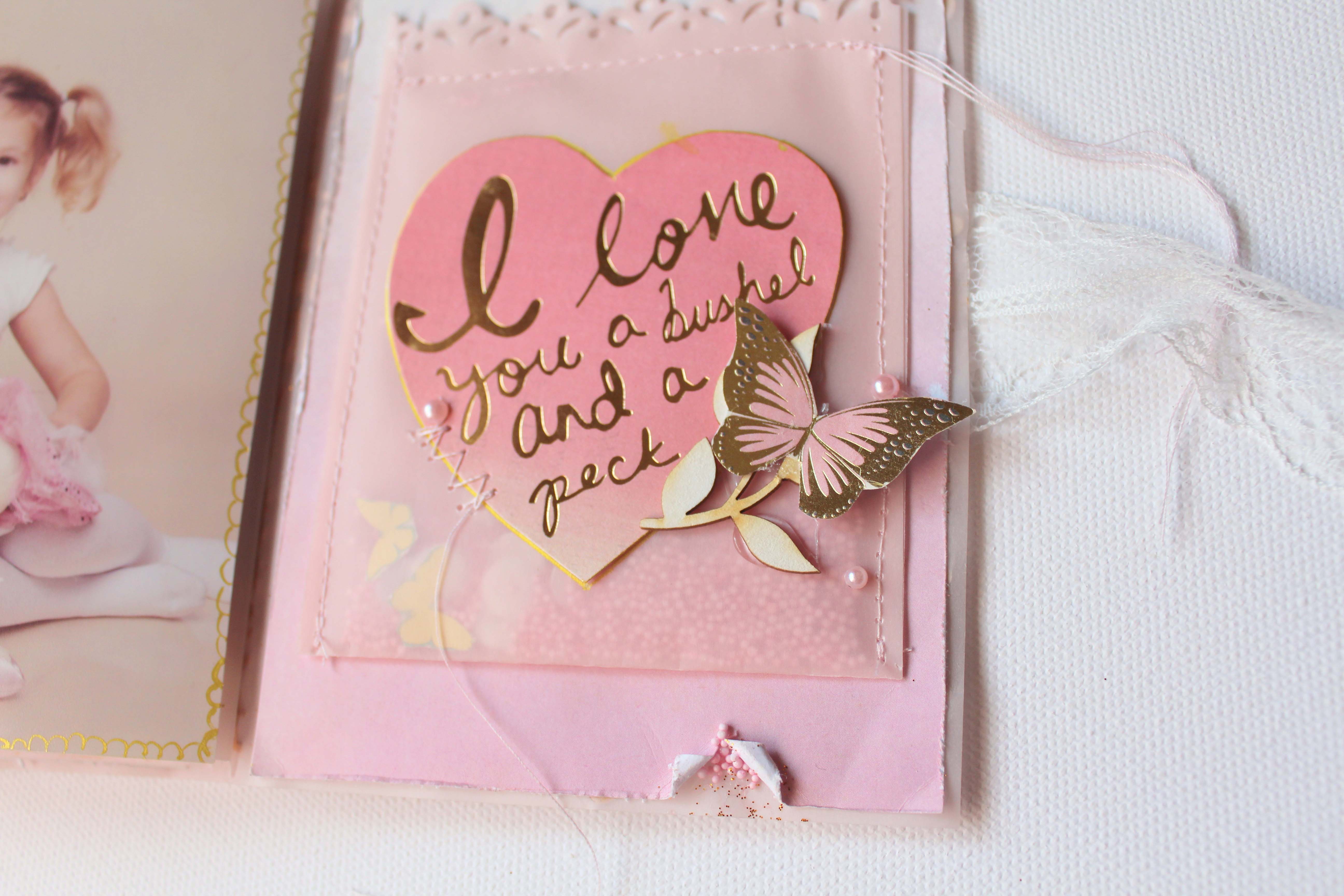 Volt pár képem Dorciról, amik a karácsonyi családi fotózáson készültek, és annyira édes rajtuk, hogy minialbumba kívánkoztak. 🙂 Mivel a képek nagyon finomak, nagyon királylányosak, épp ilyen albumot képzeltem. A Juli által megálmodott anyák napi készlet éppen tökéletes választásnak bizonyult az elképzelésemhez. 🙂 Az albumkötéshez is a workshopon tanultakat használtam fel, az album borítójához és belsejéhez viszont már elrugaszkodtam a Juli által elképzelttől. 🙂