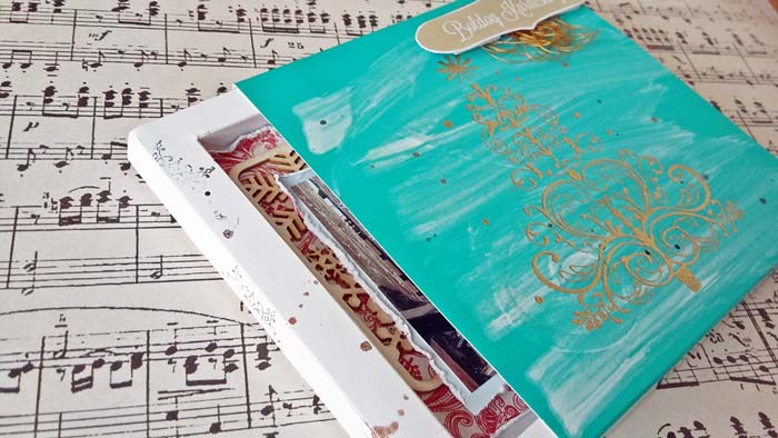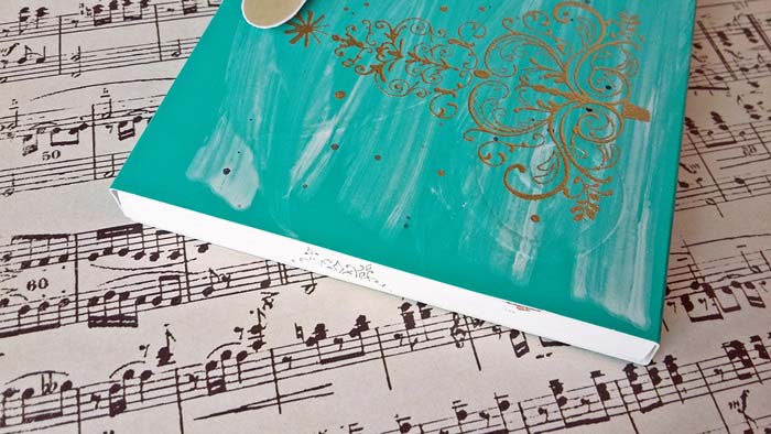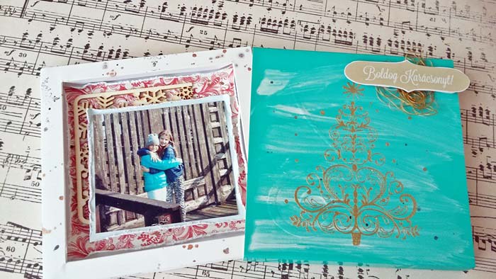 Ki másról kerülhetne vajon fotó a Harrer-kék dobozba, mint a majdnem Harrer-kék dzsekis Tamaráról és Borcsiról, amint átölelve tartják egymást a fertőrákosi mólón? Egyébként tényleg mini projekt, a dobozt kívül-belül átpacsmagoltam gesso-val, megfröcsköltem fekete és bronz festékkel, doboz a tetejére hődomborítottam egy karácsonyfát, belül pedig ott a kép. NCSD kiegészítők, fél óra alatt tenyérnyi kis ajándék.