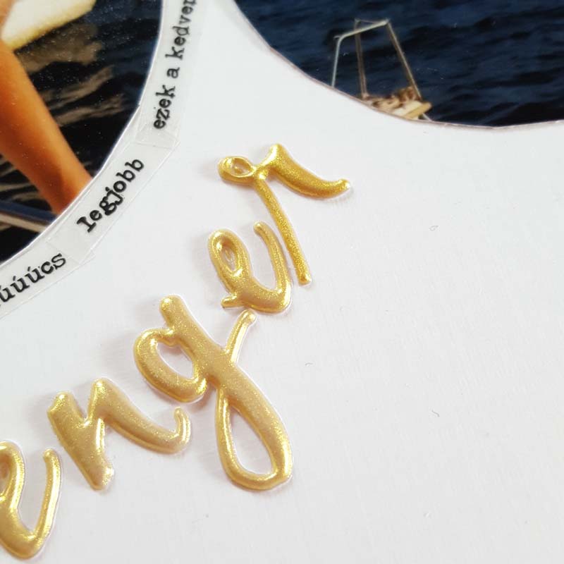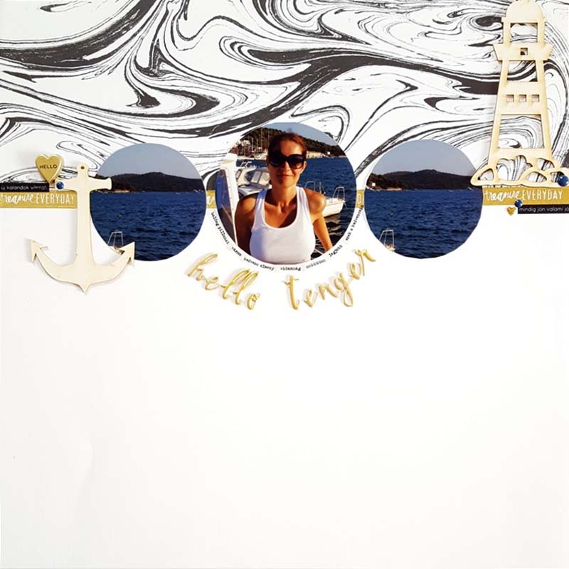 Az elrendezésben végül egy egyszerű megoldást választottam: a felső harmadra mintás papírt ragasztottam, a képeket pedig kör alakúra vágtam (kézzel, ezért hagy is némi kivetnivalót maga után…). A horizontot a két papír találkozásához igazítottam. Dekortapasszal és matricákkal erősítettem meg ezt a vonalat. Kétoldalra egy-egy tengerhez kapcsolódó chipboard került. A Krisztát ábrázoló fényképet átlátszó matricákkal kereteztem – ezzel helyettesítettem most a kommentet. Betűmatricákból kiraktam a címet, és enamel pöttyökkel díszítettem még az oldalt.