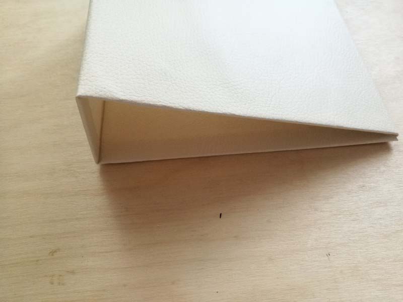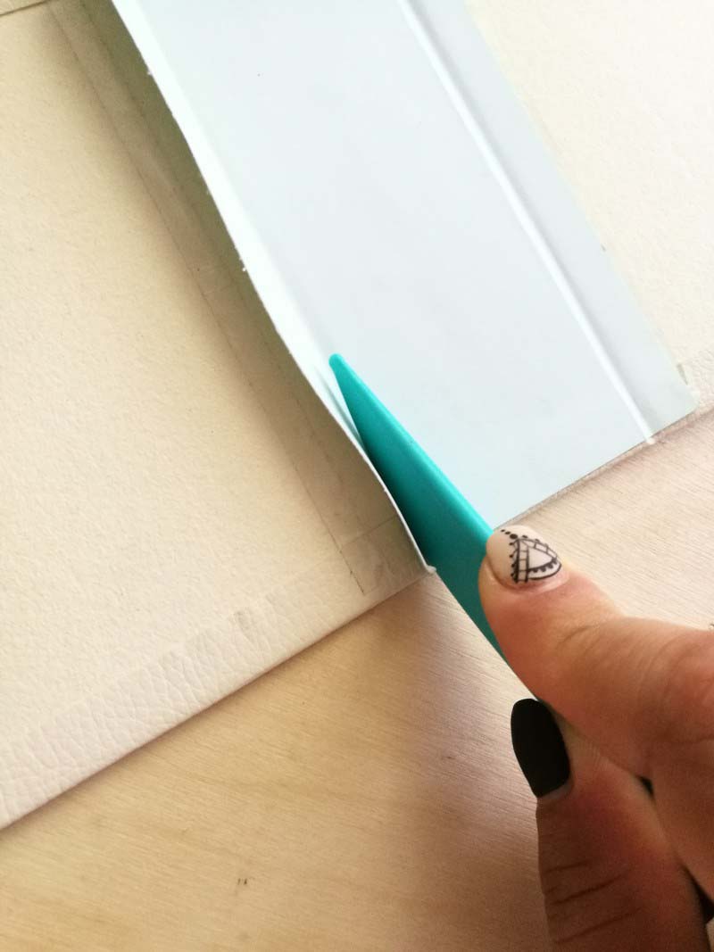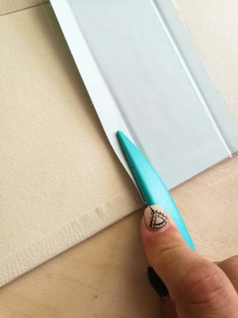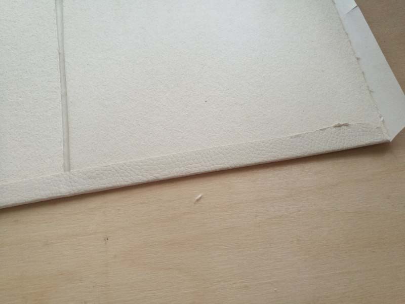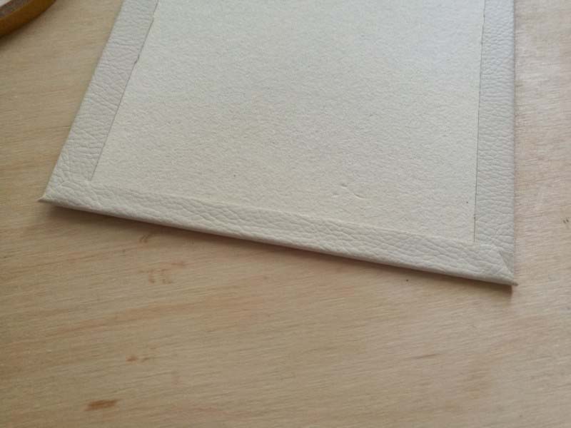 2. Vágjuk le a sarkokat ívesen! Aztán tegyünk ragasztót körbe a sörkartonra, majd hajtsuk rá a ragasztóra a széleken a könyvkötő bőrt!