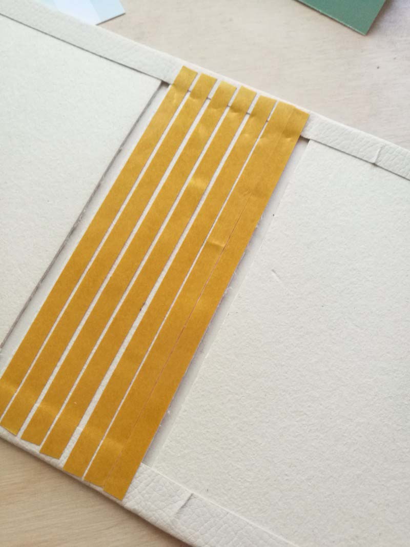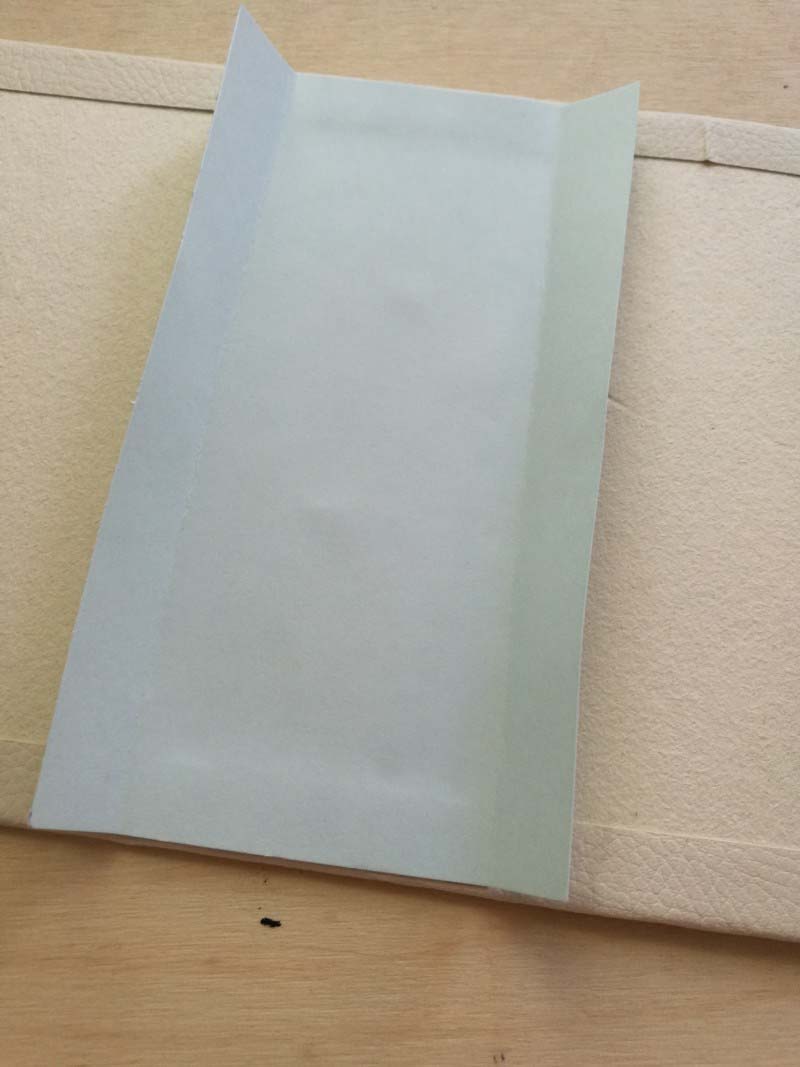 3. Jöhetnek a belső borítók. Először a gerincre ragasszunk vékonyabb, 100-120 gr körüli papírt (akár a nyomtatópapír is megfelel, vagy ha marad a könyvkötő bőrből annyi, lehet azt is használni). A papír méretét a gerincünkhöz igazítsuk, mind két oldalon 2-3 centit ráhagyva.