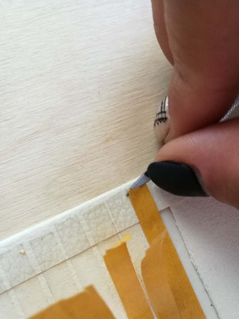 Most jöhetnek a "túllógó" részek. Itt ragasszunk a borítón a papír alá kétoldalas ragasztót, és ezután simítsuk rá a papírt, jó alaposan. A kis mélyesdésbe, ami a gerinc és az album borítója között van, simogassuk bele alaposan a papírt.