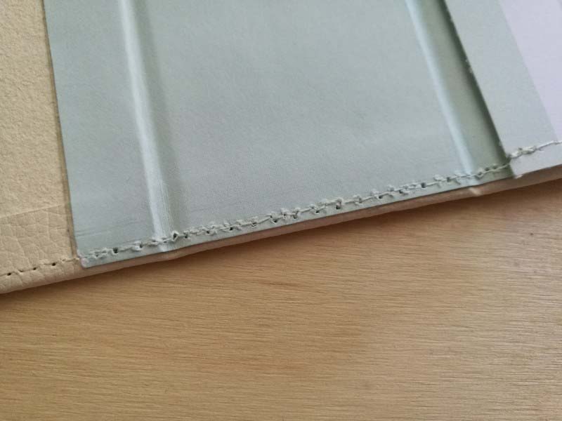 b., Minden papírvarrásnál úgy kell készülni, hogy csak a színe lesz szép, a viszája sajnos nem, ezért az albumot úgy kell a gép alá tenni, hogy a "bőrös fele" legyen felül, és a csupasz sörkarton alul. Mutatom fotón, hogy milyen csúny a viszája.