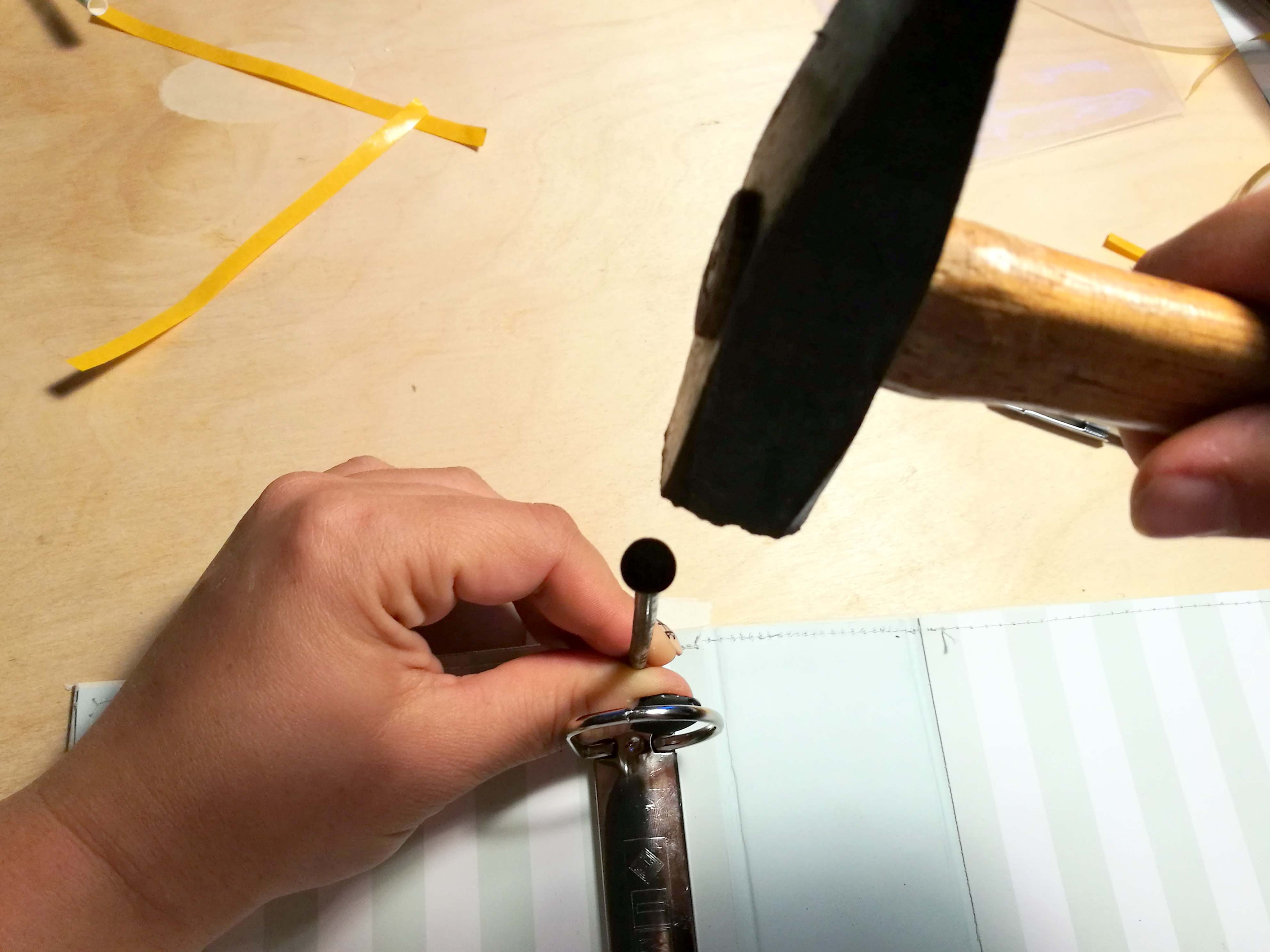 Illesszük az éket, vagy valami kemény tárgyat (esetemben nagy, 100-as szöget) a lyukba, és kalapáccsal erős ütésekkel üssük össze a szegecs két felét, addig üssük, míg tényleg megtartja a bindert.