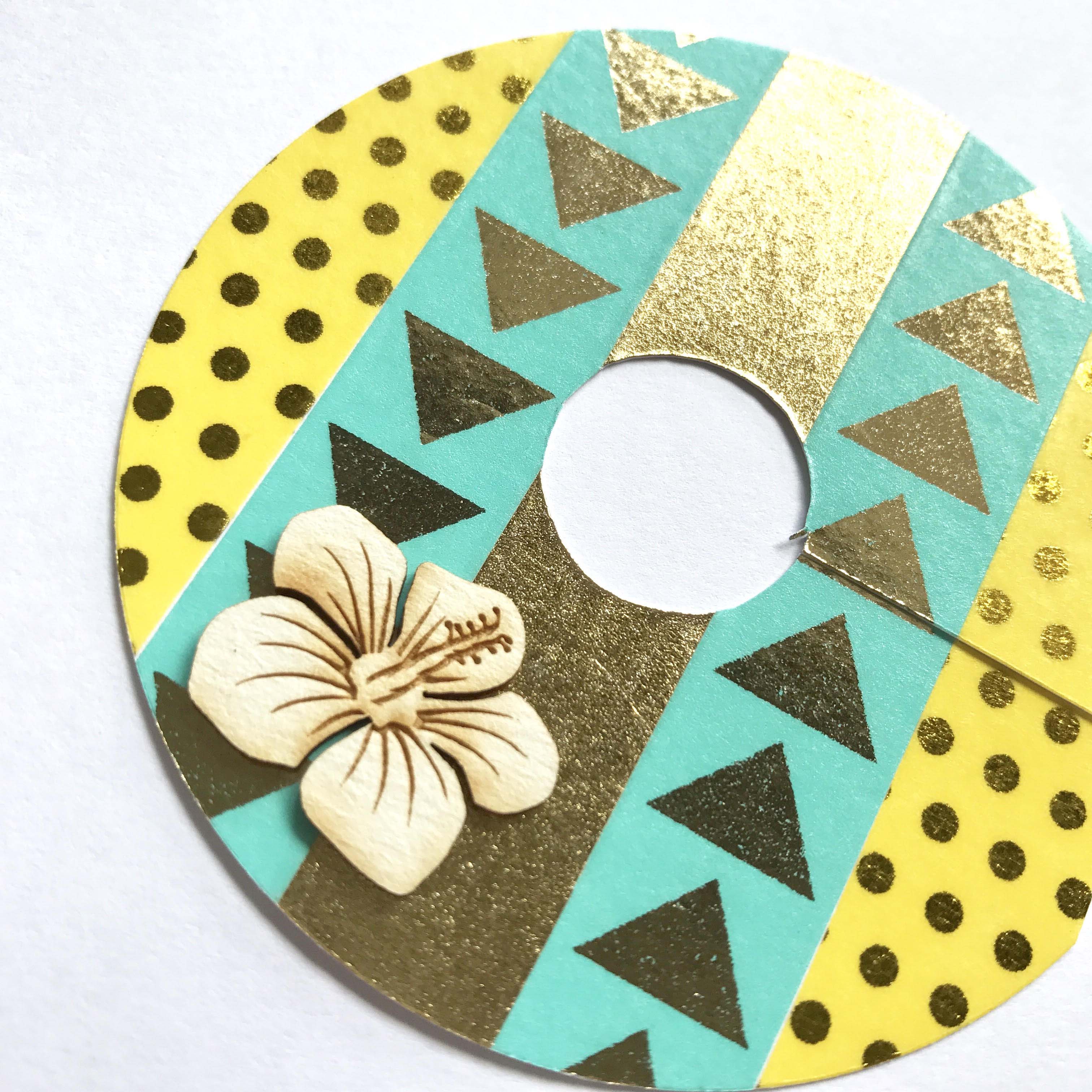 Az egyiket washi tap-ek felhasználásával készítettem. Egymás mellé ragasztgattam a dekorszalagokat, majd kivágtam egy korongot és a közepéig bevágtam. Chipit ragasztottam rá és ezzel kész is az egyik verzió.