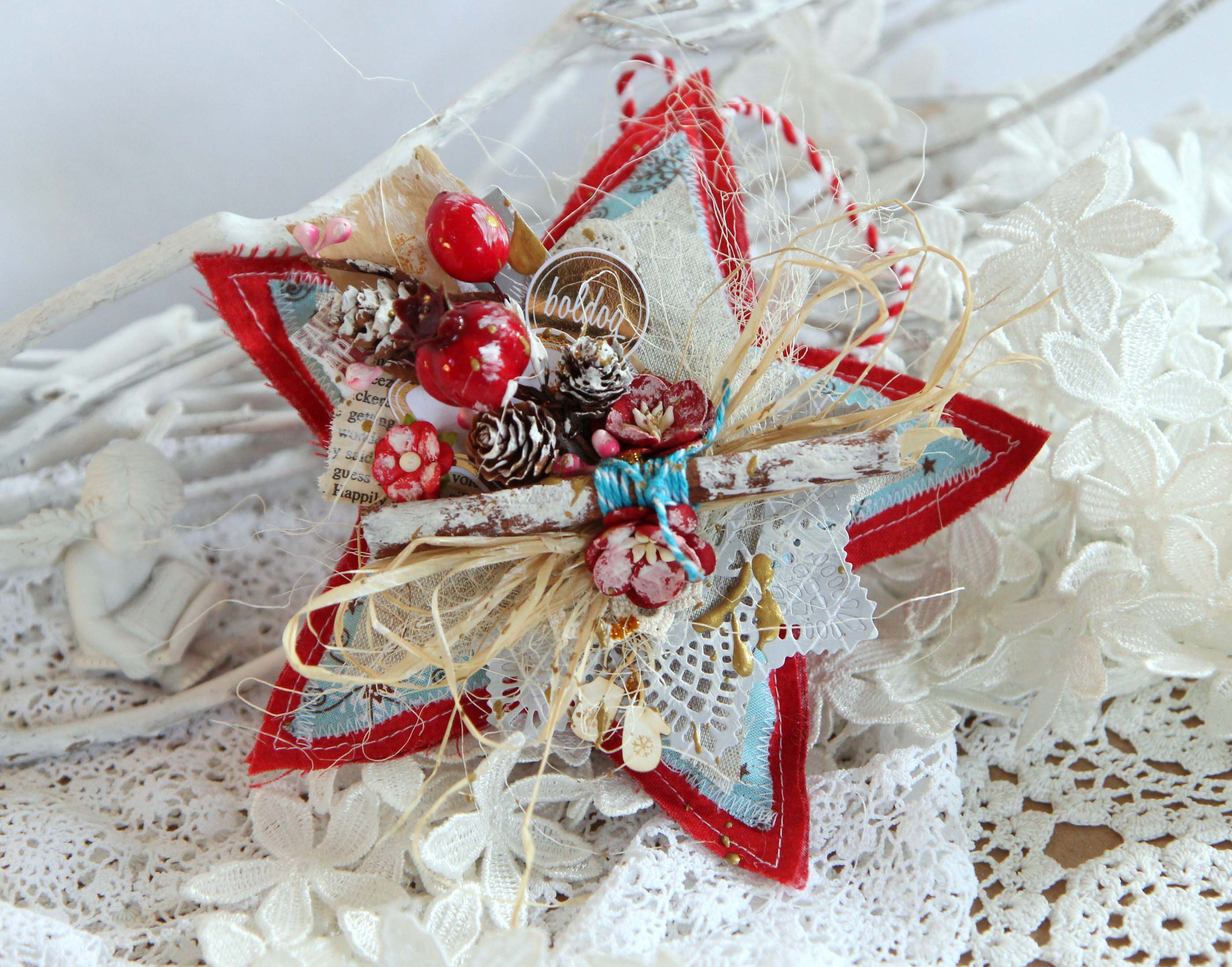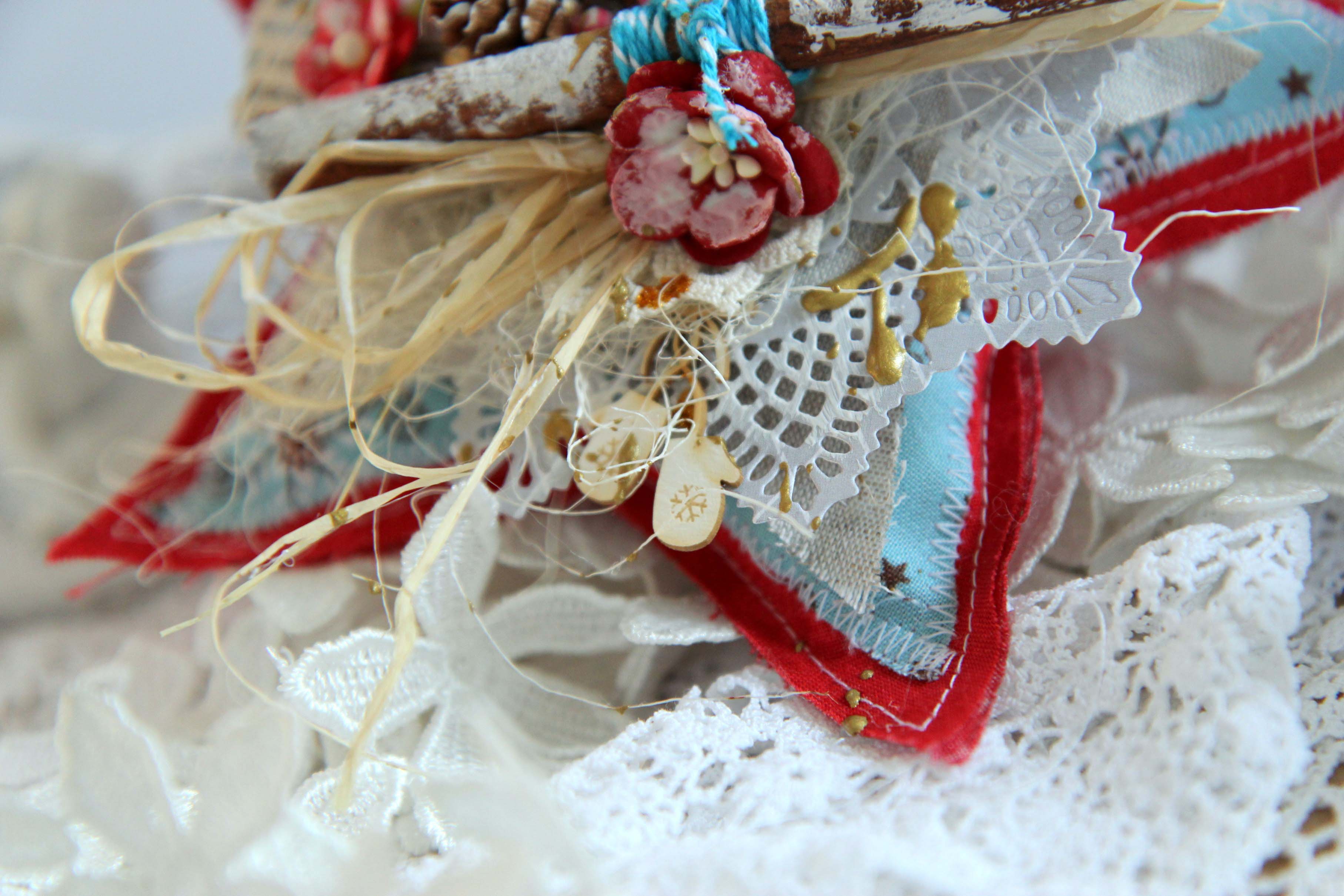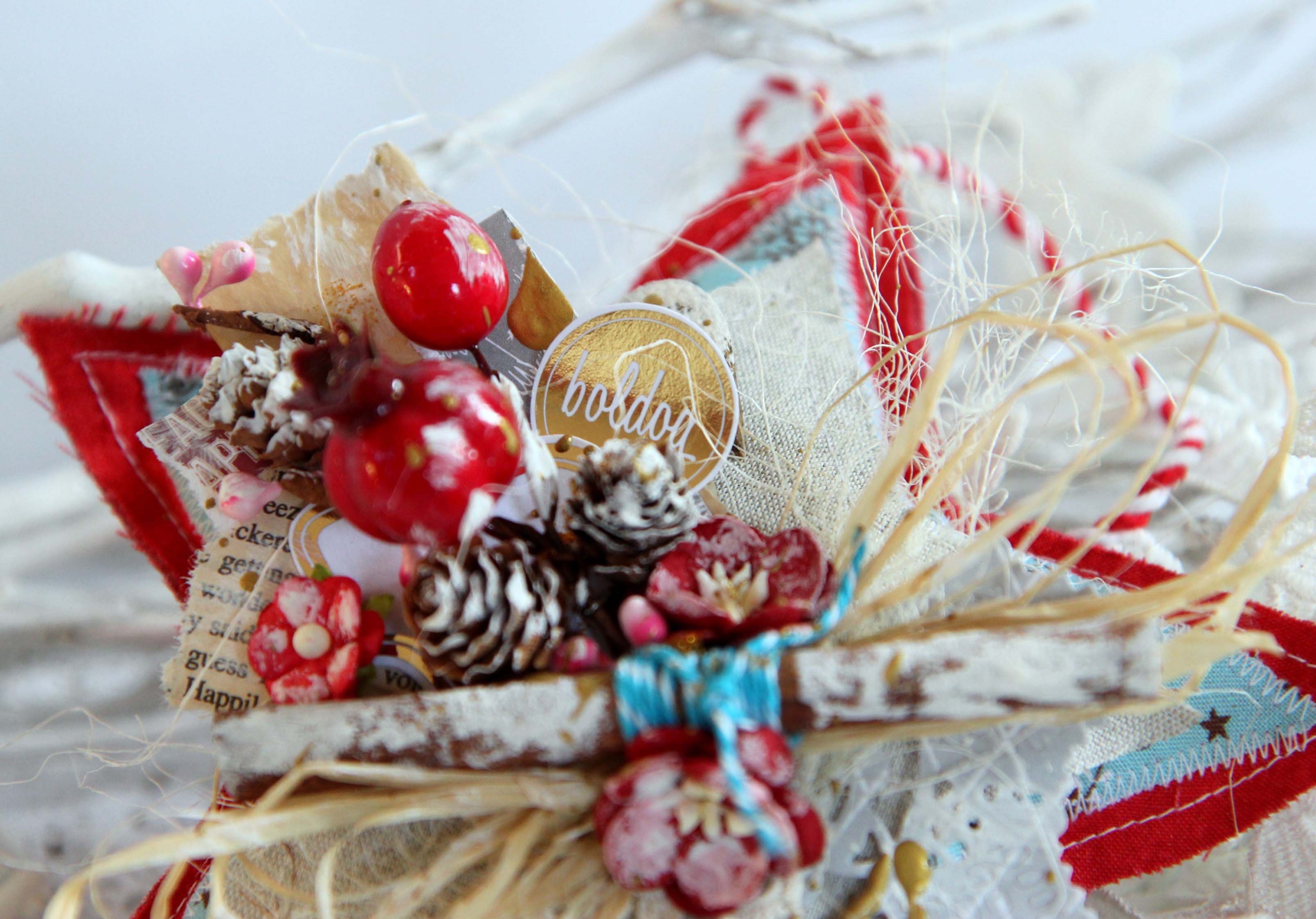 Itt már bármit lehet használni: régi könyv lapokat, fahéj darabkát, szárított narancs darabkát, kis méretű fenyőtobozt, szalagot, szizált, festék, virágokat, chipboardot, címket, etc.